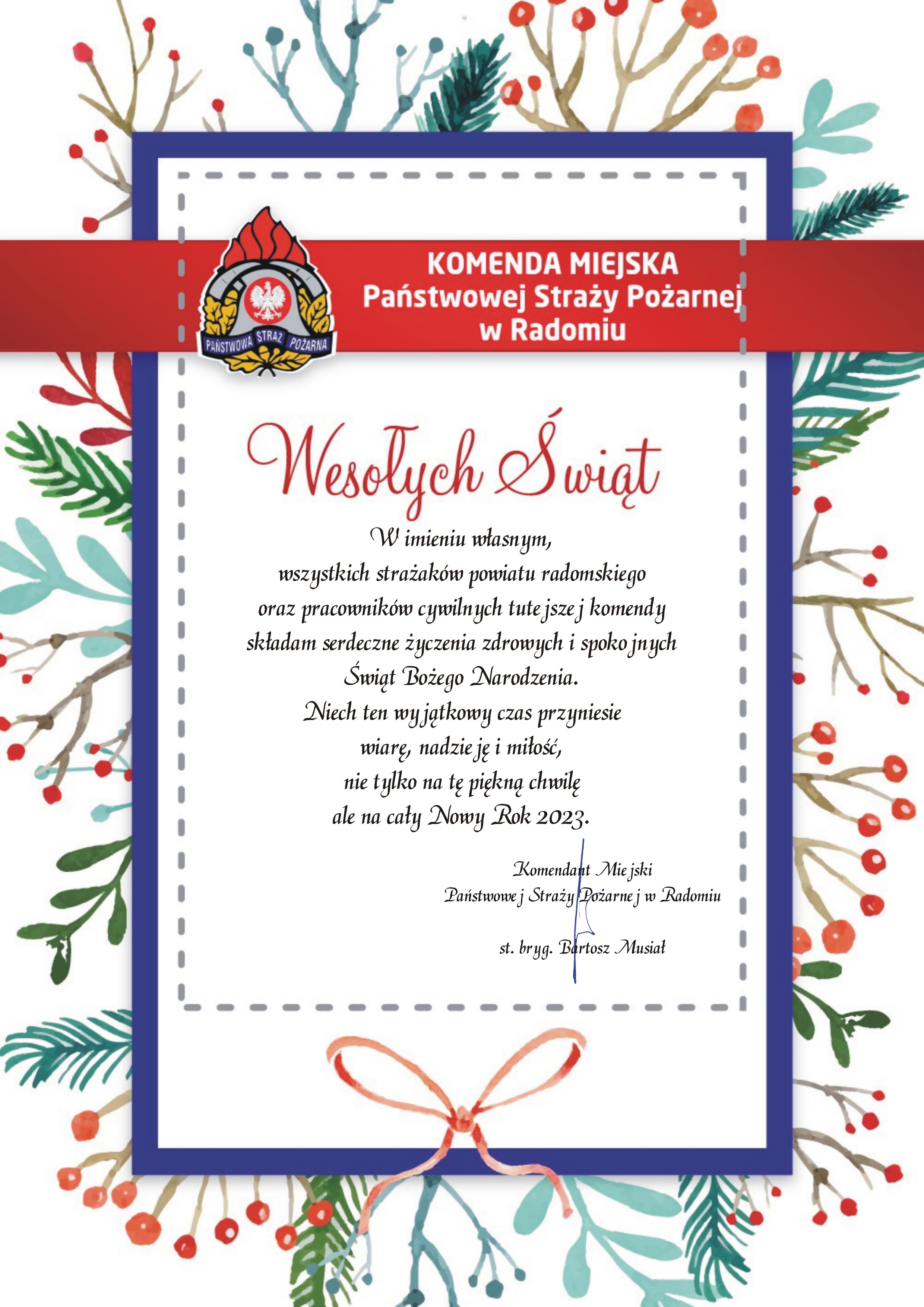 W imieniu własnym i wszystkich strażaków powiatu radomskiego składam serdeczne życzenia zdrowych i spokojnych Świąt Bożego Narodzenia. Niech ten wyjątkowy czas przyniesie wiarę, nadzieję i miłość, nie tylko na tę piękną chwilę ale na cały Nowy Rok 2023.