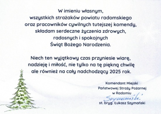 Życzenia Komendanta Miejskiego Państwowej Straży Pożarnej w Radomiu na Boże Narodzenie i Nowy 2025 Rok 24.12.2024 Zdjęcia (1) Pokaż zdjęcie 1 z galerii.