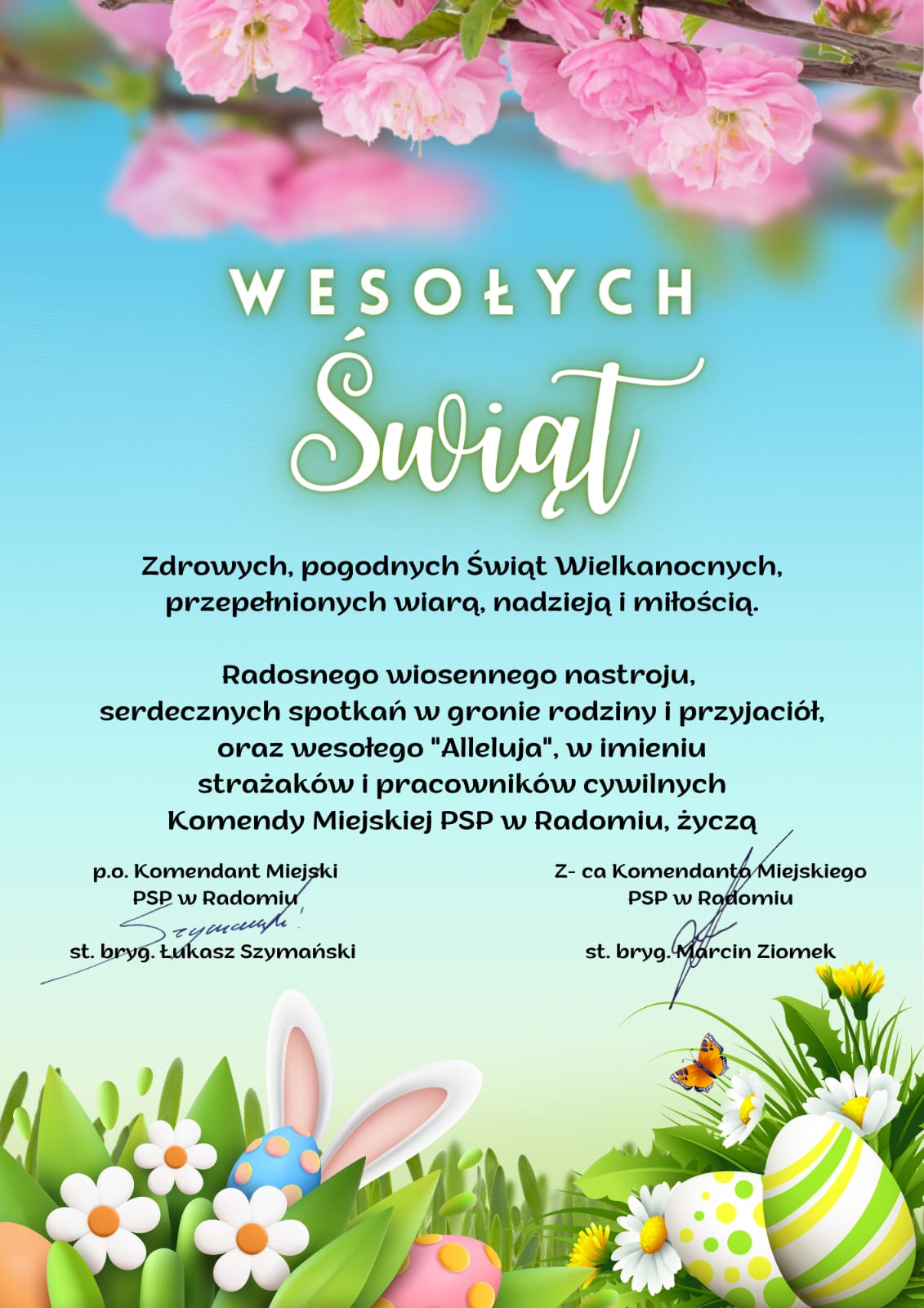 Radosnego, wiosennego nastroju, serdecznych spotkań w gronie rodziny i przyjaciół oraz wesołego "Alleluja", w imieniu strażaków i pracowników cywilnych Komendy Miejskiej PSP w Radomiu życzą