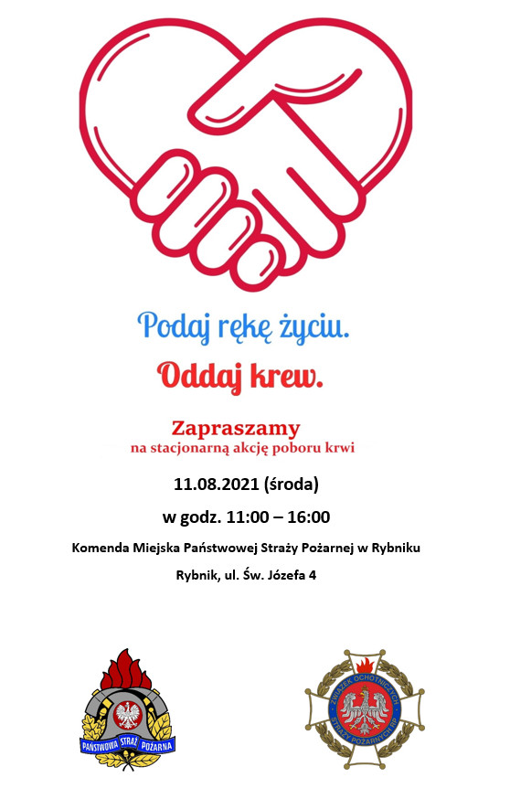 Rybniccy strażacy wspólnie z Regionalnym Centrum Krwiodawstwa i Krwiolecznictwa w Raciborzu zapraszają na stacjonarną akcję poboru krwi. Zbiórka odbędzie się 11 sierpnia br. (środa) w godzinach od 11:00 – 16:00 pod siedzibą Komendy Miejskiej PSP w Rybniku przy ul. Św. Józefa 4.