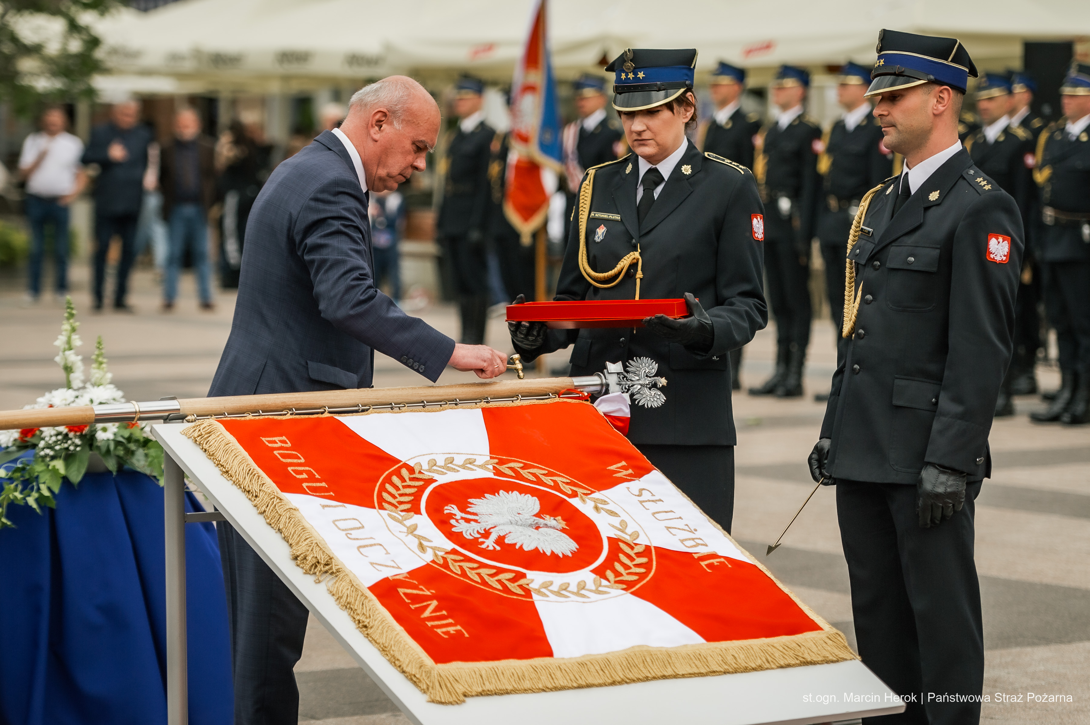 Następnie bryg. Sebastian Dziedzioch oddał honory sztandarowi, po czym złożył meldunek Śląskiemu Komendantowi Wojewódzkiemu PSP st. bryg. Damianowi Legierskiemu o przejęciu obowiązków Komendanta Miejskiego PSP.
