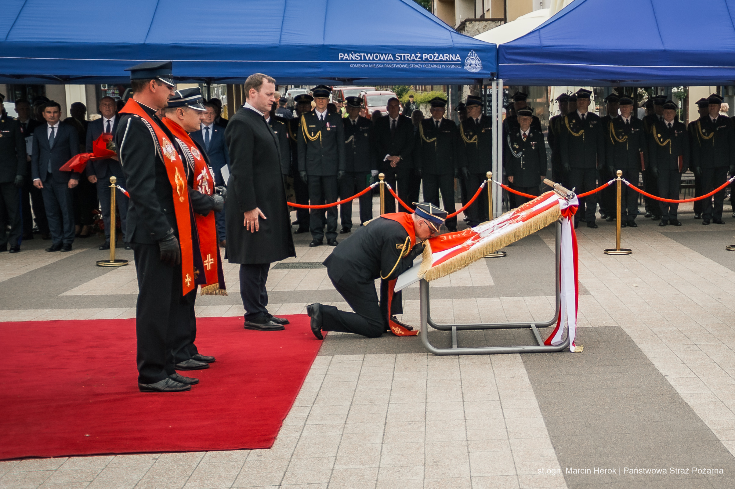 Ceremonia przekazania sztandaru została poprzedzona wbiciem pamiątkowych gwoździ w jego drzewce, wpisami do księgi pamiątkowej oraz błogosławieństwem. W imieniu Komendy sztandar przyjął Komendant Miejski PSP w Rybniku bryg. Sebastian Dziedzioch, przekazując go pocztowi sztandarowemu Komendy.