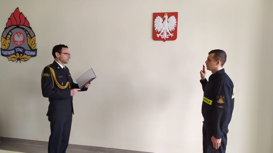 Nowo przyjętego do służby strażaka witamy w szeregach Państwowej Straży Pożarnej i życzymy bezpiecznej służby oraz wiele satysfakcji z wybranego zawodu.