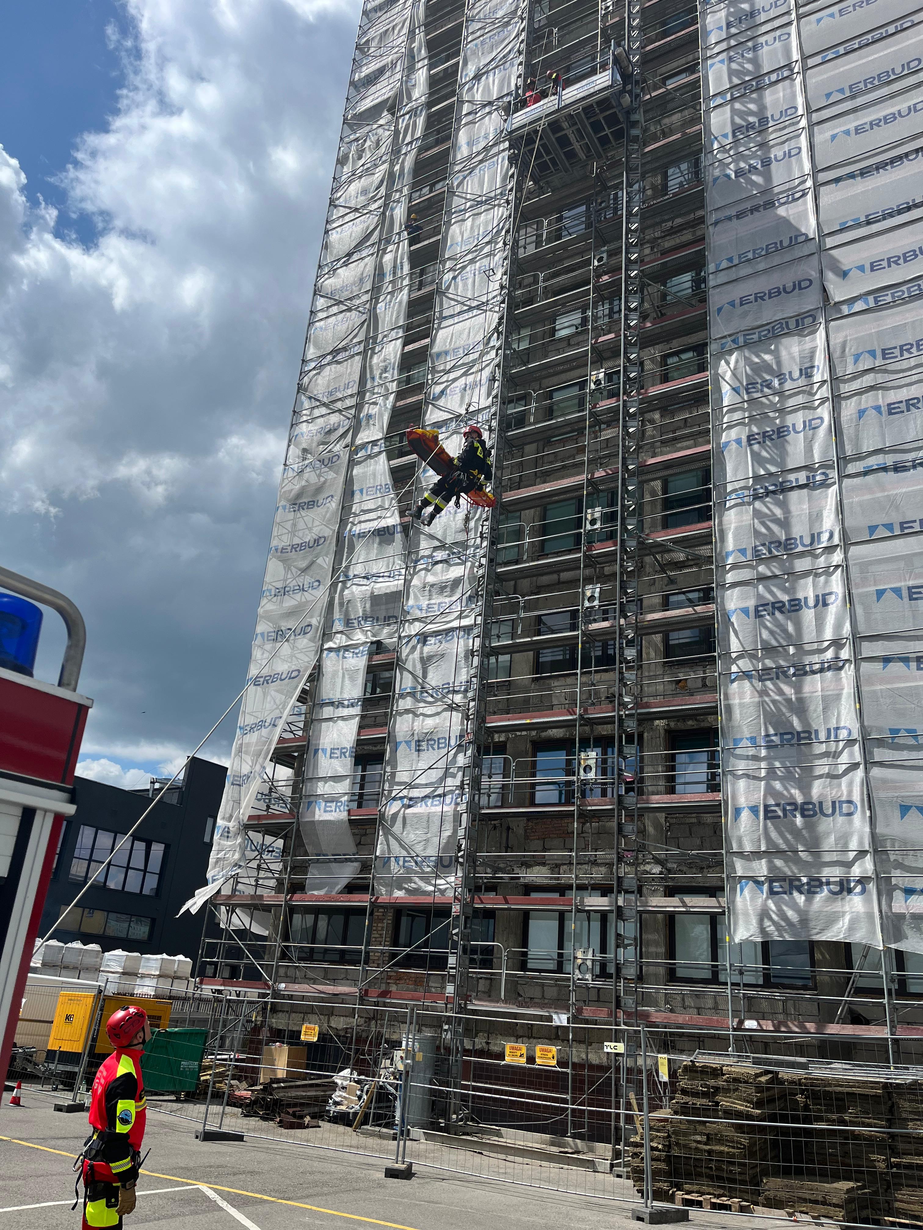 Scenariusz zakładał konieczność ewakuacji operatora dźwigu budowlanego, który zasłabł podczas pracy na wysokości. Ratownicy dotarli do poszkodowanego, udzielili mu kwalifikowanej pierwszej pomocy, a następnie wykorzystując techniki alpinistyczne, bezpiecznie sprowadzili go na ziemię.