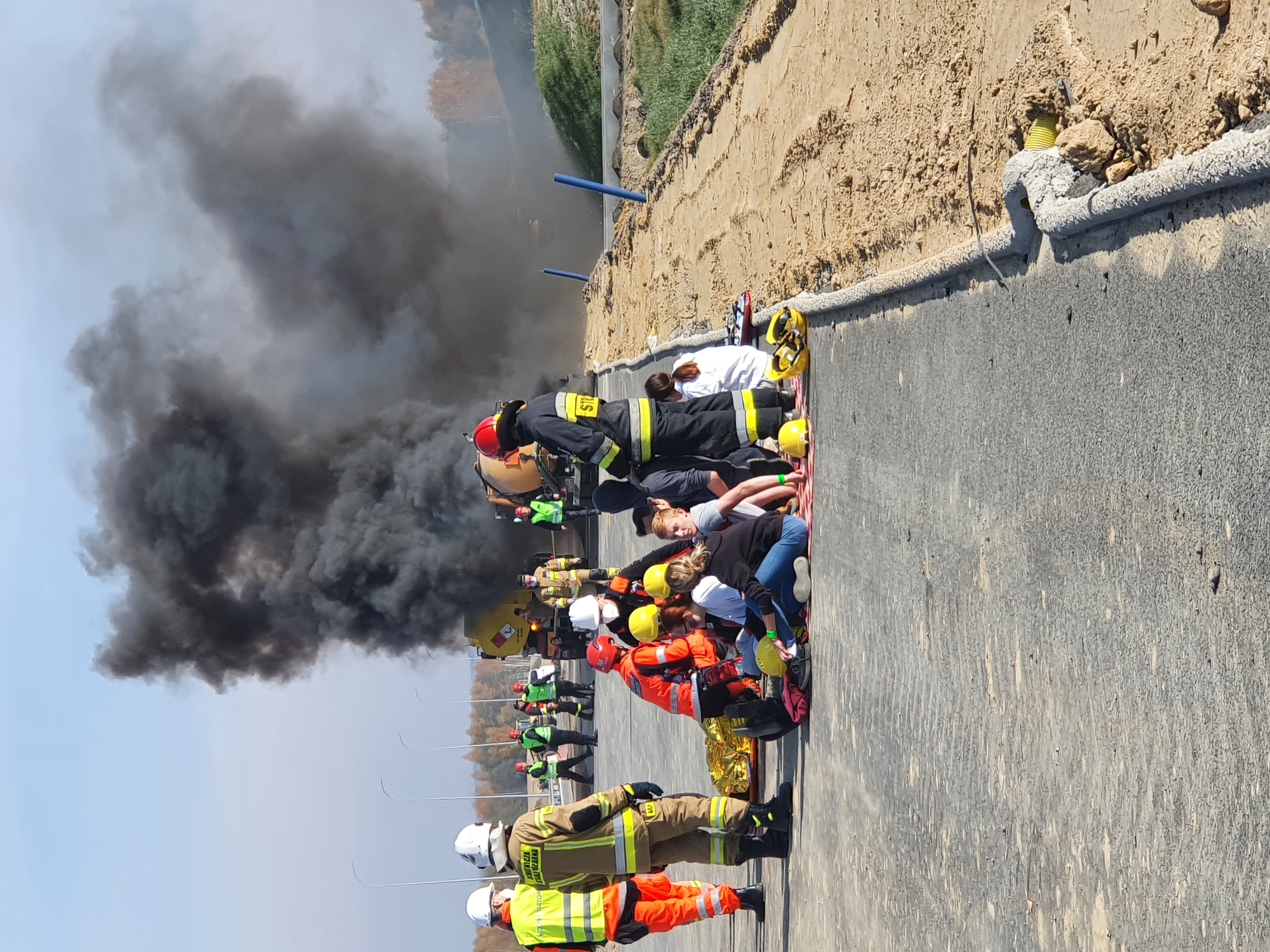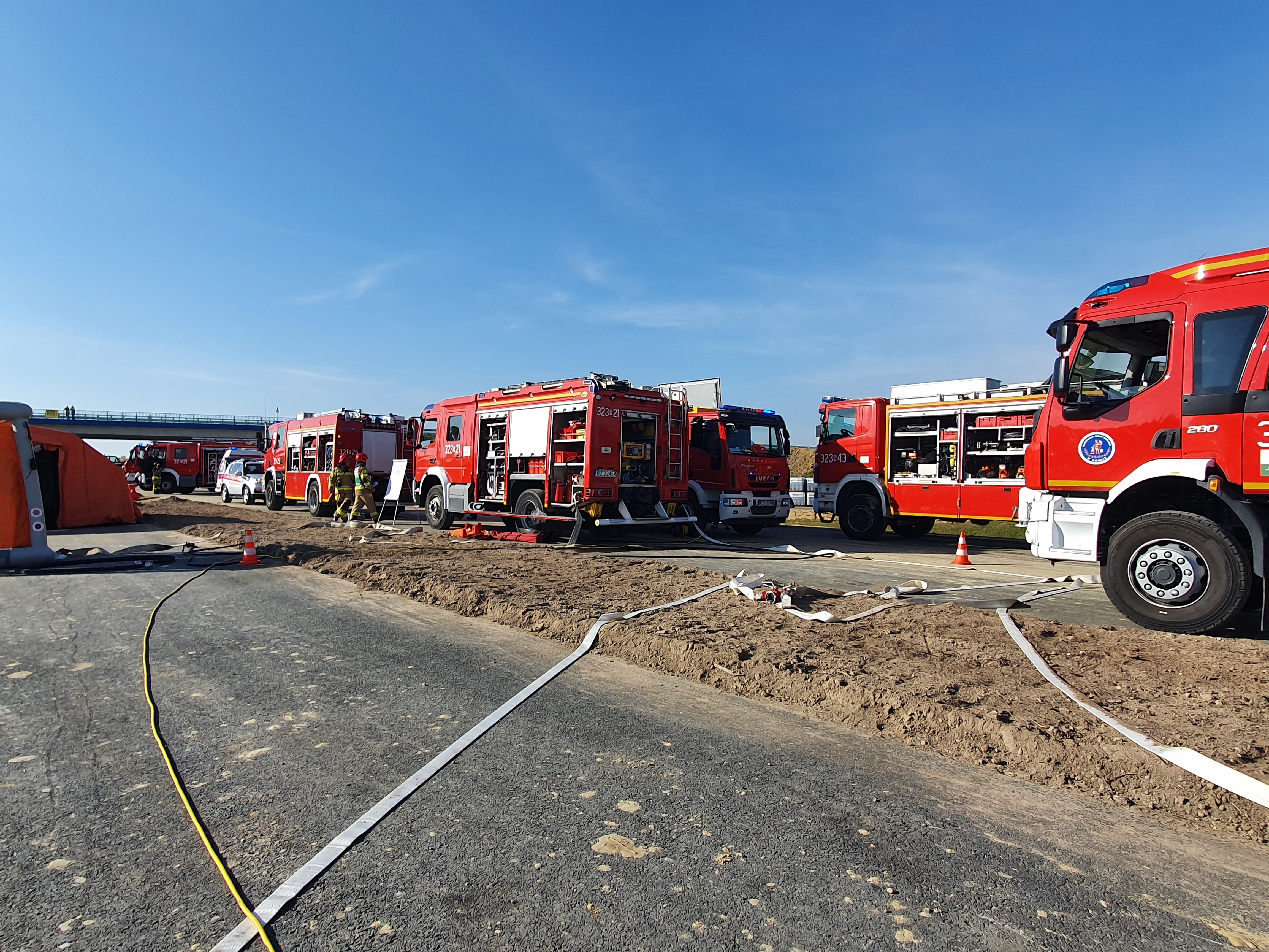 Pozorowane zdarzenie zakładało wypadek komunikacyjny z udziałem 5 samochodów osobowych, autobusu i pojazdu MANITOU na jednym pasie ruchu oraz samochodu osobowego i 2 cystern przewożących kwas azotowy i benzynę na drugim.
