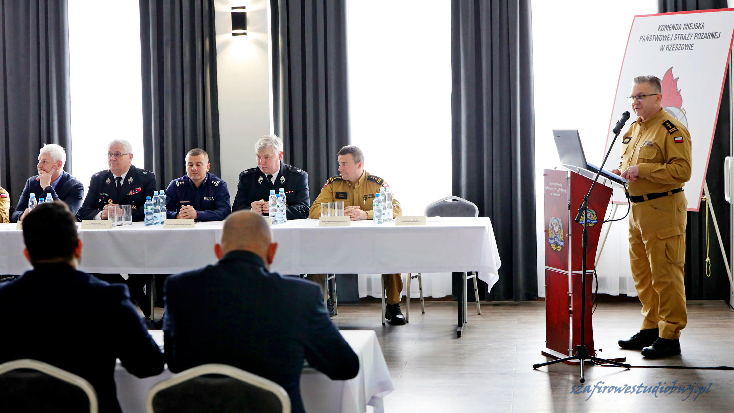 - realizacji zadań wykonanych przez Komendę Miejską PSP w Rzeszowie w 2024 roku oraz główne założenia ustawy o ochronie ludności i obronie cywilnej szczebla powiatowego przedstawione przez Komendanta Miejskiego PSP w Rzeszowie st. bryg. Andrzeja Wantrycha,