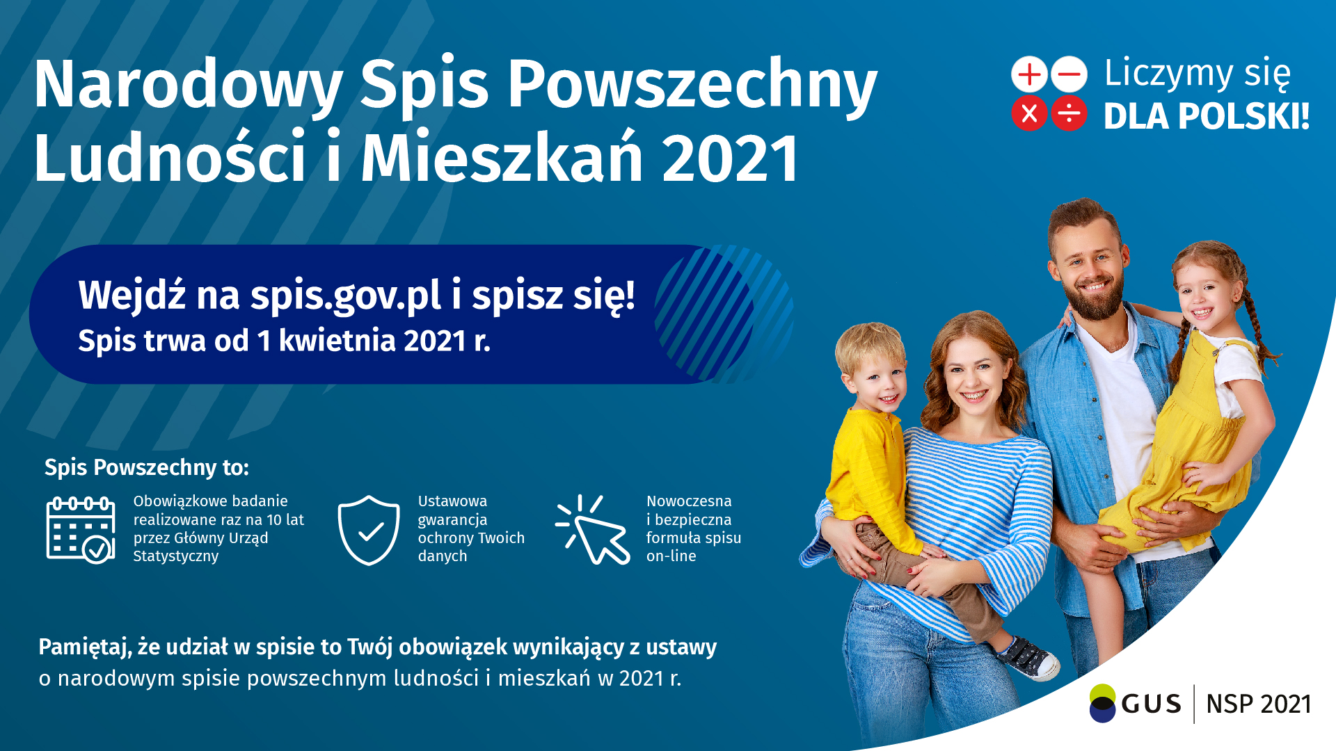 Od 1 kwietnia do 30 września 2021 r. przeprowadzony zostanie Narodowy Spis Powszechny Ludności i Mieszkań 2021. W spisie powszechnym zostaną zebrane informacje dotyczące następujących tematów: