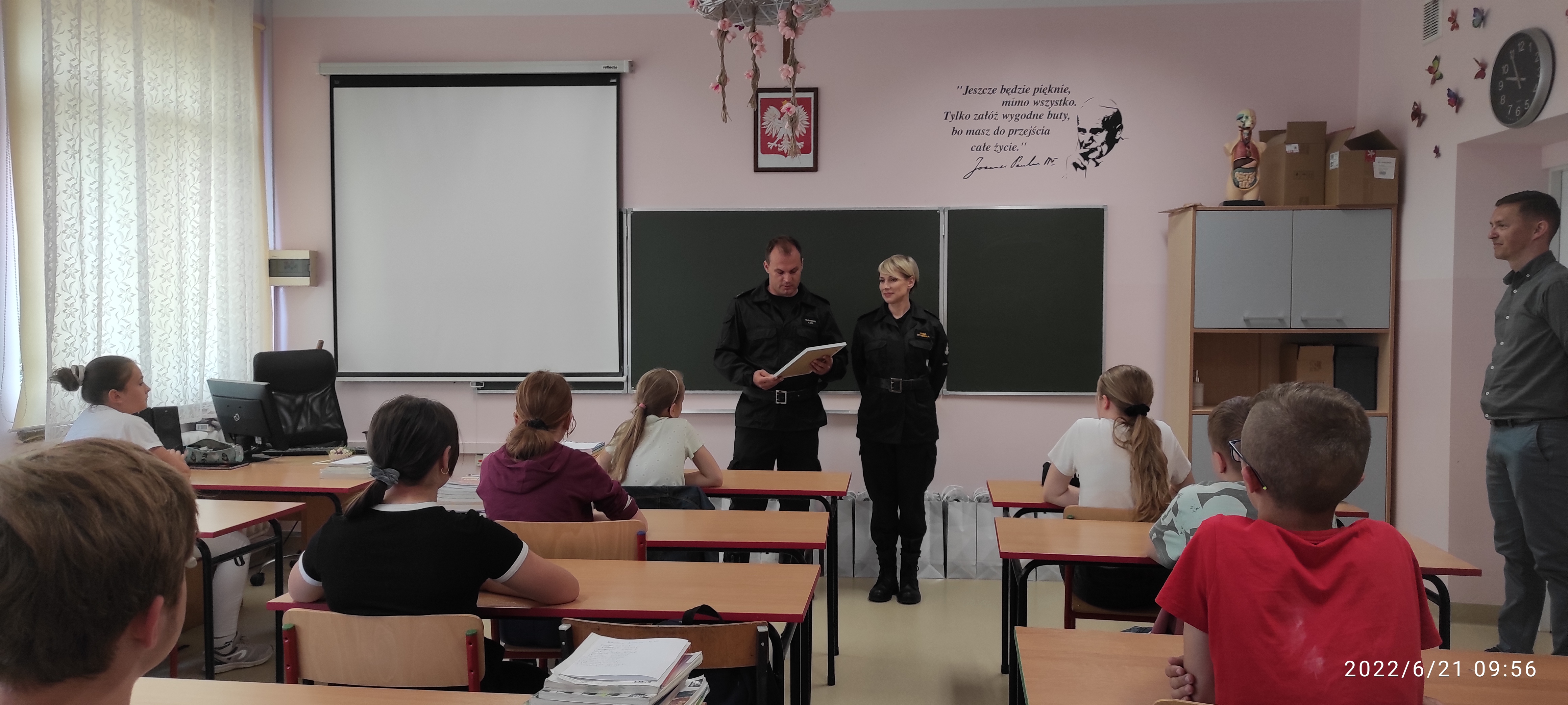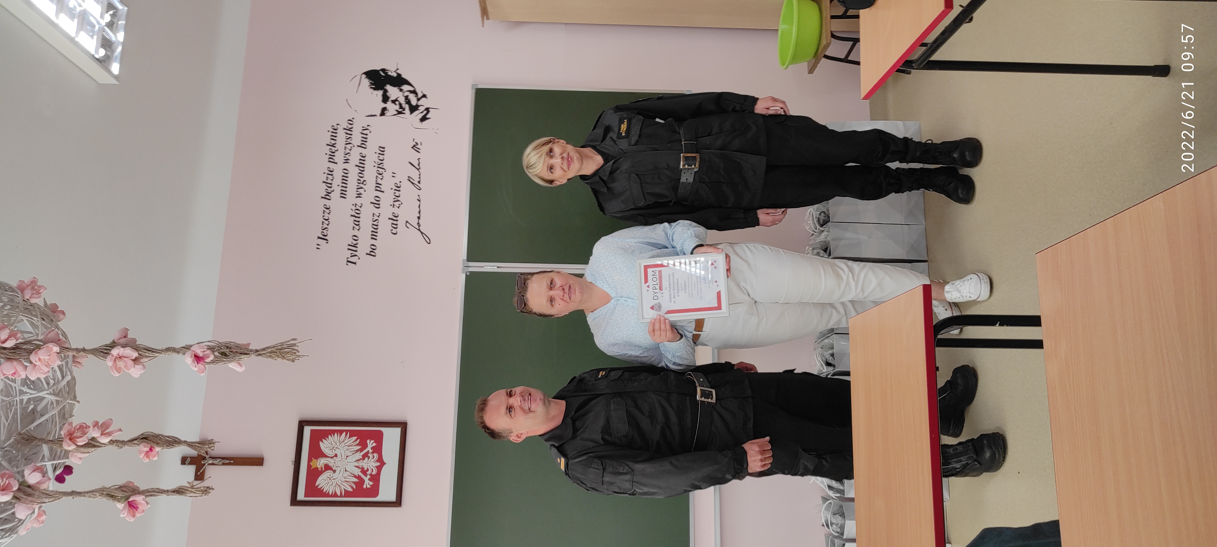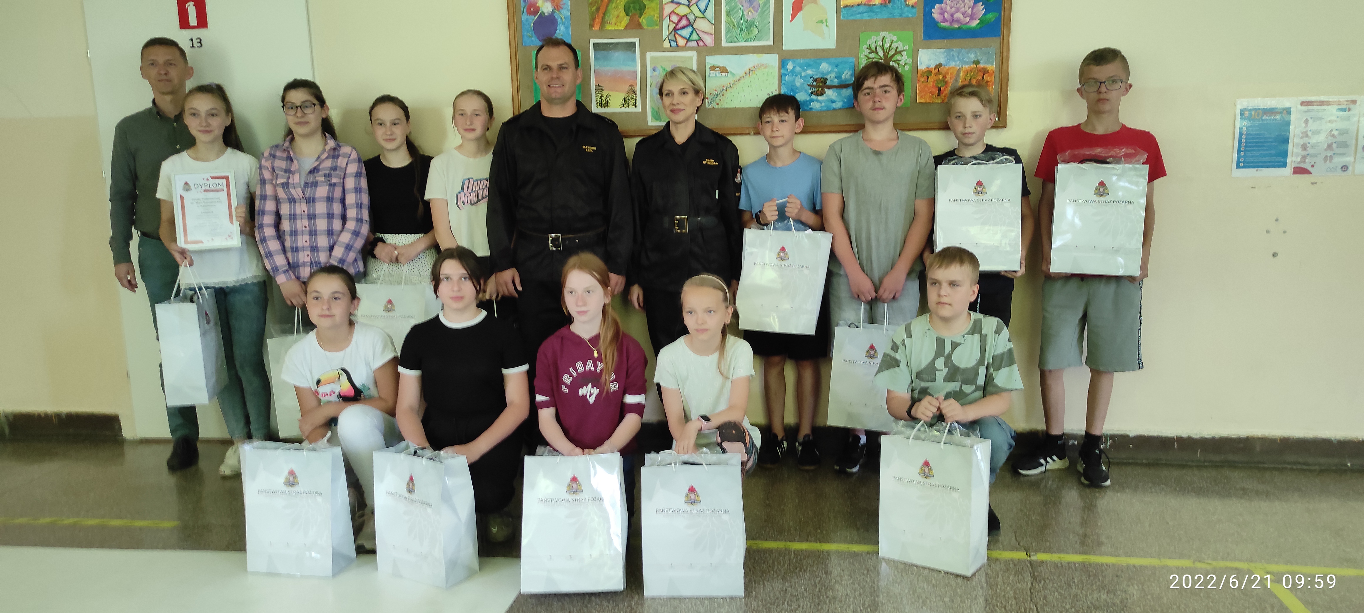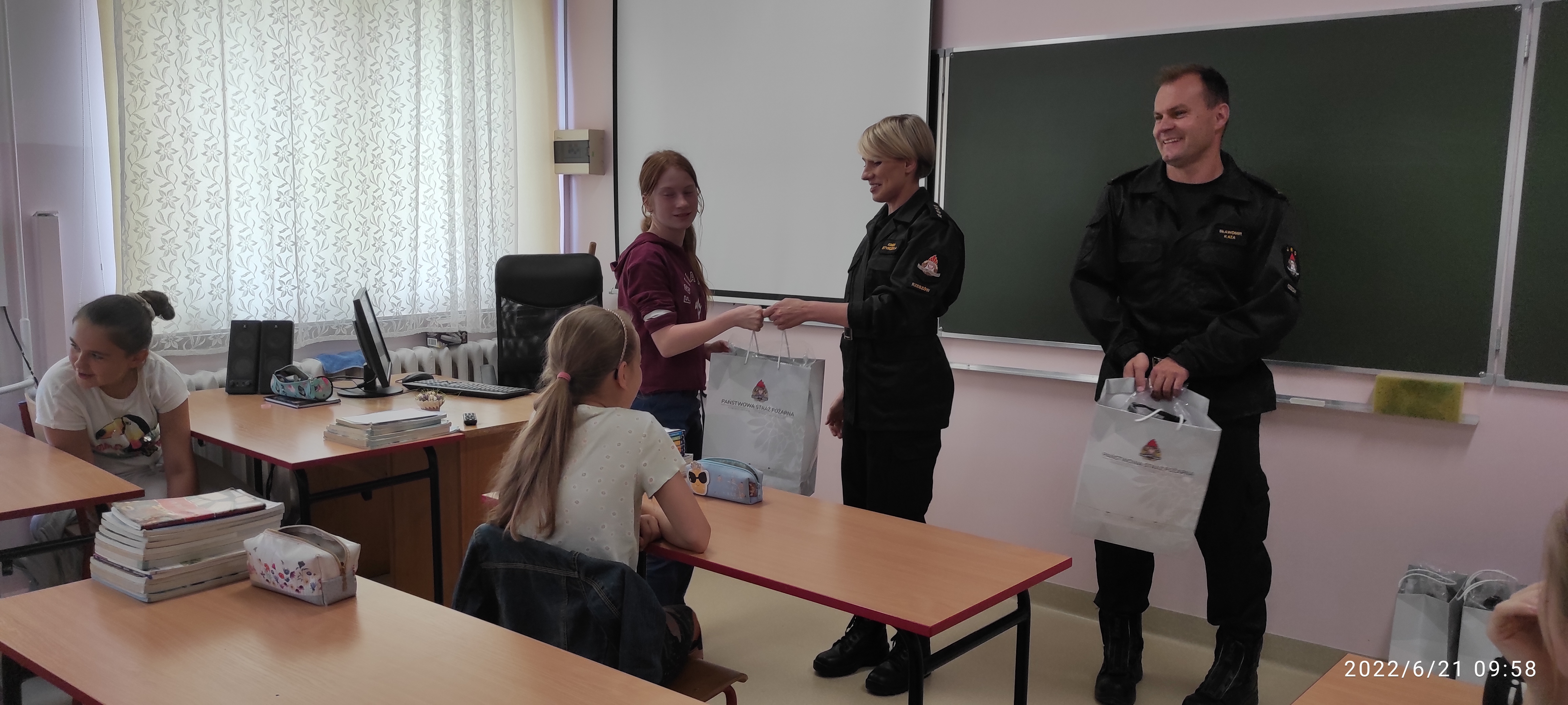 21.06.2022 r. przedstawiciele Komendanta Miejskiego Państwowej Straży Pożarnej w Rzeszowie - mł. bryg. Sławomir Kata oraz st. kpt. Kinga Styrczula wręczyli nagrody uczniom klasy 7 Szkoły Podstawowej w Kąkolówce za zajęcie II miejsca w ogólnopolskim konkursie kalendarzowym PSP 2022 - BEZPIECZNY JA, którego organizatorem była Komenda Główna Państwowej Straży Pożarne. Gratulujemy miejsca na podium oraz życzymy dalszych sukcesów uczniom Szkoły Podstawowej w Kąkolówce!