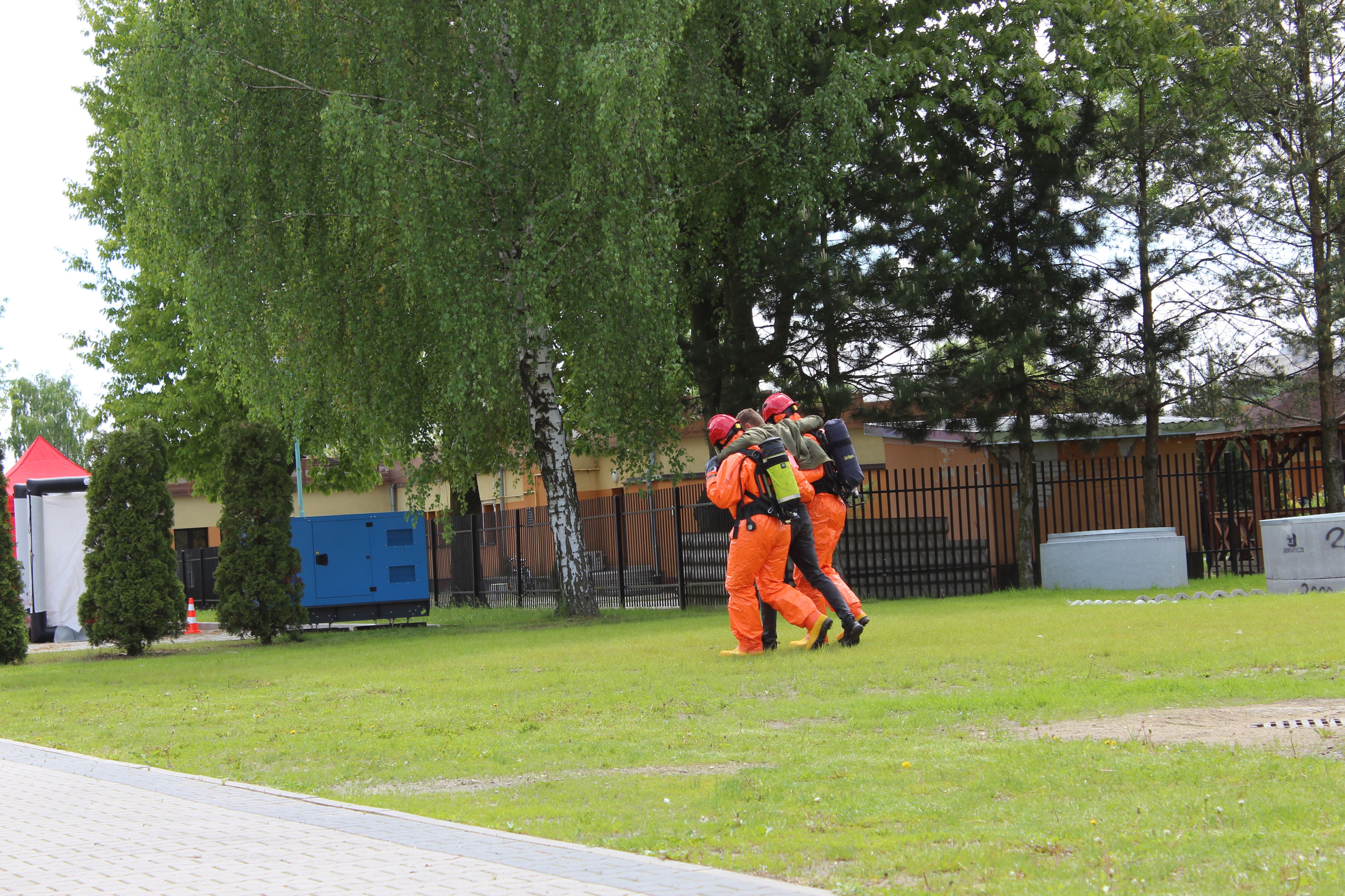 Ratownicy, ubrani w ubrania specjalne kat. III typ 3 oraz aparaty ochrony układu oddechowego, ewakuowali poszkodowanego ze strefy zagrożenia. Po dekontaminacji poszkodowanego, udzielono mu kwalifikowanej pierwszej pomocy oraz przekazano przybyłemu na miejsce zespołowi Państwowego ratownictwa Medycznego.