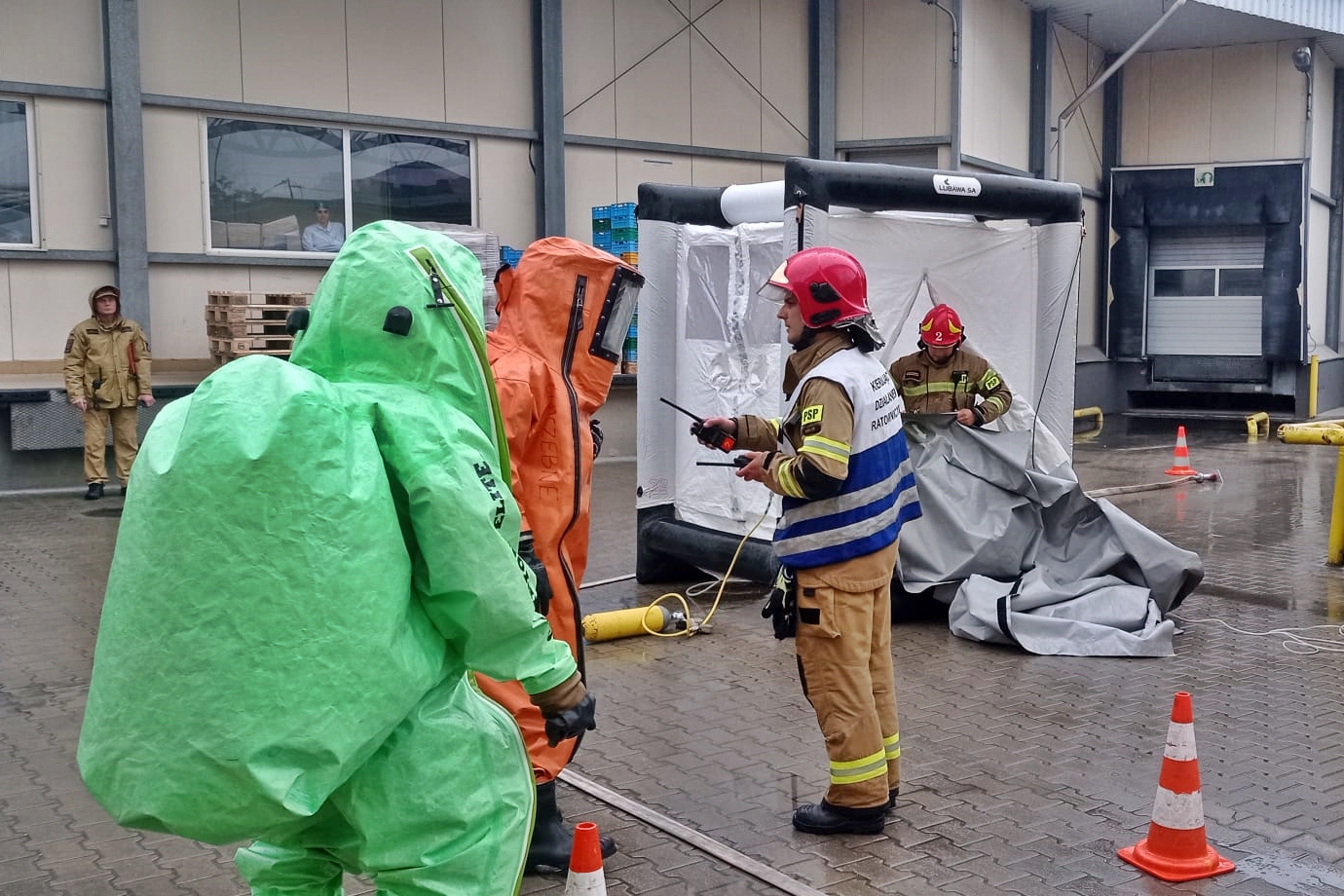 W dniach 17-19 maja 2023 roku na terenie Okręgowej Spółdzielni Mleczarskiej w Siedlcach odbyły się ćwiczenia z zakresu doskonalenia działań ratowniczych na terenie zakładu z rozszczelnioną instalacją chłodniczą wypełnioną amoniakiem oraz ciężkim wypadkiem pracownika na wysokości.