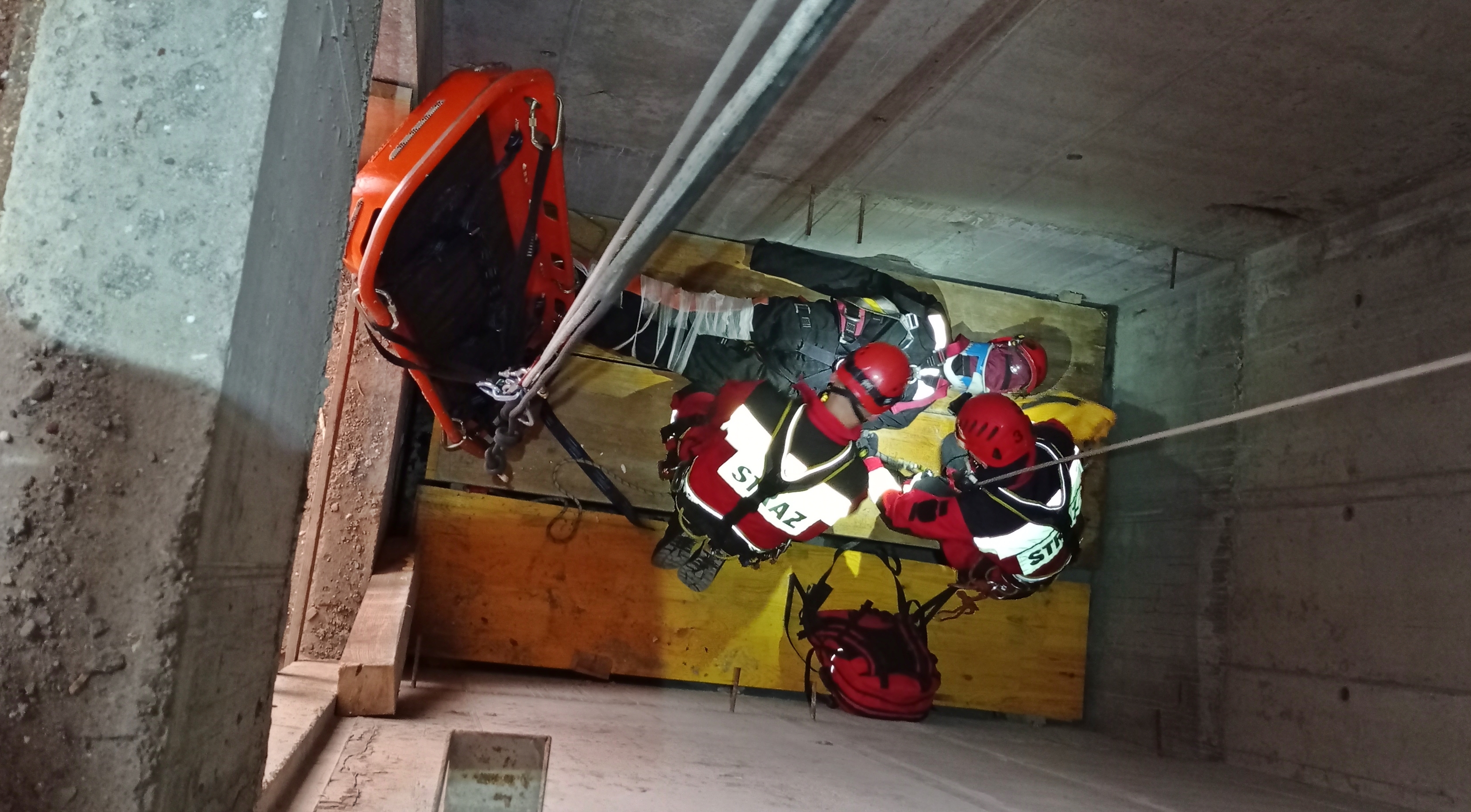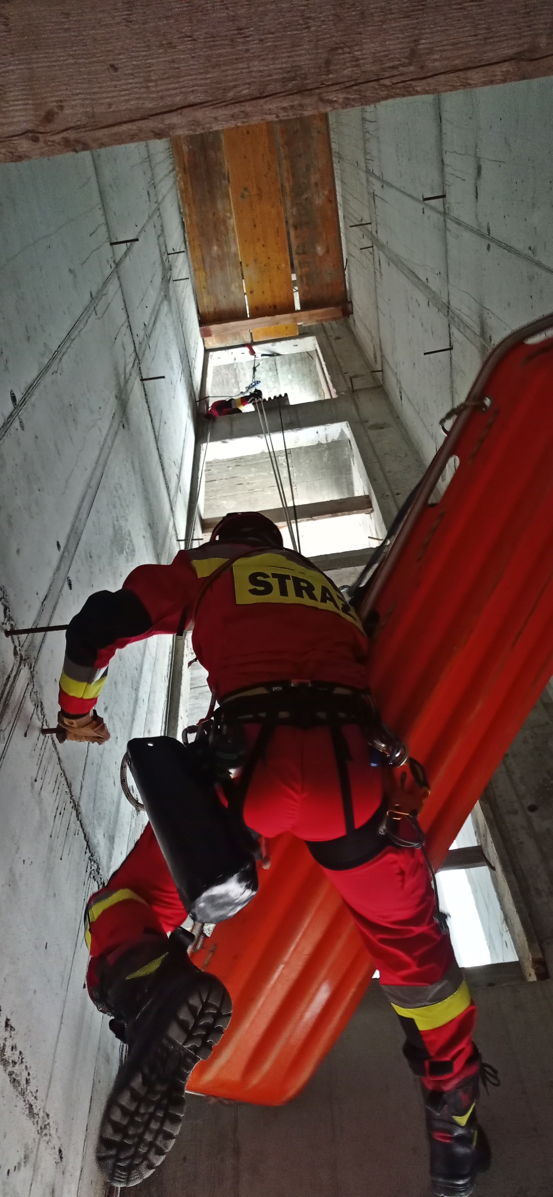 Ćwiczenia miały na celu ewakuację osoby poszkodowanej z wysokości w warunkach budowy oraz doskonalenie działania podczas zdarzeń na w szybach windowych.