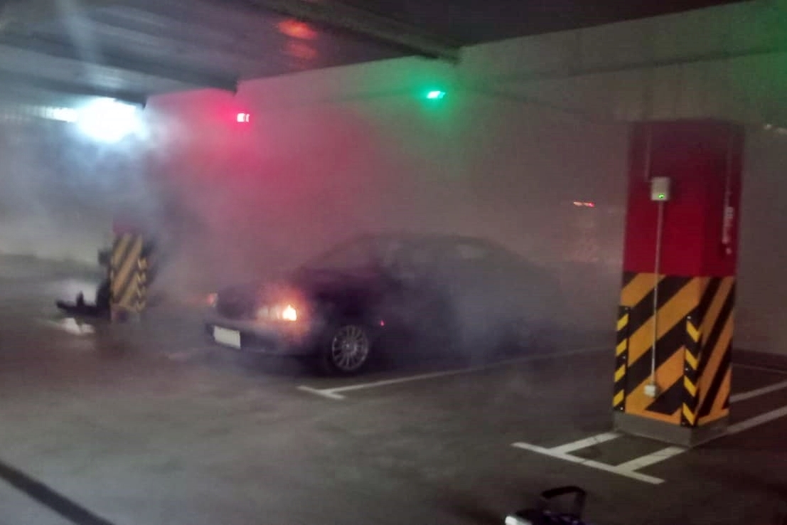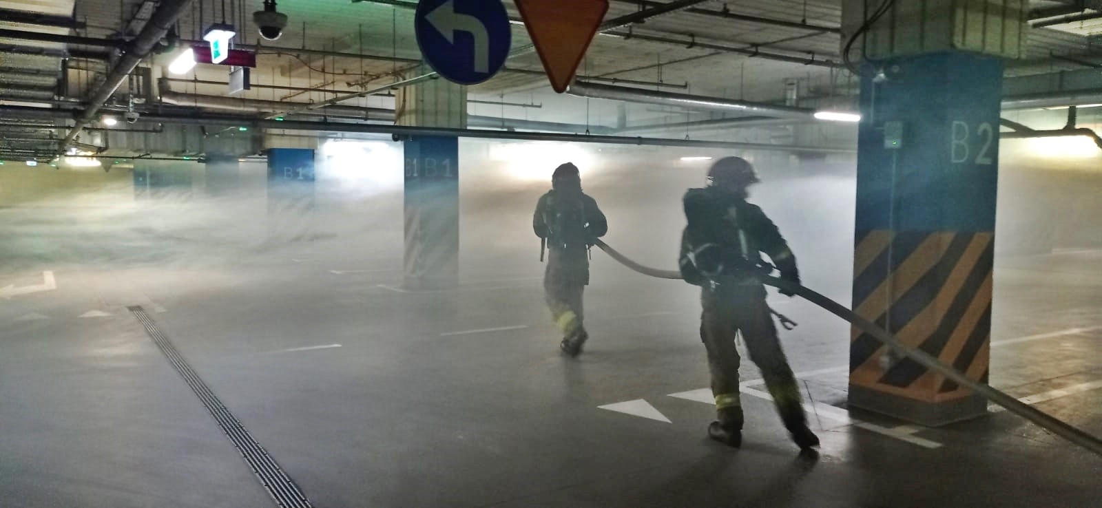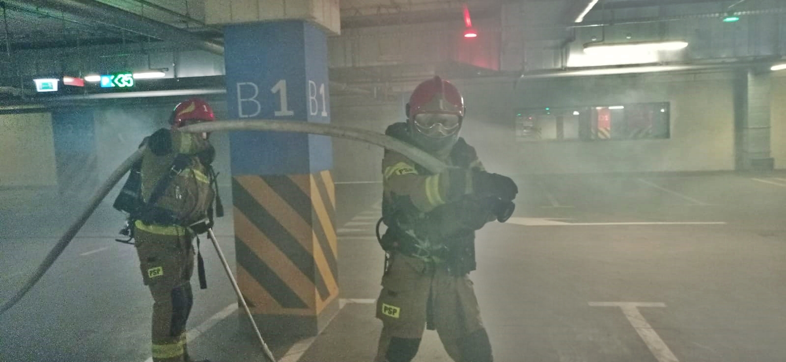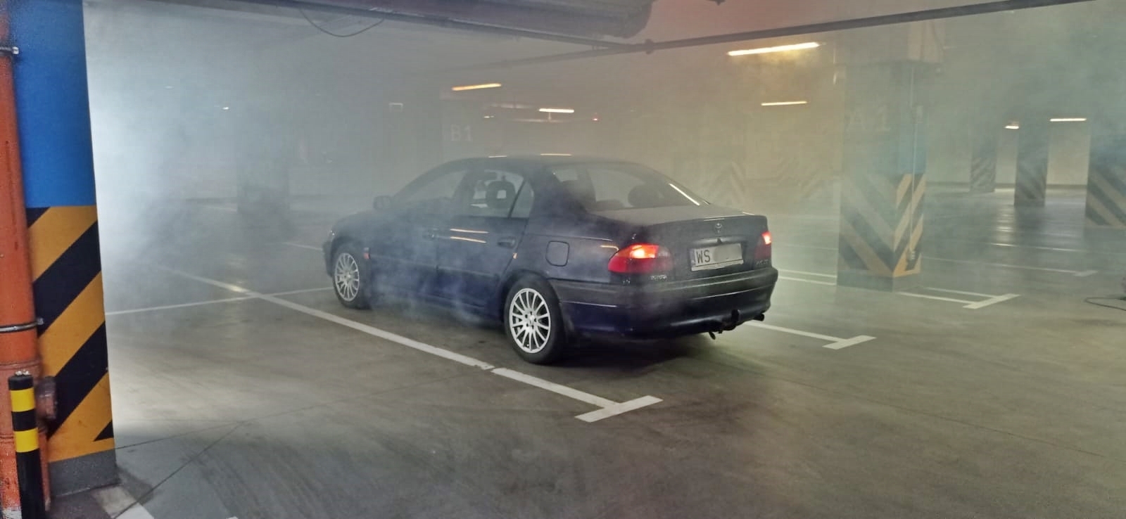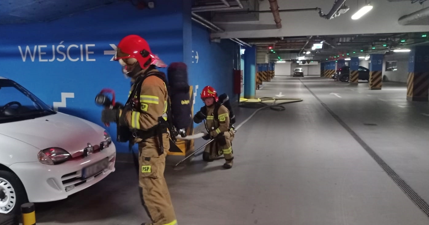 W samochodzie osobowym stojącym na parkingu podziemnym doszło do zwarcia instalacji elektrycznej. Spod maski zaczął wydobywać się gęsty dym, co zauważył właściciel pojazdu, który podjął nieskuteczną próbę ugaszenia pożaru przy pomocy gaśnicy proszkowej. Zadymienie stało się coraz większe, co skutkowało automatycznym zamknięciem bram oddzielenia pożarowego. Mężczyzna stracił orientację oraz podtruł się gazami pożarowymi, przez co stracił przytomność podczas próby wydostania się z garażu. W tym czasie komora silnika pojazdu stanęła w płomieniach. Pracownik galerii wezwał odpowiednie służby ratunkowe.