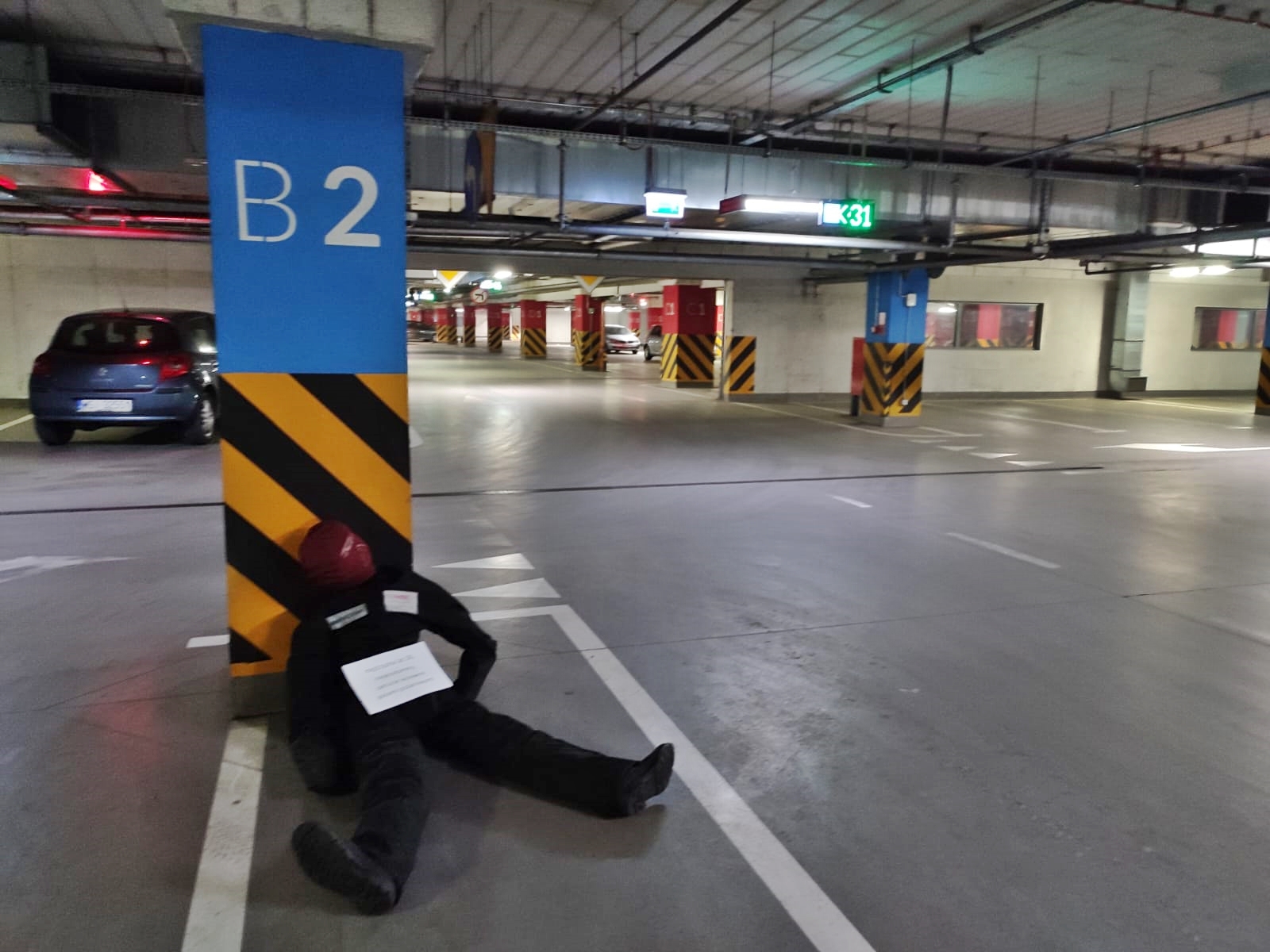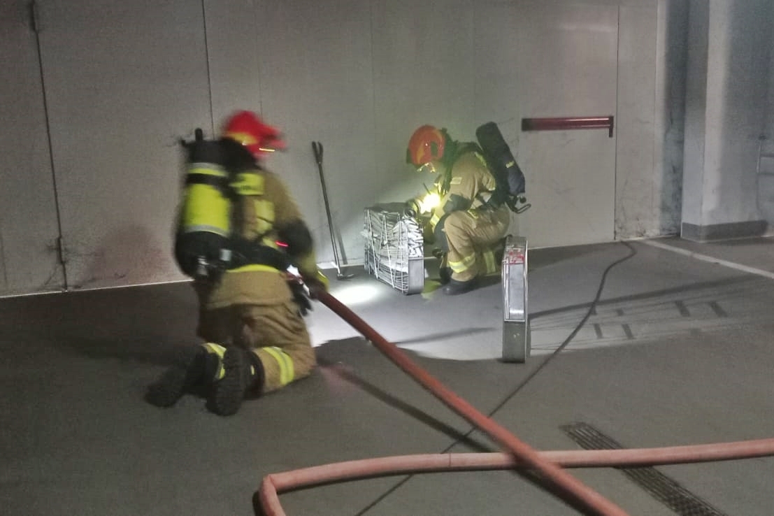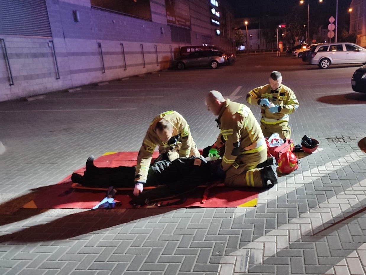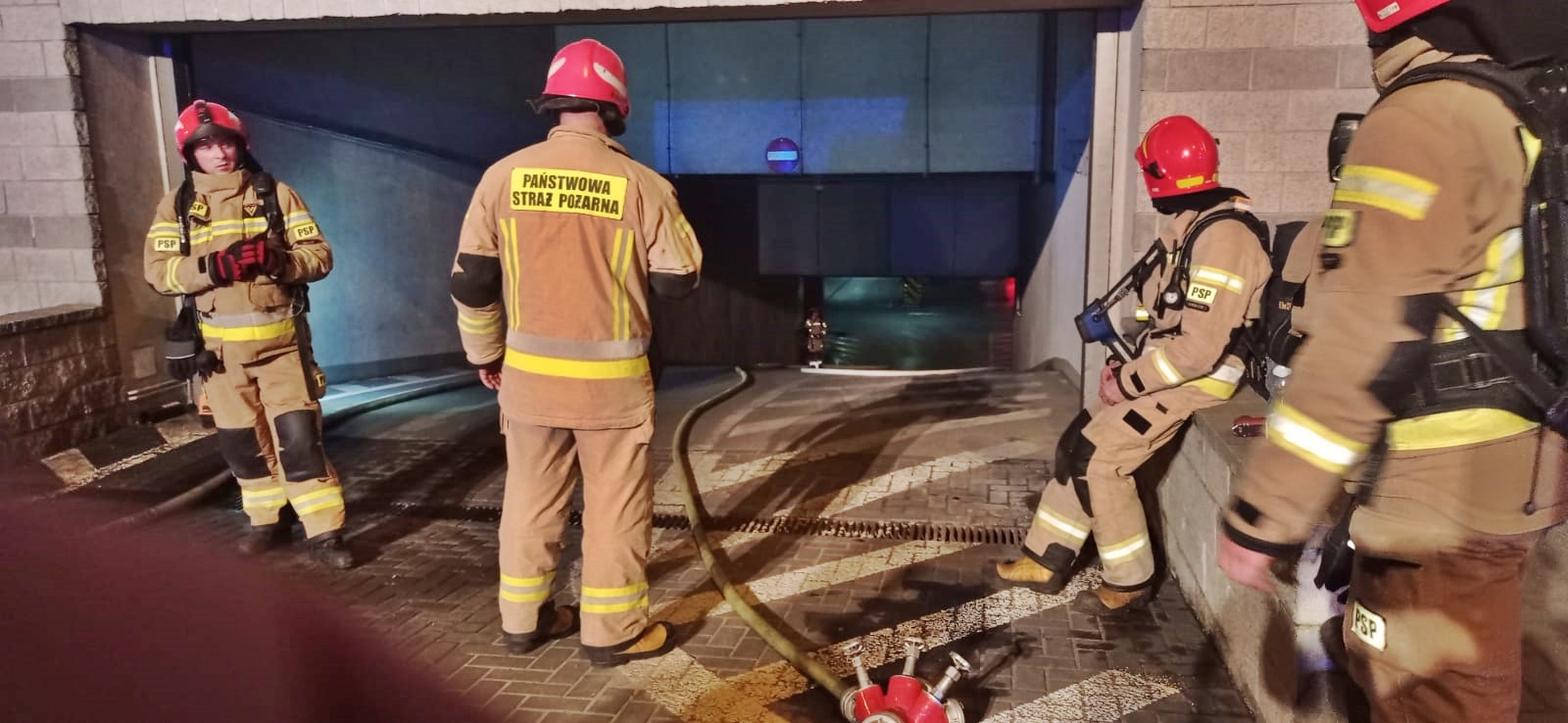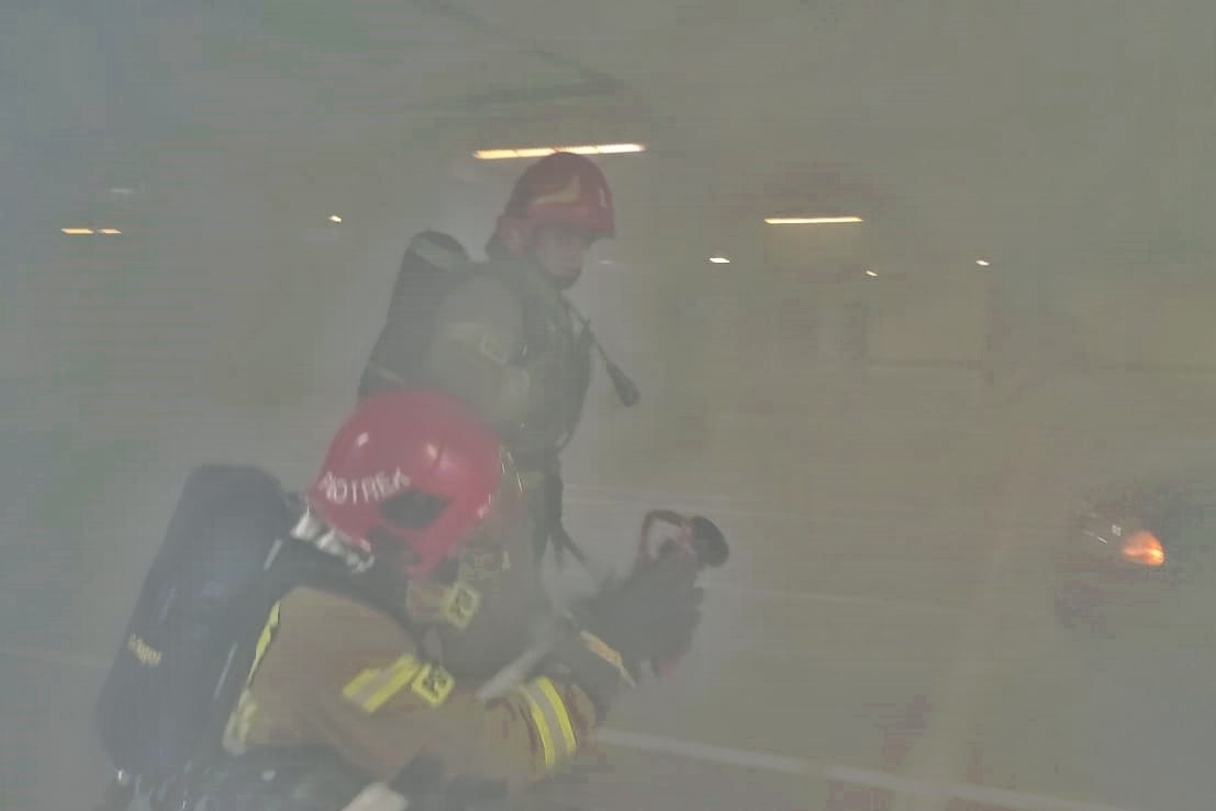 W samochodzie osobowym stojącym na parkingu podziemnym doszło do zwarcia instalacji elektrycznej. Spod maski zaczął wydobywać się gęsty dym, co zauważył właściciel pojazdu, który podjął nieskuteczną próbę ugaszenia pożaru przy pomocy gaśnicy proszkowej. Zadymienie stało się coraz większe, co skutkowało automatycznym zamknięciem bram oddzielenia pożarowego. Mężczyzna stracił orientację oraz podtruł się gazami pożarowymi, przez co stracił przytomność podczas próby wydostania się z garażu. W tym czasie komora silnika pojazdu stanęła w płomieniach. Pracownik galerii wezwał odpowiednie służby ratunkowe.