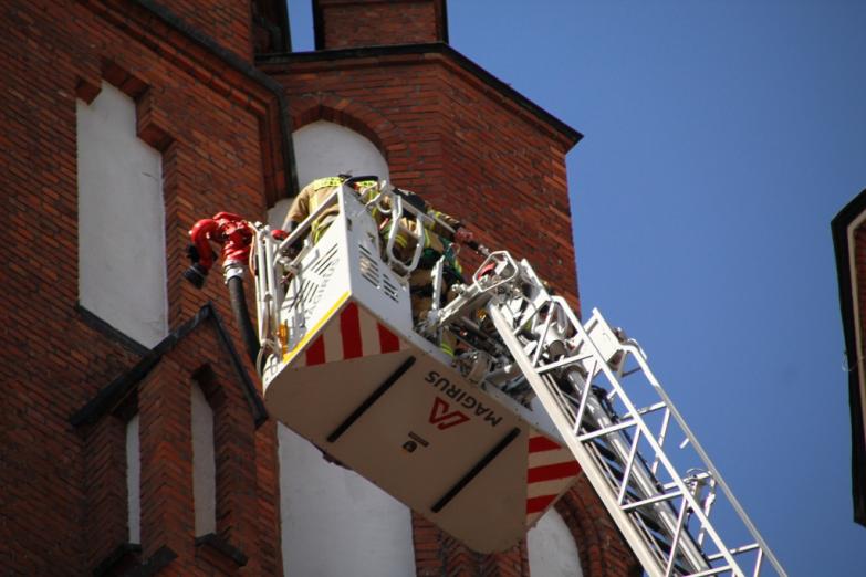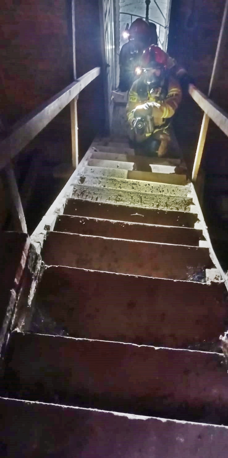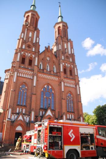 Pożar rozprzestrzenił się na drewnianą klatkę schodową wschodniej wieży. Po przyjeździe zastępów PSP ksiądz informuje o zastanej sytuacji Kierującego Działaniem Ratowniczym. Drugi pracownik znajduje się na klatce schodowej prowadzącej na chór.