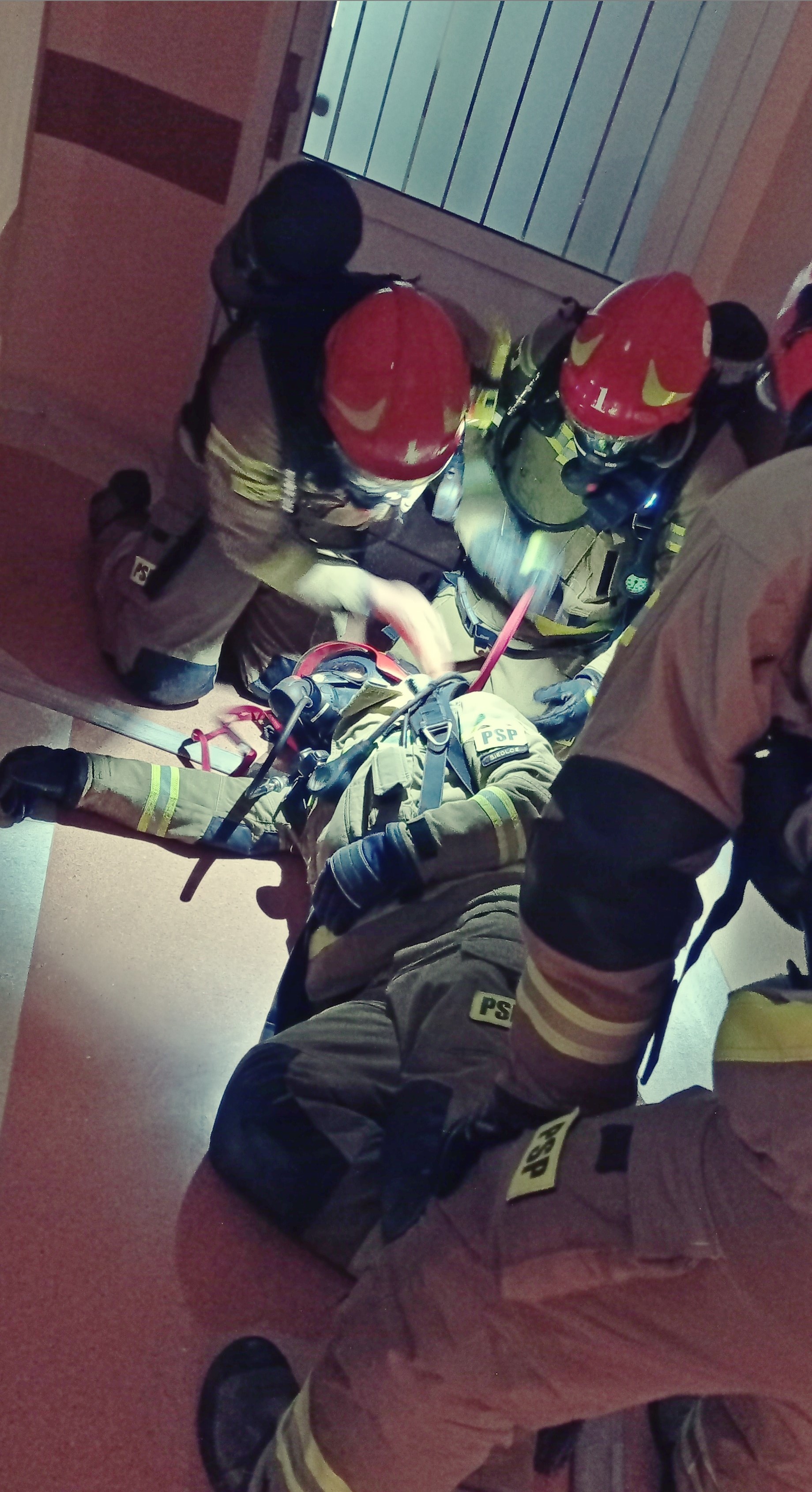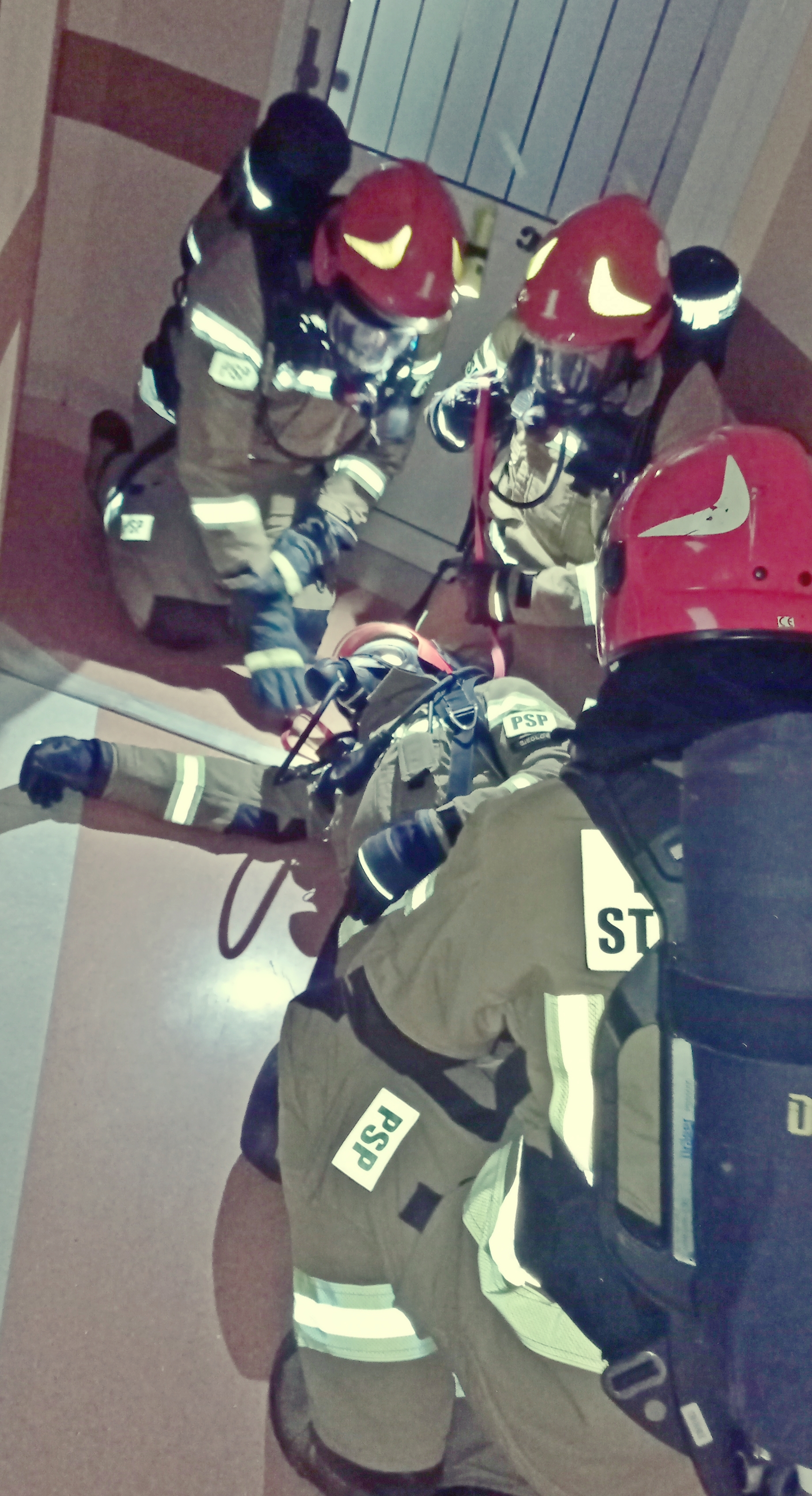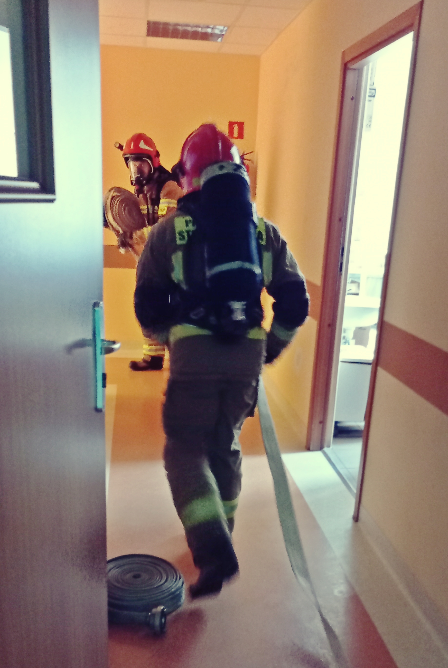 Podczas prac remontowych w szatni, poprzez niewłaściwe zabezpieczenie prac pożarowo niebezpiecznych, doszło do powstania pożaru. Pracownicy remontowi podjęli akcję gaśniczą przy użyciu podręcznego sprzętu gaśniczego jednak działania te nie przyniosły pożądanego efektu, a pożar się rozwinął. Jeden z pracowników budynku włączył Ręczny Ostrzegacz Pożarowy i opuścił budynek wraz ze wszystkimi pracownikami oddziału, a także pracownikami ekipy remontowej. Po wyjściu zorientował się, że brakuje jego pracownika ekipy remontowej, który w momencie wybuchu pożaru znajdował się w toalecie i został odcięty od wyjścia ewakuacyjnego przez gęsty dym znajdujący się na korytarzu, a następnie zemdlał.