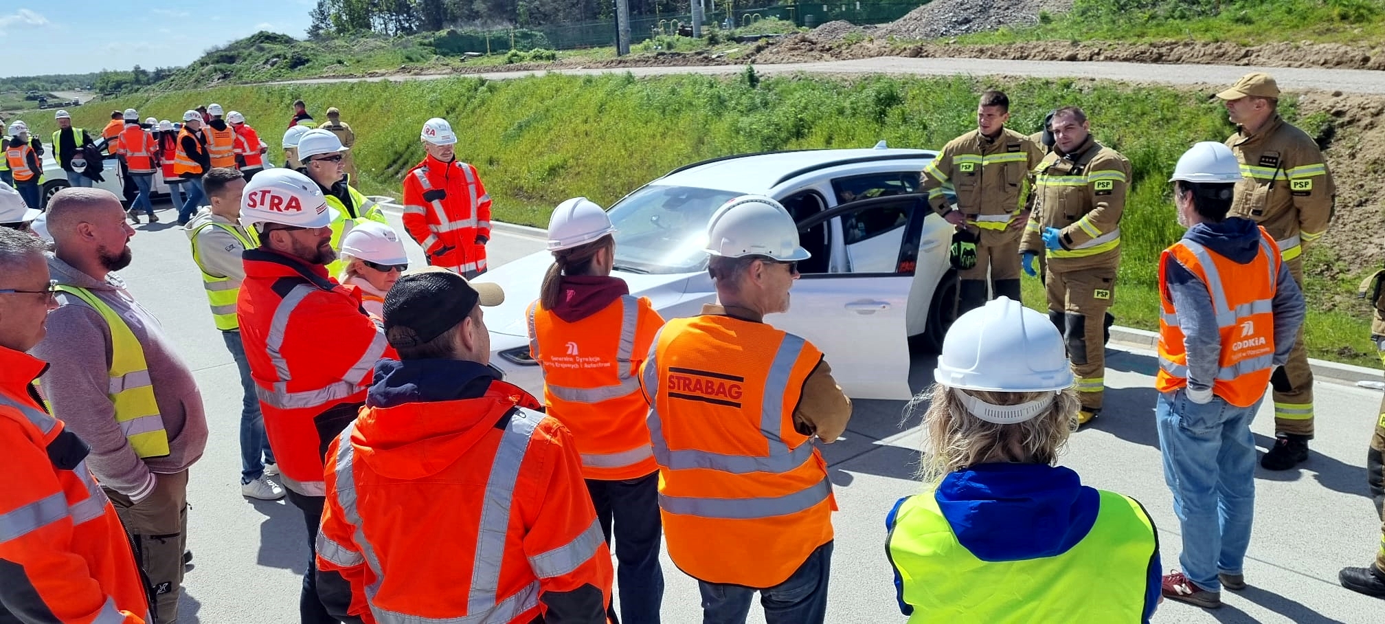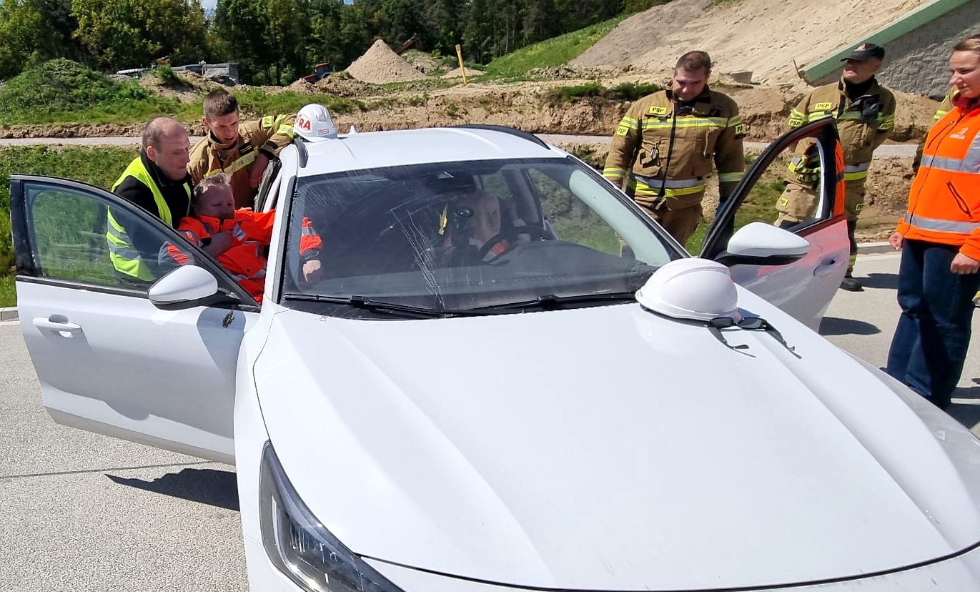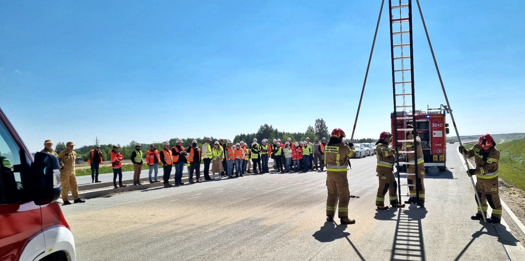 Podczas ćwiczeń strażacy i pracownicy GDDKiA wspólnie omówili procedury obowiązujące w czasie współpracy z zastępami Państwowej Straży Pożarnej.