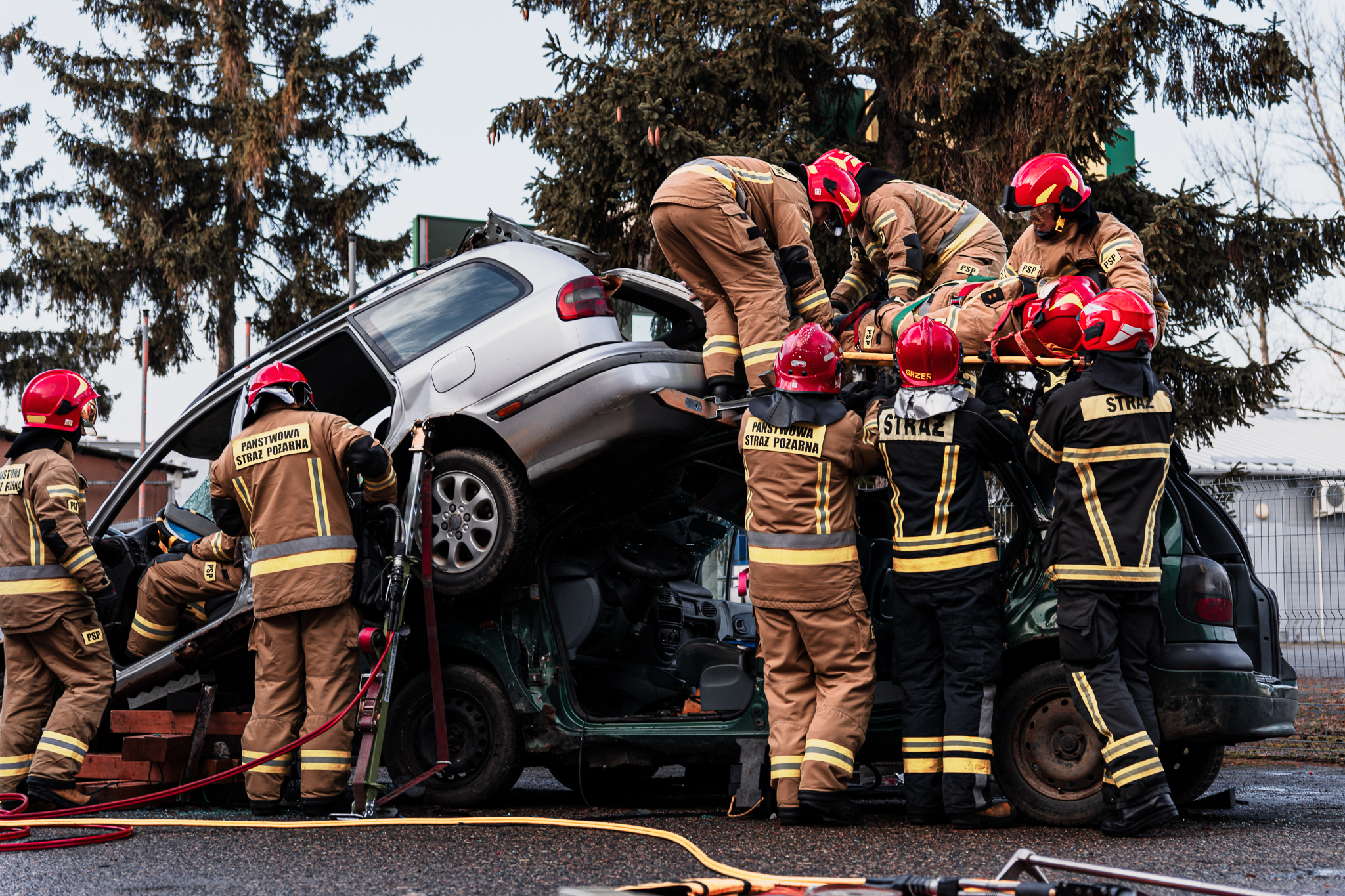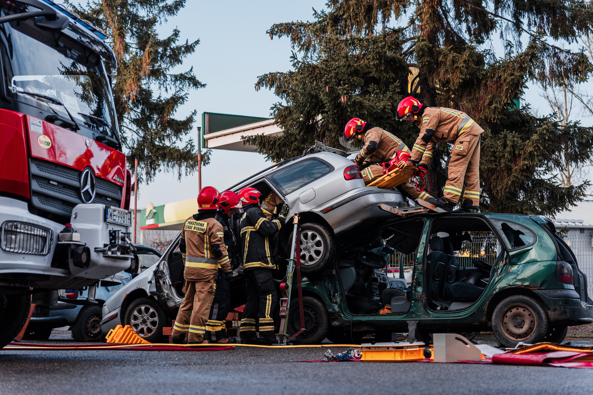Strażacy podczas ćwiczeń wykonywali dostęp do poszkodowanych przy wykorzystaniu różnych technik ratownictwa technicznego, takich jak stabilizacja pojazdu, usuwanie drzwi, odpychanie deski rozdzielczej czy wykonanie dostępu do nóg poszkodowanego.