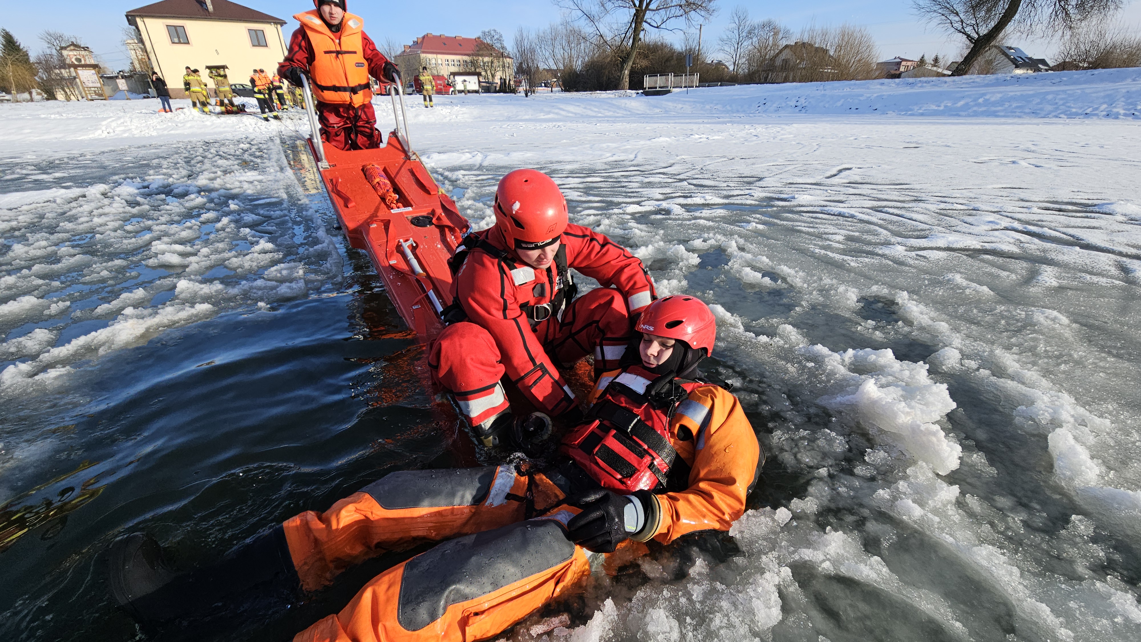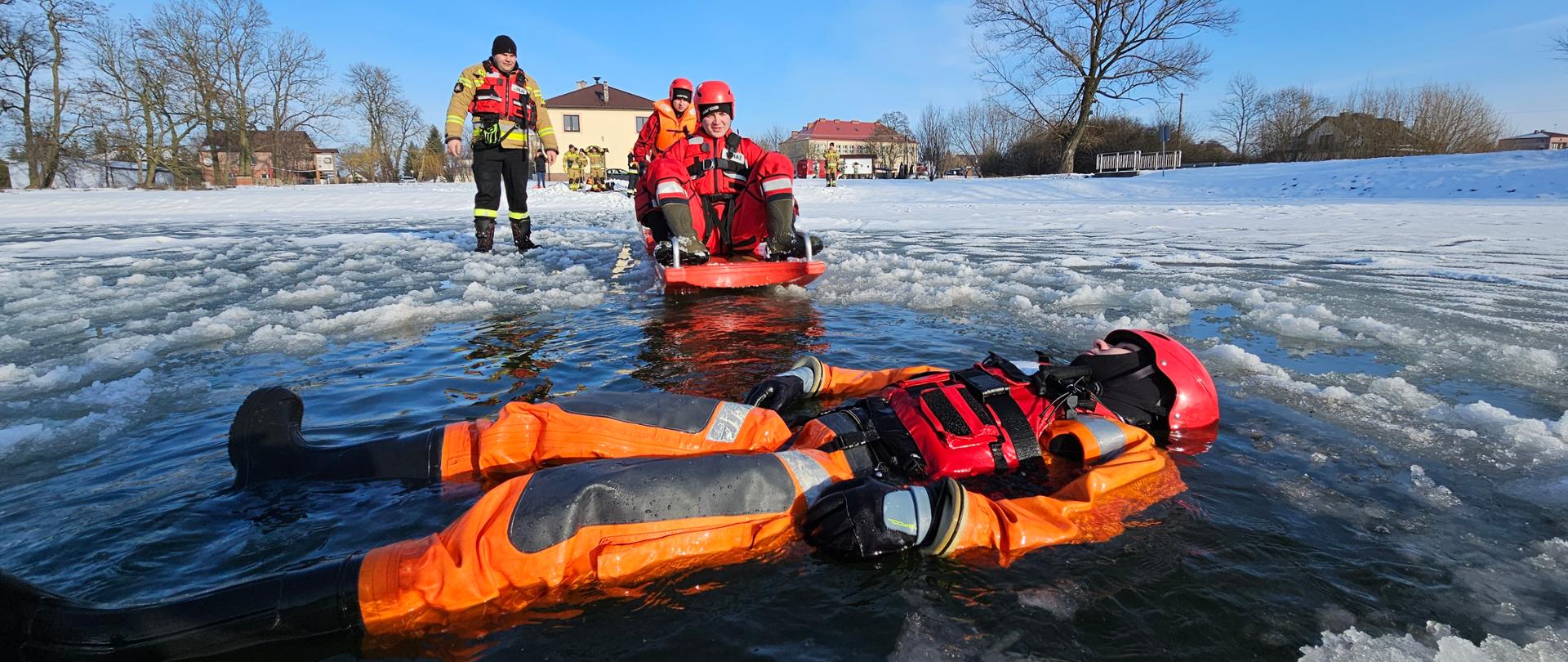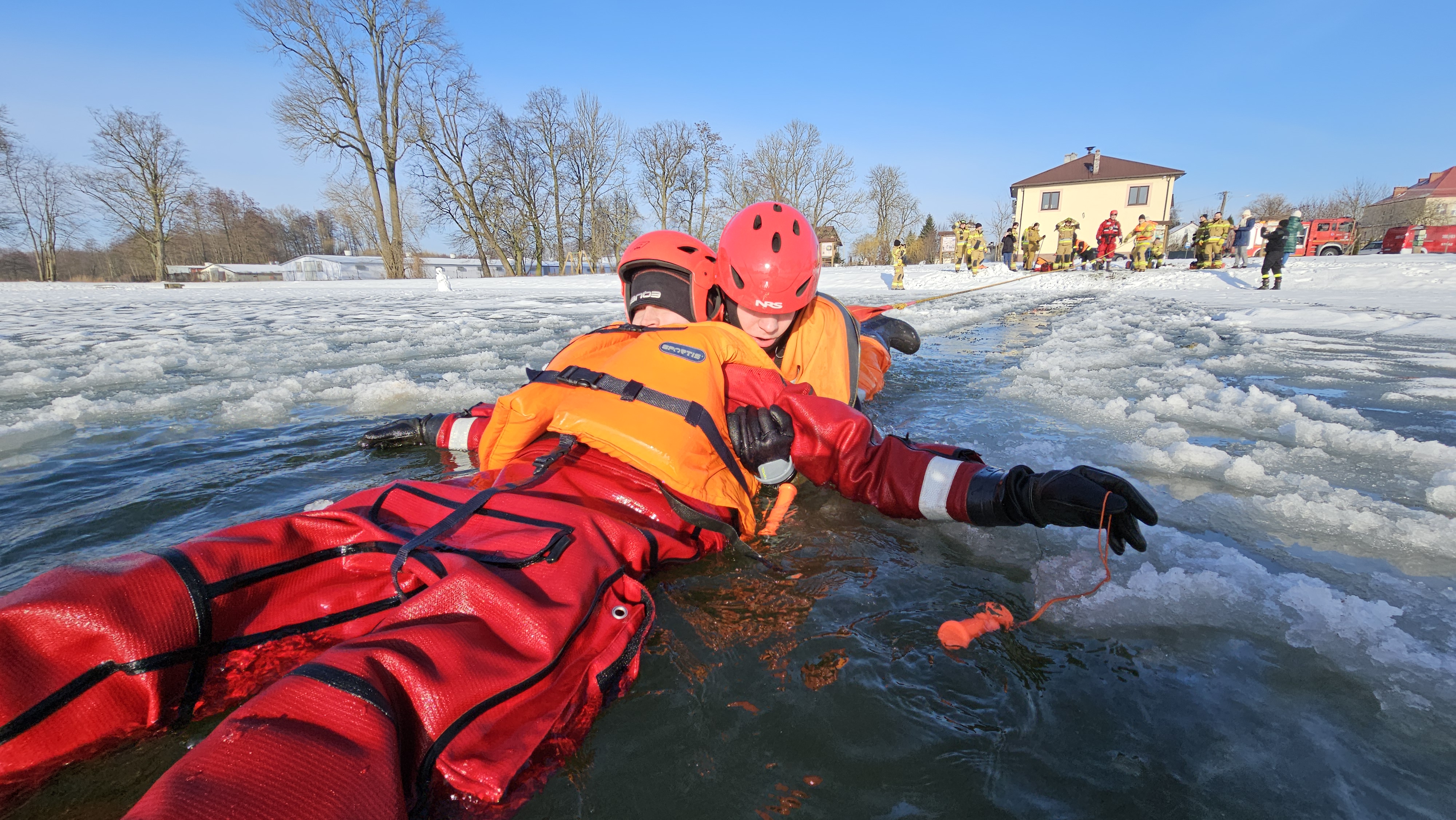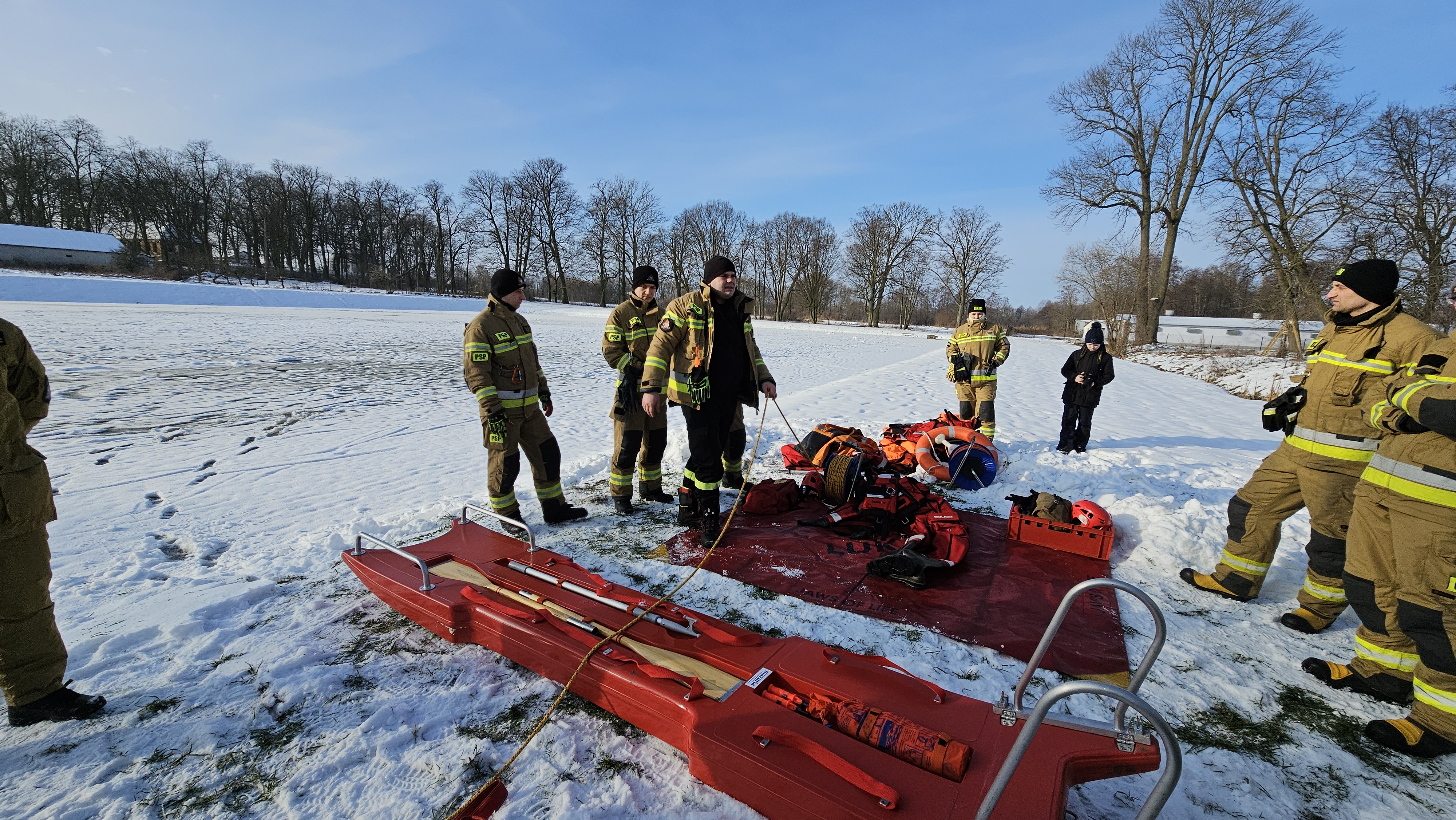 Ratownicy zabezpieczeni byli w specjalne kombinezony do pracy w wodzie, kamizelki asekuracyjne oraz wykorzystywali sprzęt przeznaczony m.in. do tego typu działań, tj. sanie lodowe, liny, koło i rzutki ratunkowe.