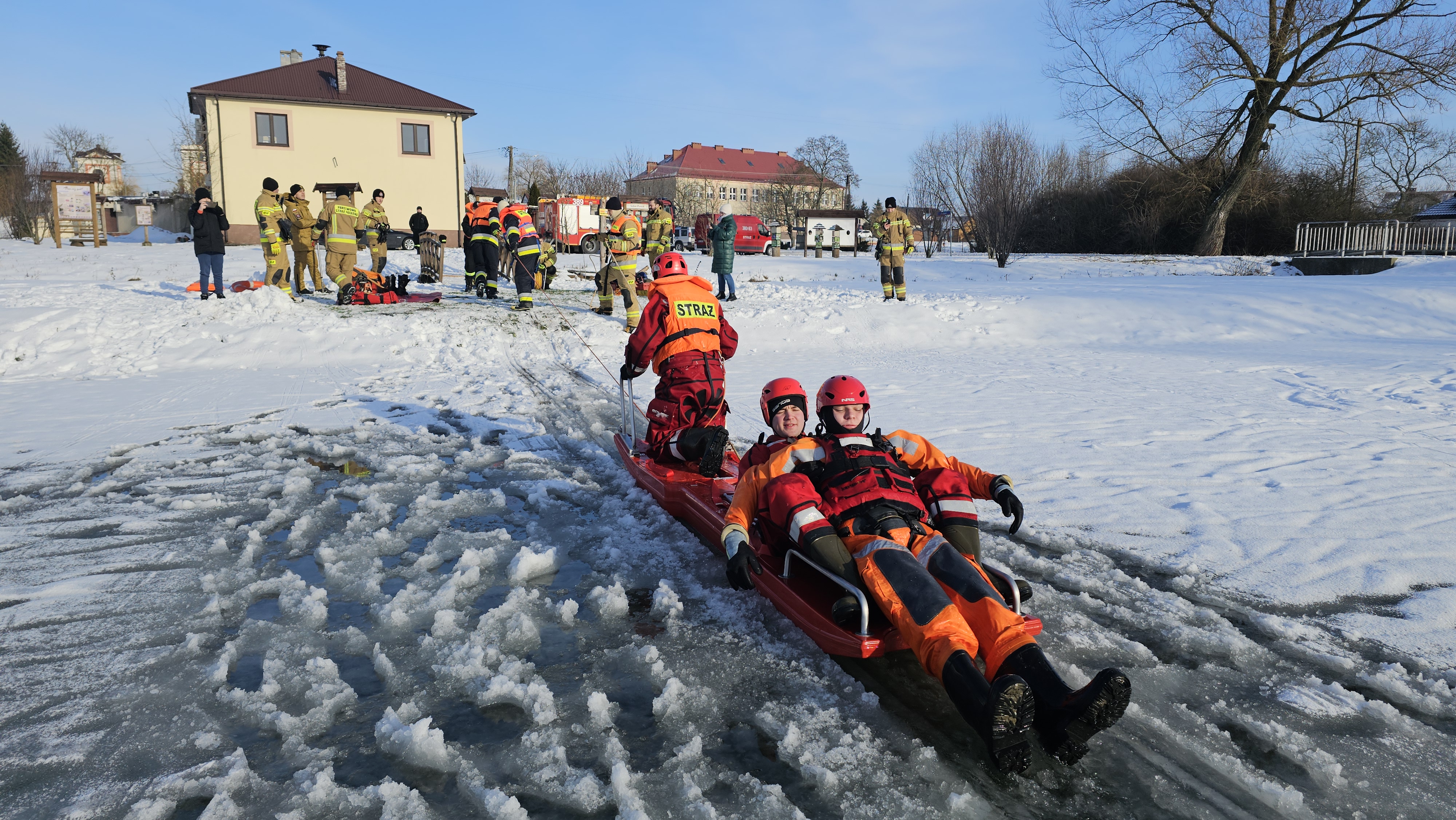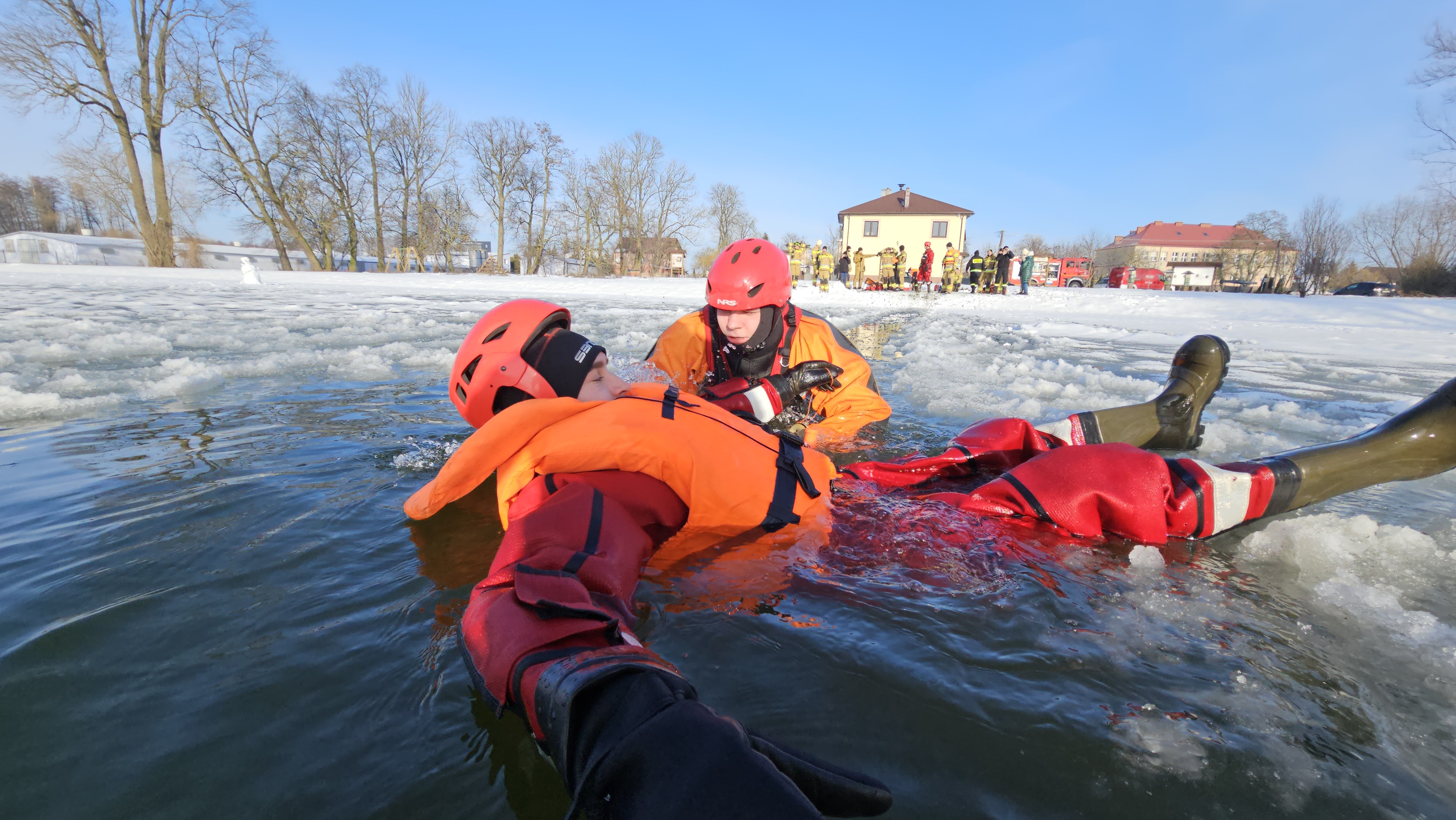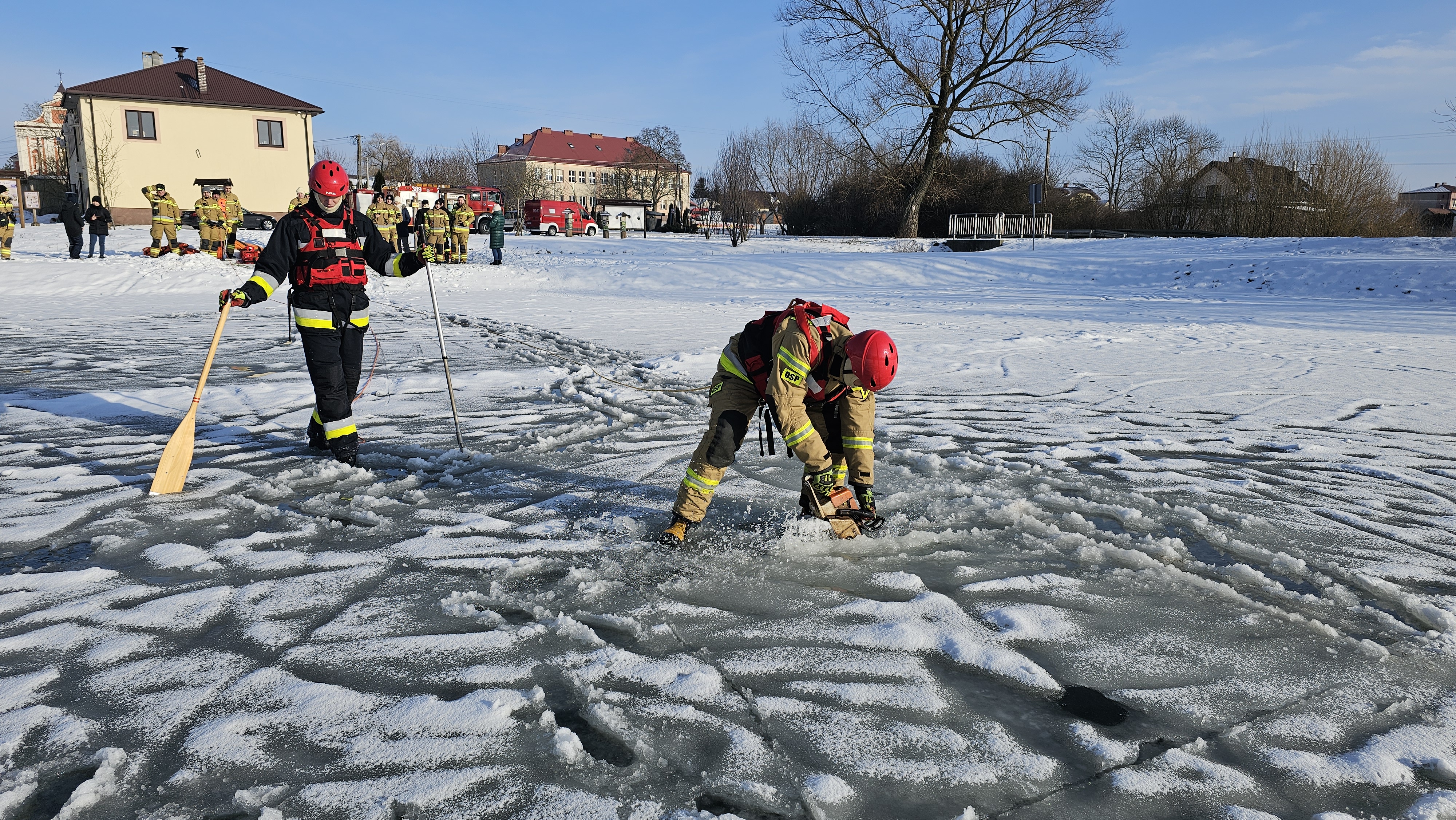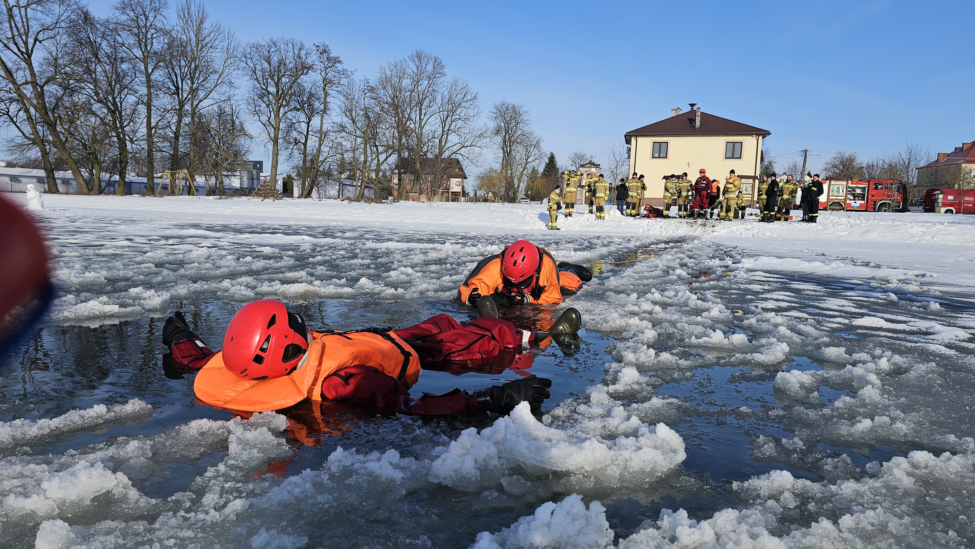 Ratownicy zabezpieczeni byli w specjalne kombinezony do pracy w wodzie, kamizelki asekuracyjne oraz wykorzystywali sprzęt przeznaczony m.in. do tego typu działań, tj. sanie lodowe, liny, koło i rzutki ratunkowe.