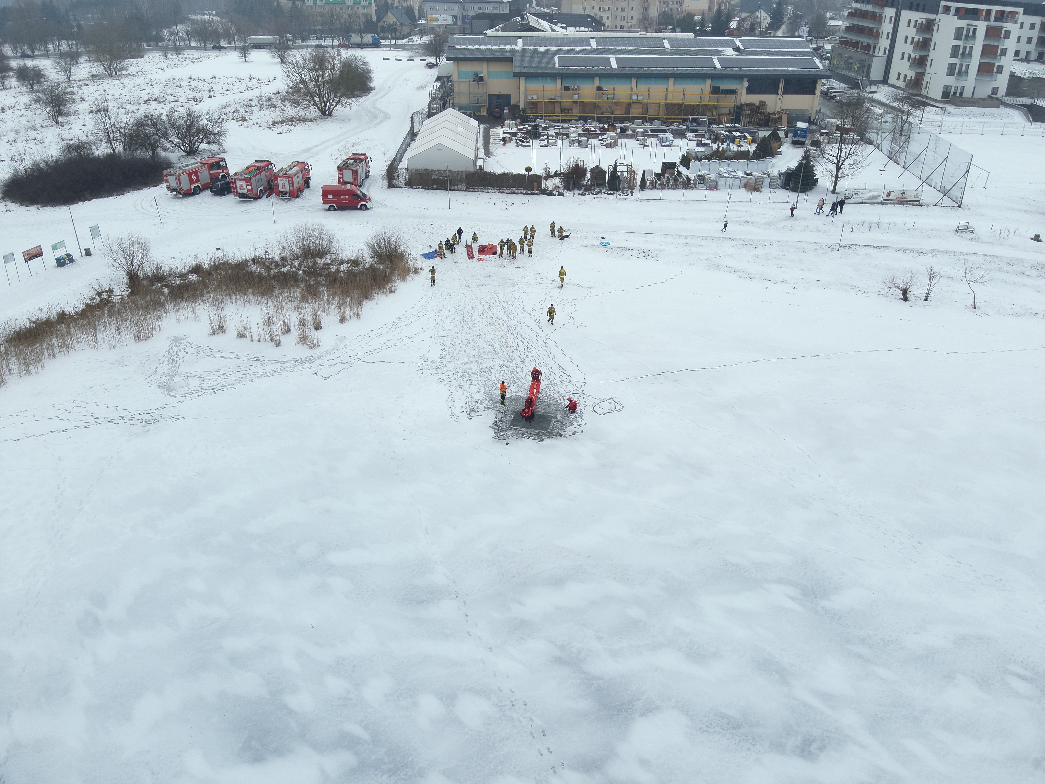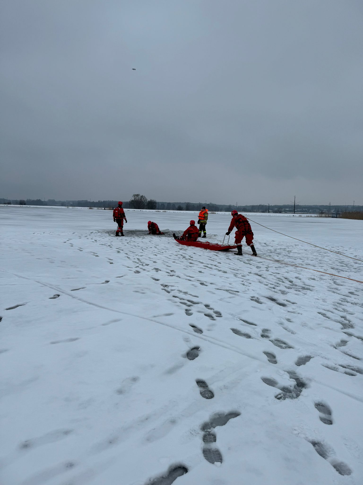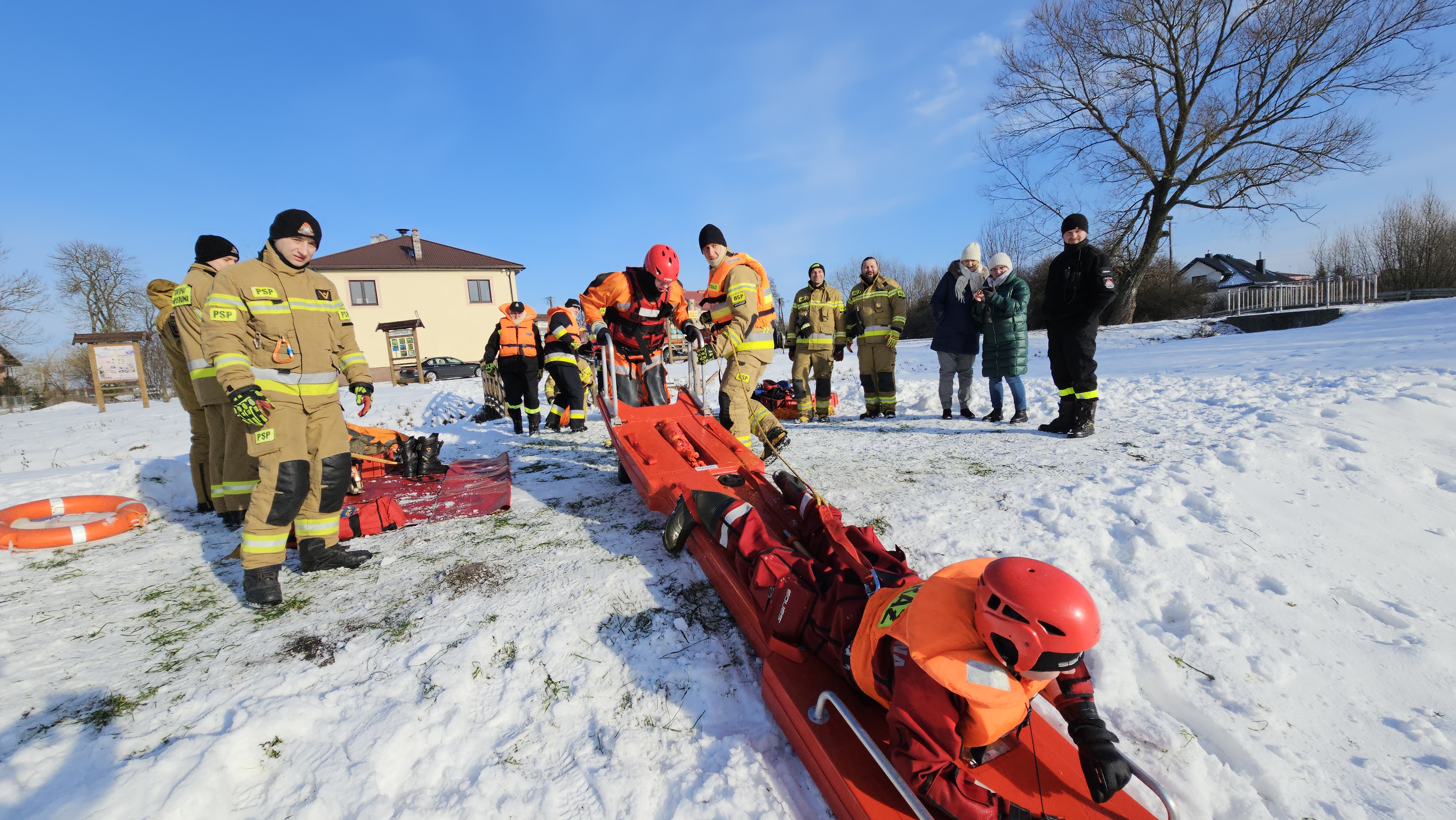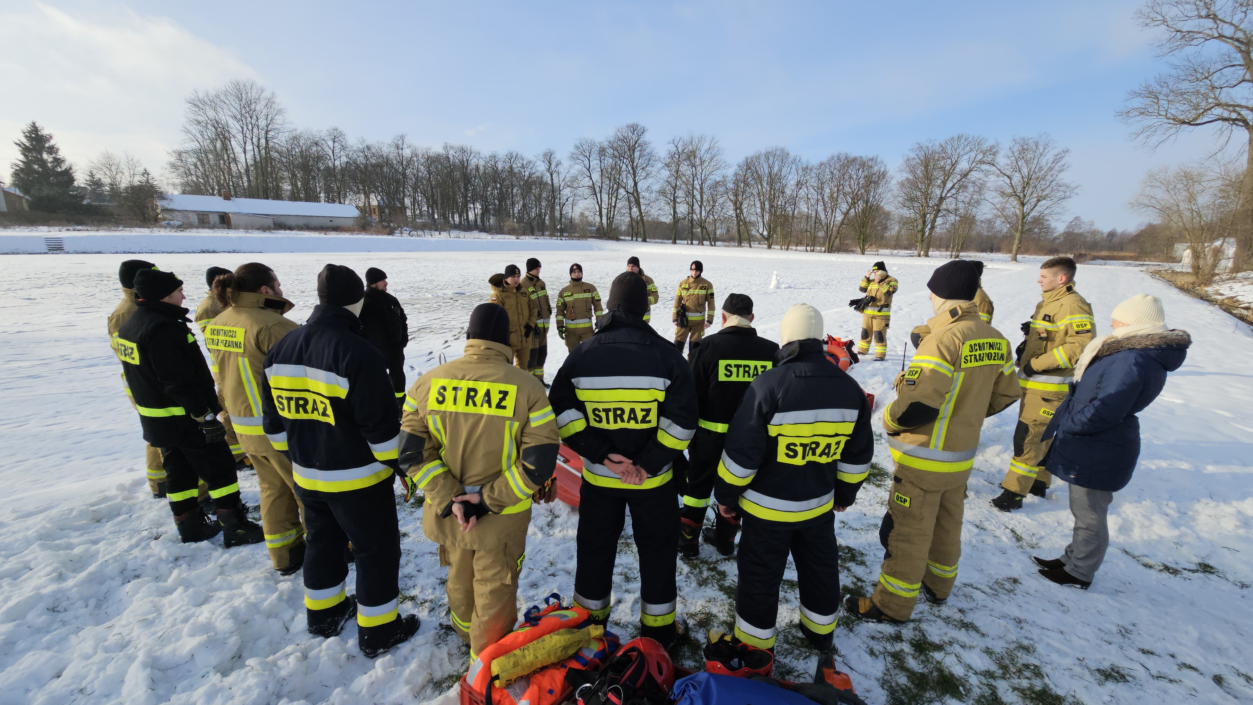 Ratownicy zabezpieczeni byli w specjalne kombinezony do pracy w wodzie, kamizelki asekuracyjne oraz wykorzystywali sprzęt przeznaczony m.in. do tego typu działań, tj. sanie lodowe, liny, koło i rzutki ratunkowe.