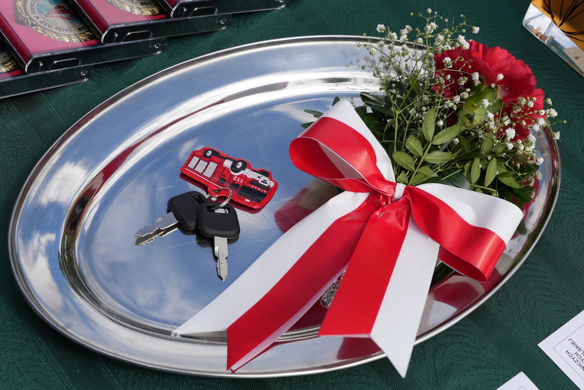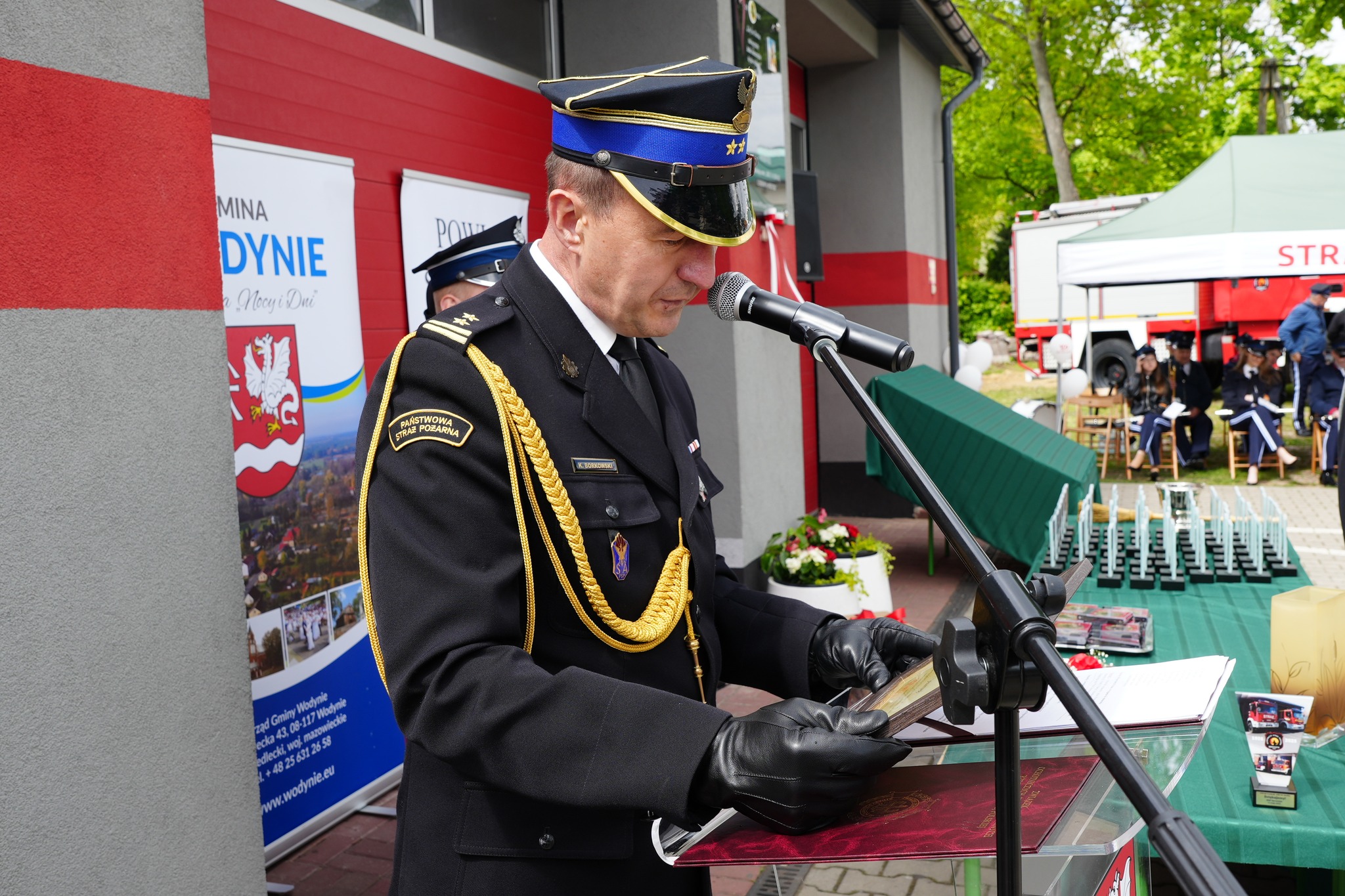 Podczas uroczystości nastąpiło również odsłonięcie tablicy pamiątkowej, upamiętniającej ten piękny jubileusz, a także dokonano poświęcenia nowego samochodu ratowniczo-gaśniczego, zakupionego dzięki dotacji gminnej.
