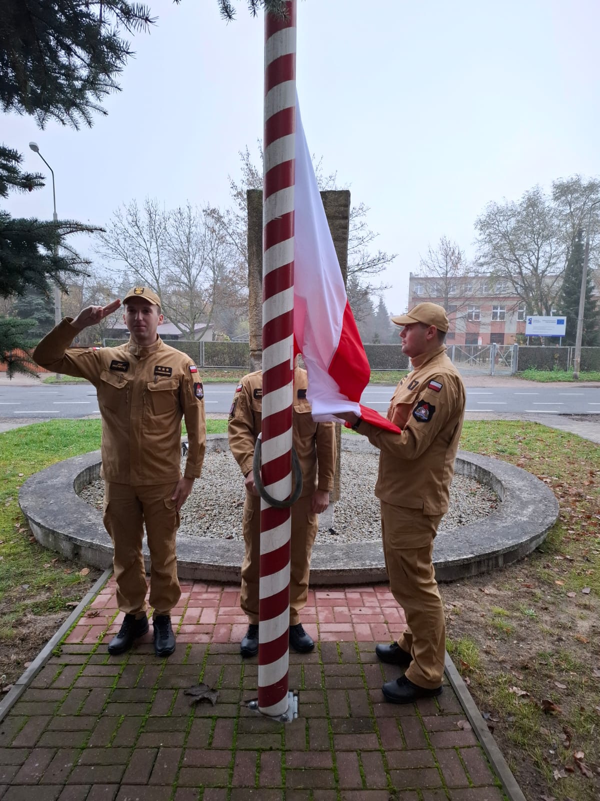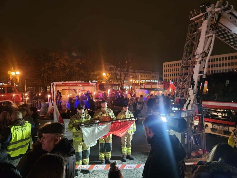 Strażacy z Jednostki Ratowniczo-Gaśniczej nr 1 na placu przed Komendą Miejską Państwowej Straży Pożarnej uczcili święto poprzez podniesienie flagi państwowej na maszt oraz odegranie i odśpiewanie Mazurka Dąbrowskiego z okazji Narodowego Święta Niepodległości.