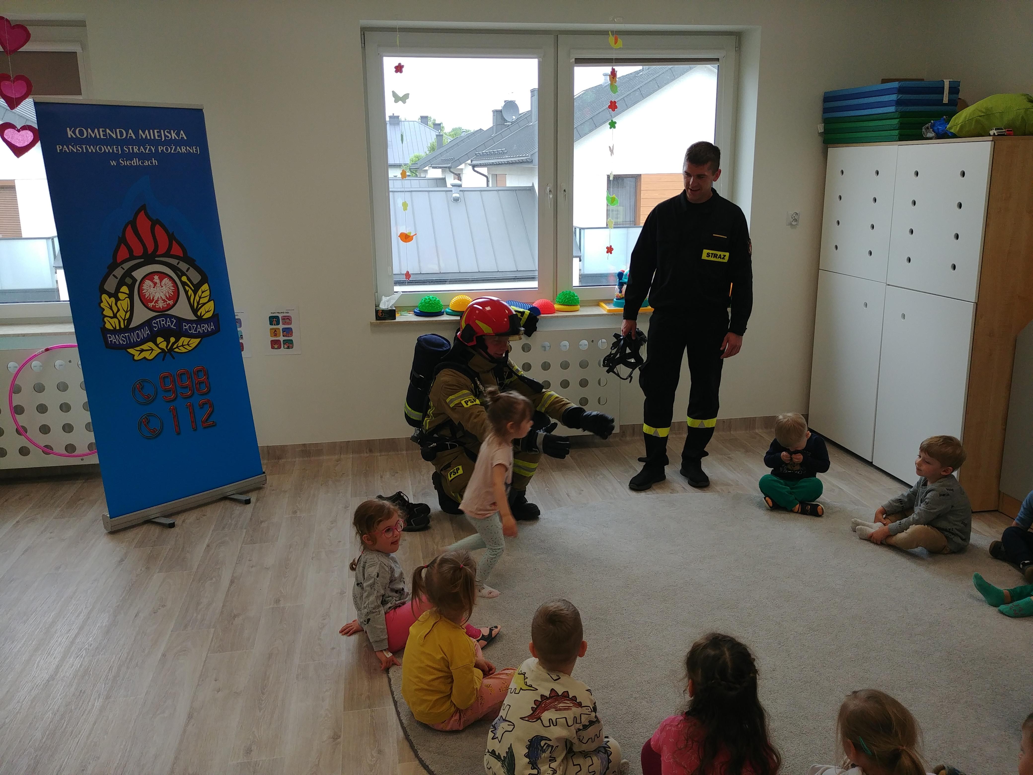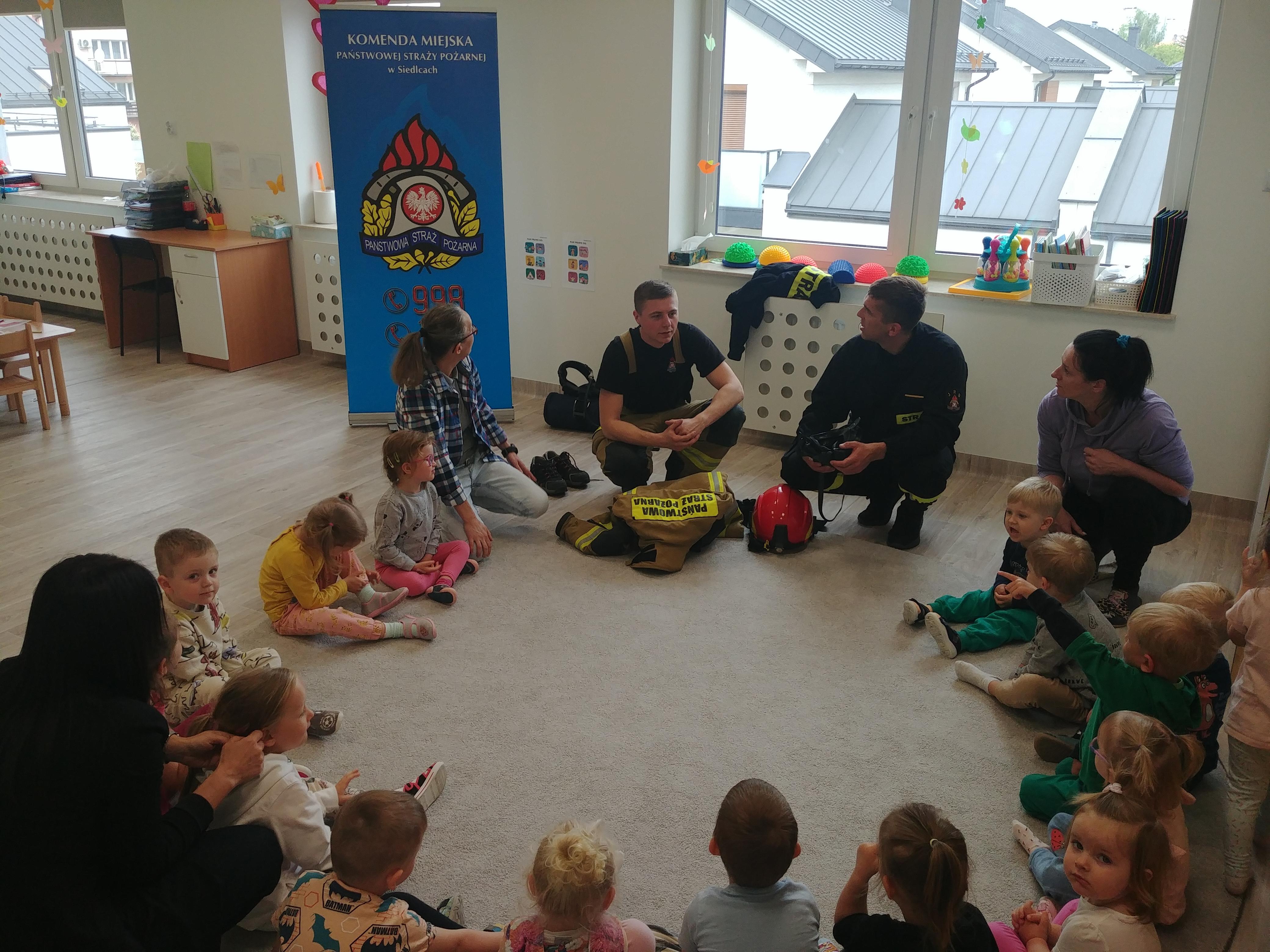 Strażacy z Jednostki Ratowniczo – Gaśniczej nr 2 Komendy Miejskiej PSP w Siedlcach, podczas spotkania przybliżyli dzieciom specyfikę pracy strażaka, zaprezentowali umundurowanie, zapoznali z podstawowym sprzętem używanym podczas działań ratowniczo-gaśniczych.