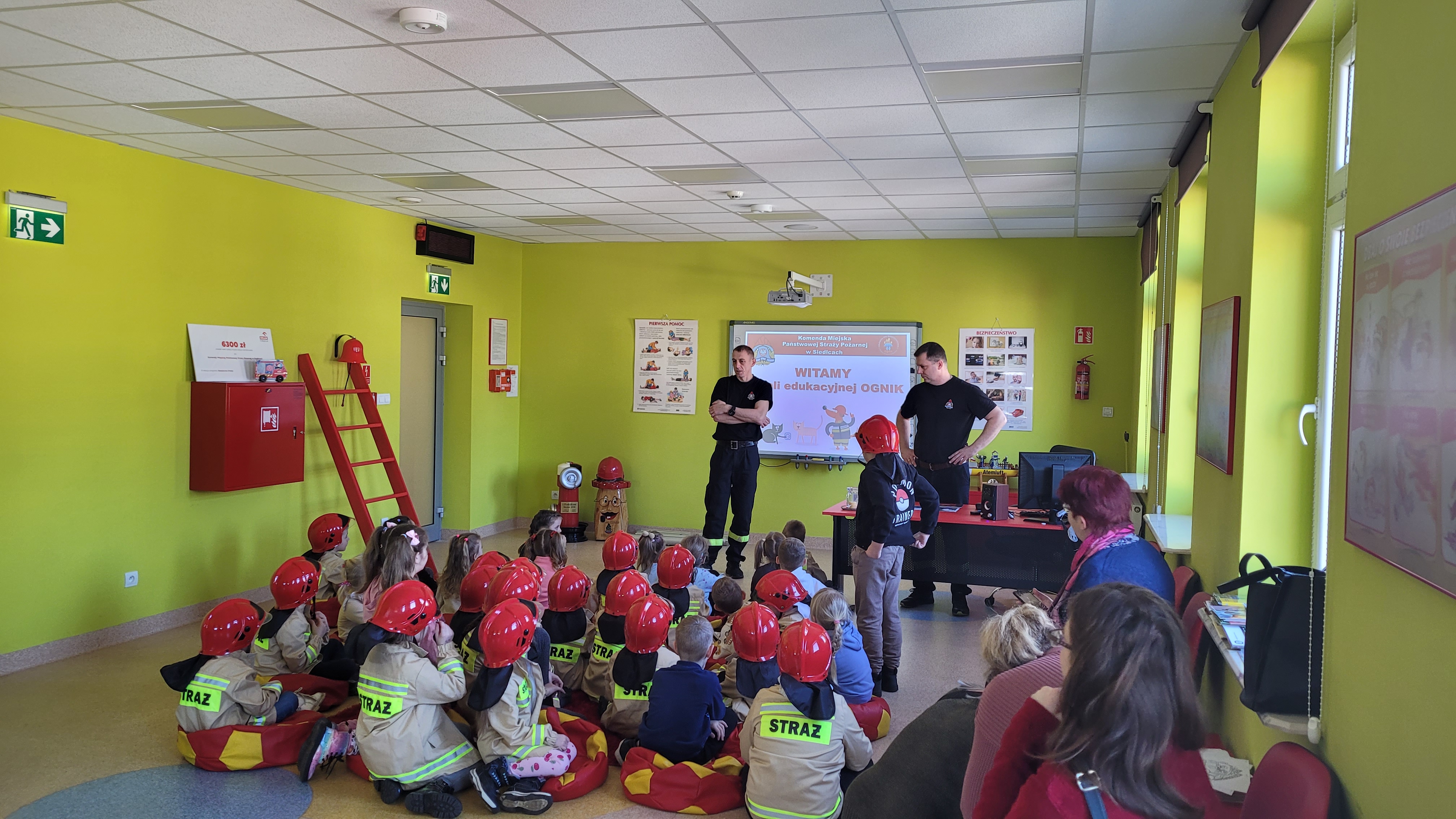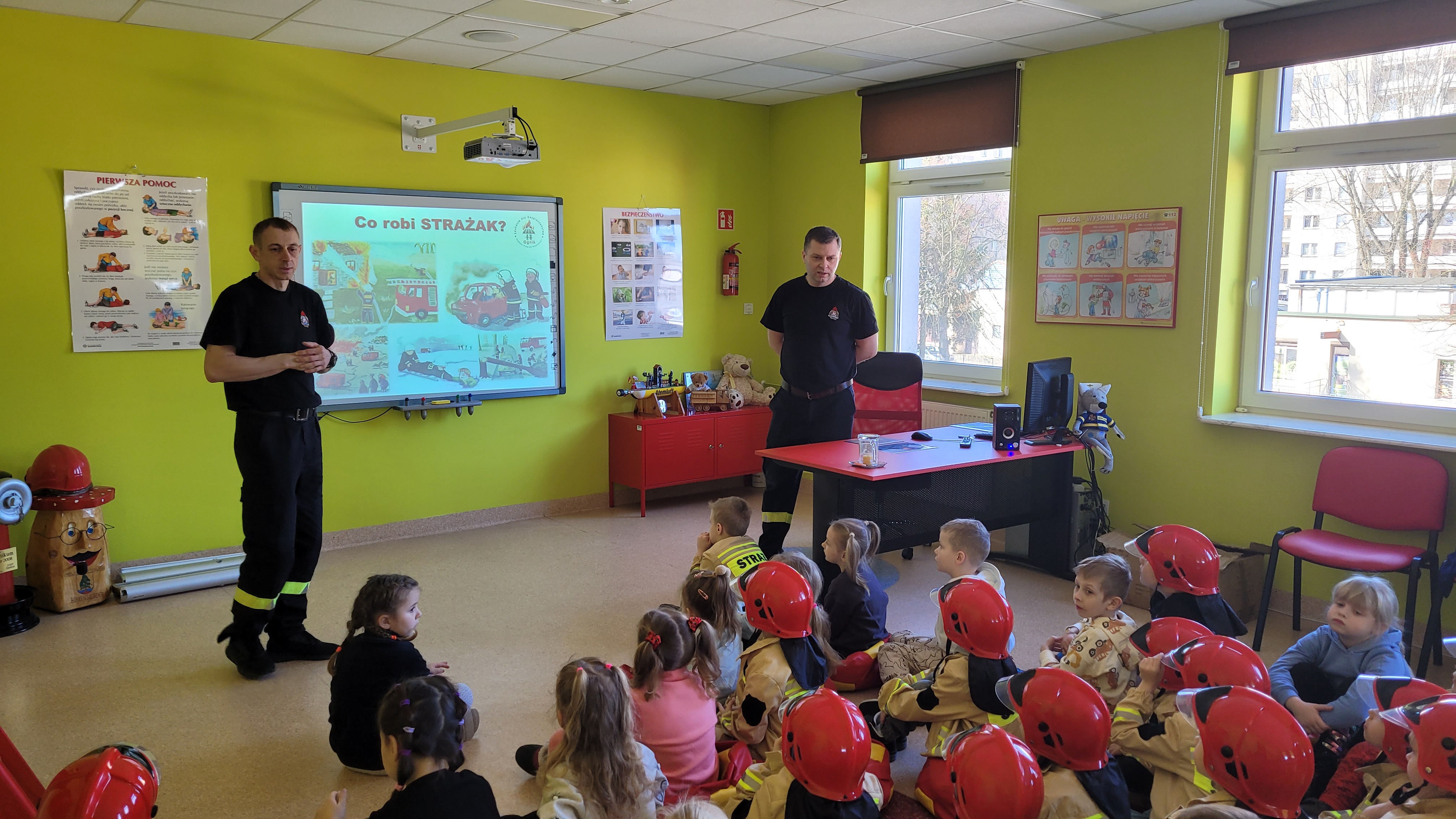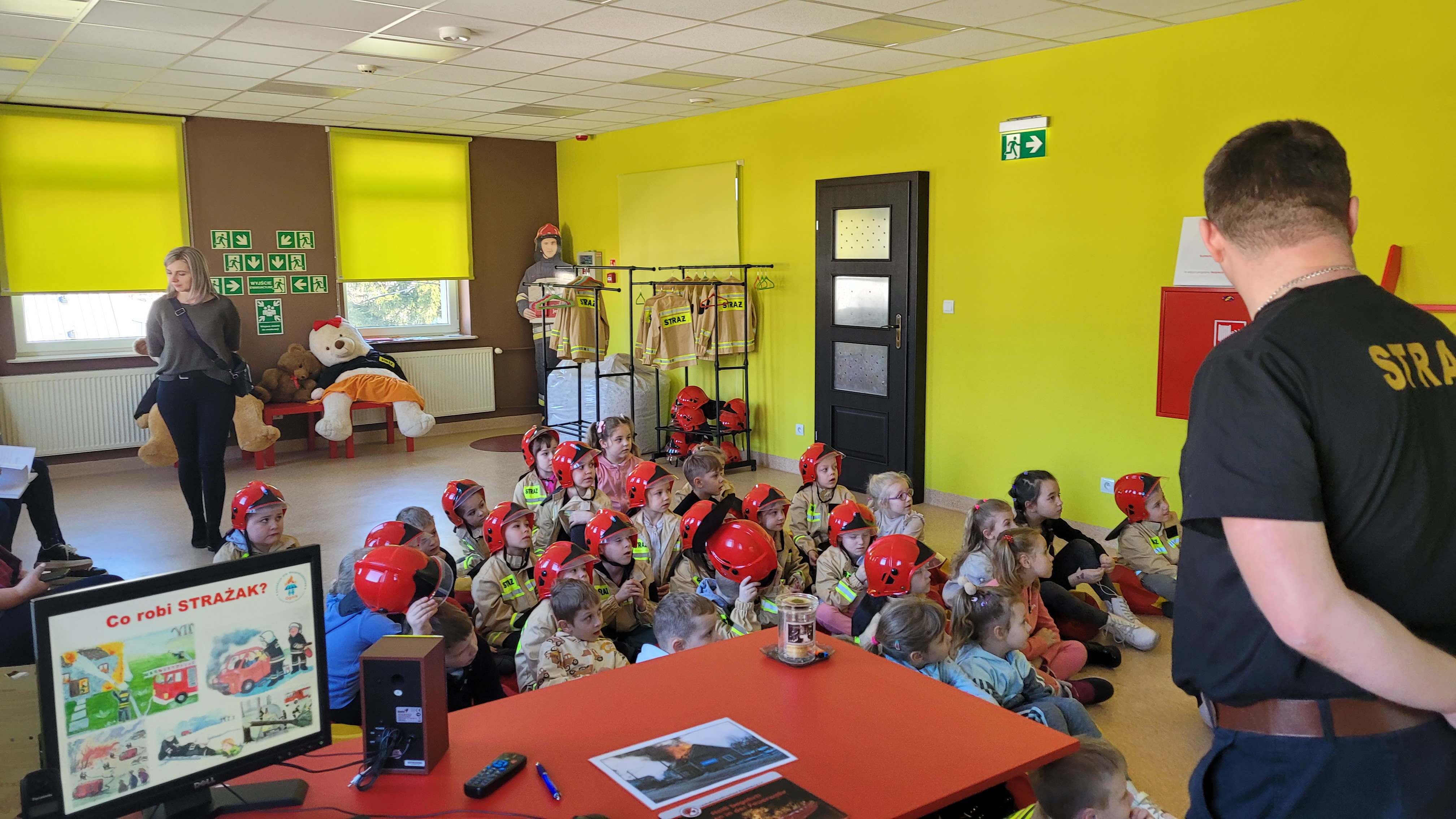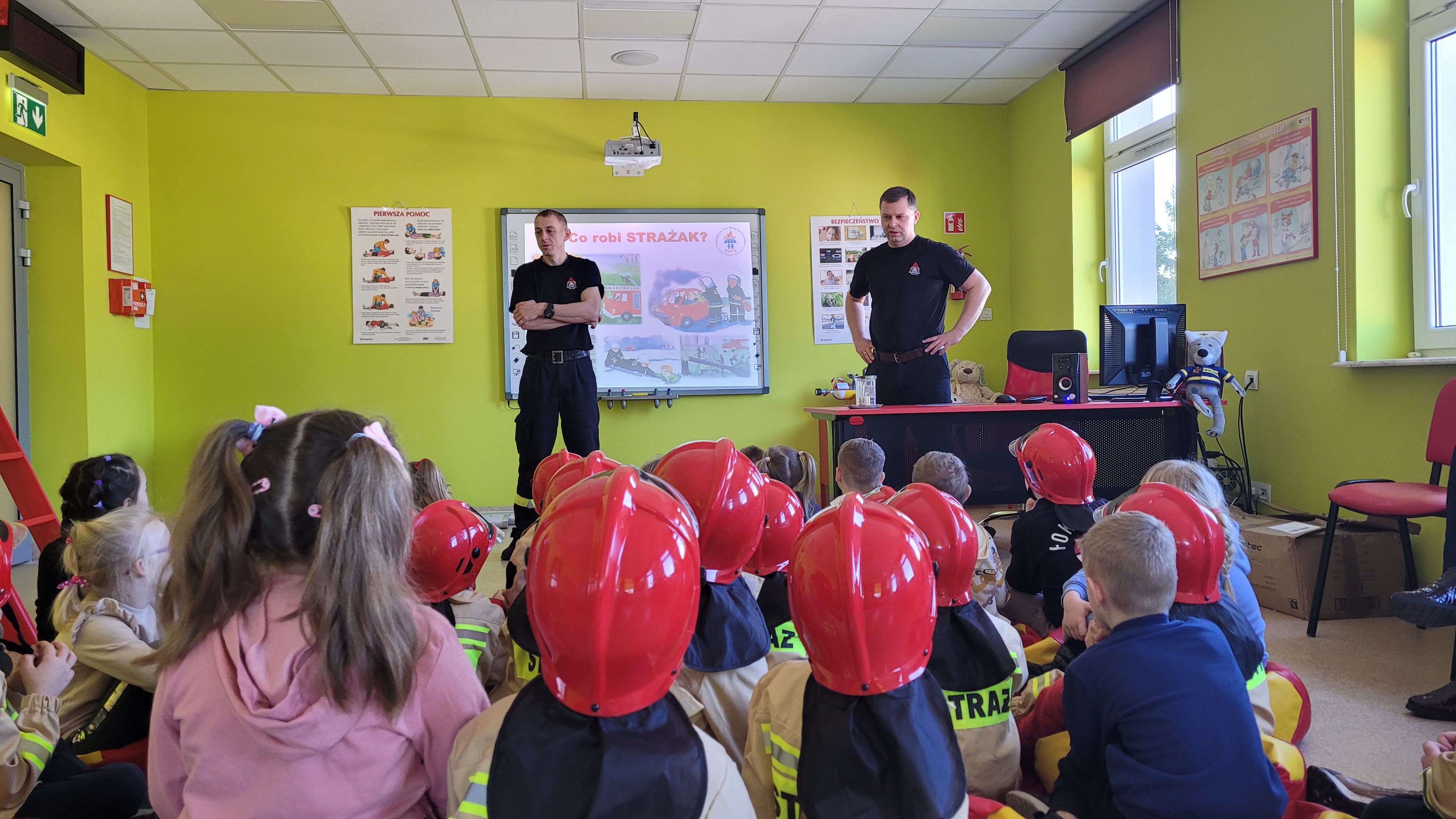 Dzieci w trakcie wizyty ubrane były w bluzy i hełmy strażackie. Prowadzący zajęcia ogn. Grzegorz Dziewulski i ogn. Hubert Turski przybliżyli specyfikę pracy strażaka. Młodzi słuchacze w trakcie spotkania miały okazję zapoznać się z zagrożeniami, z którymi mogą spotkać się w domu oraz szkole. Dzieci miały możliwość przećwiczenia prawidłowego wezwania straży pożarnej w trakcie rozmowy z Dyżurnym operacyjnym powiatu.
