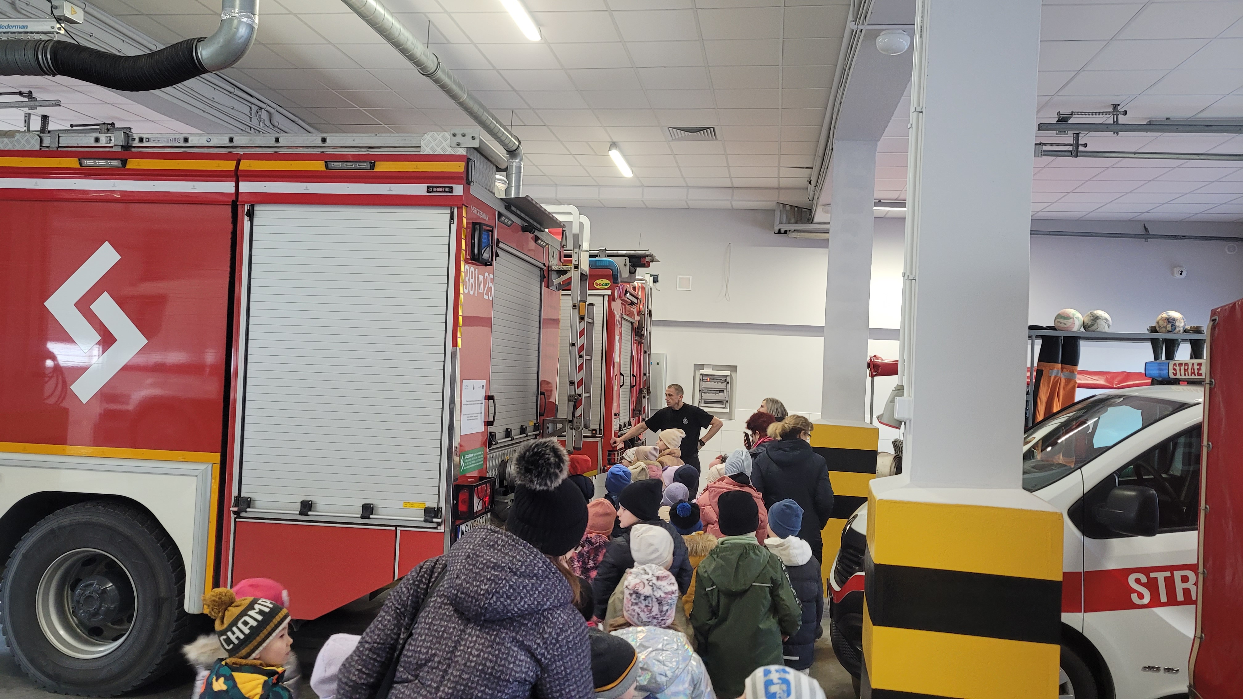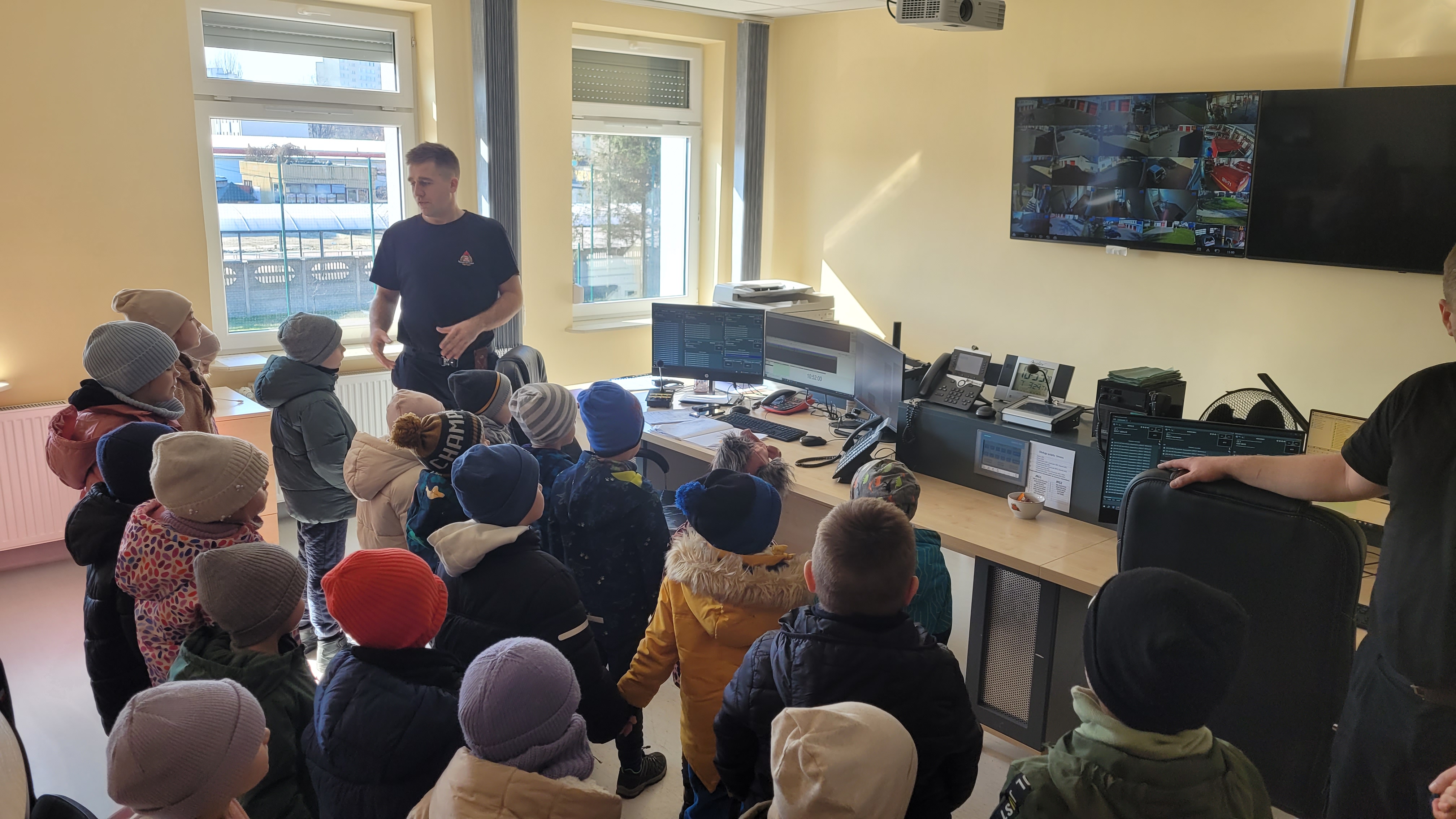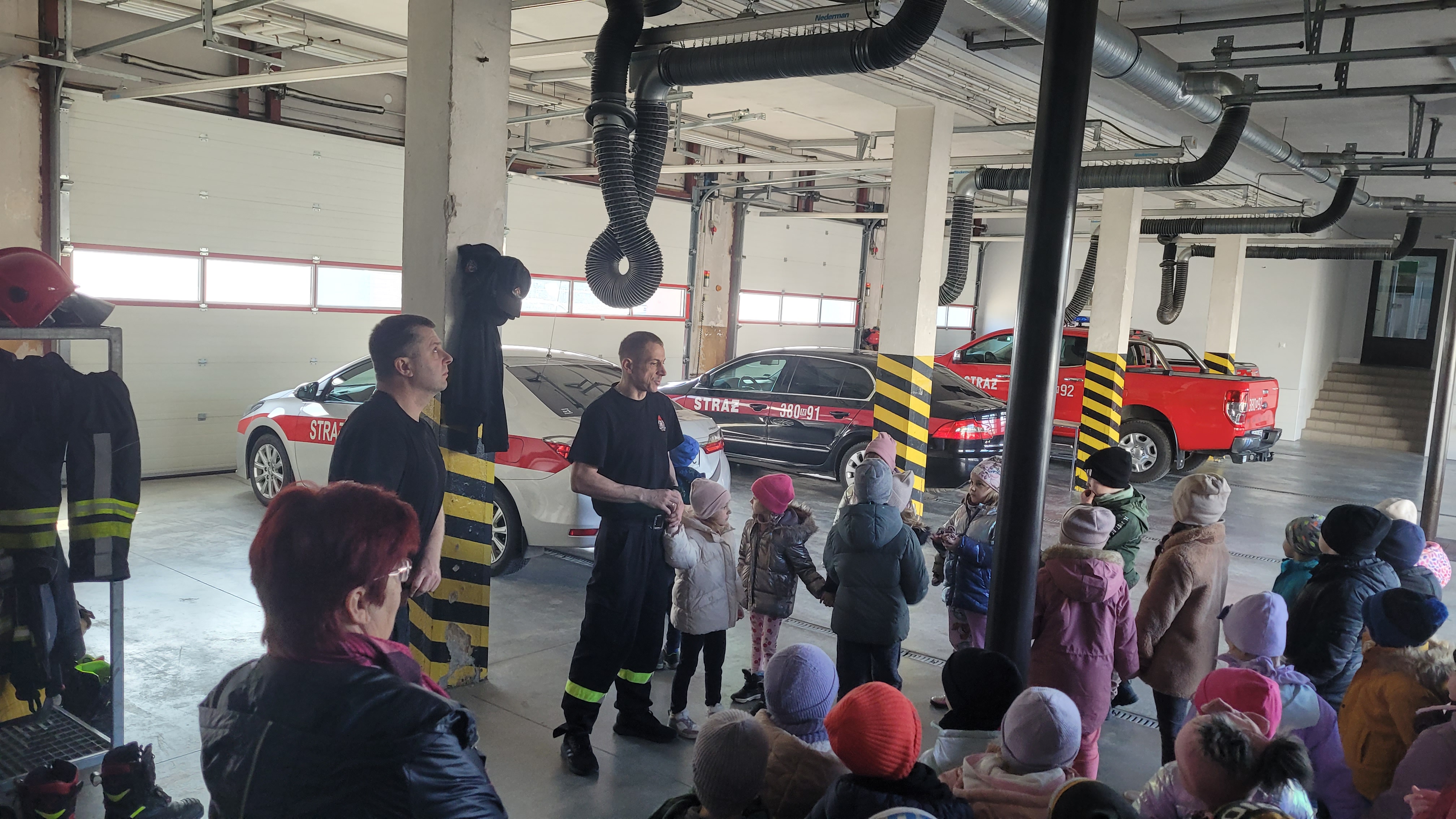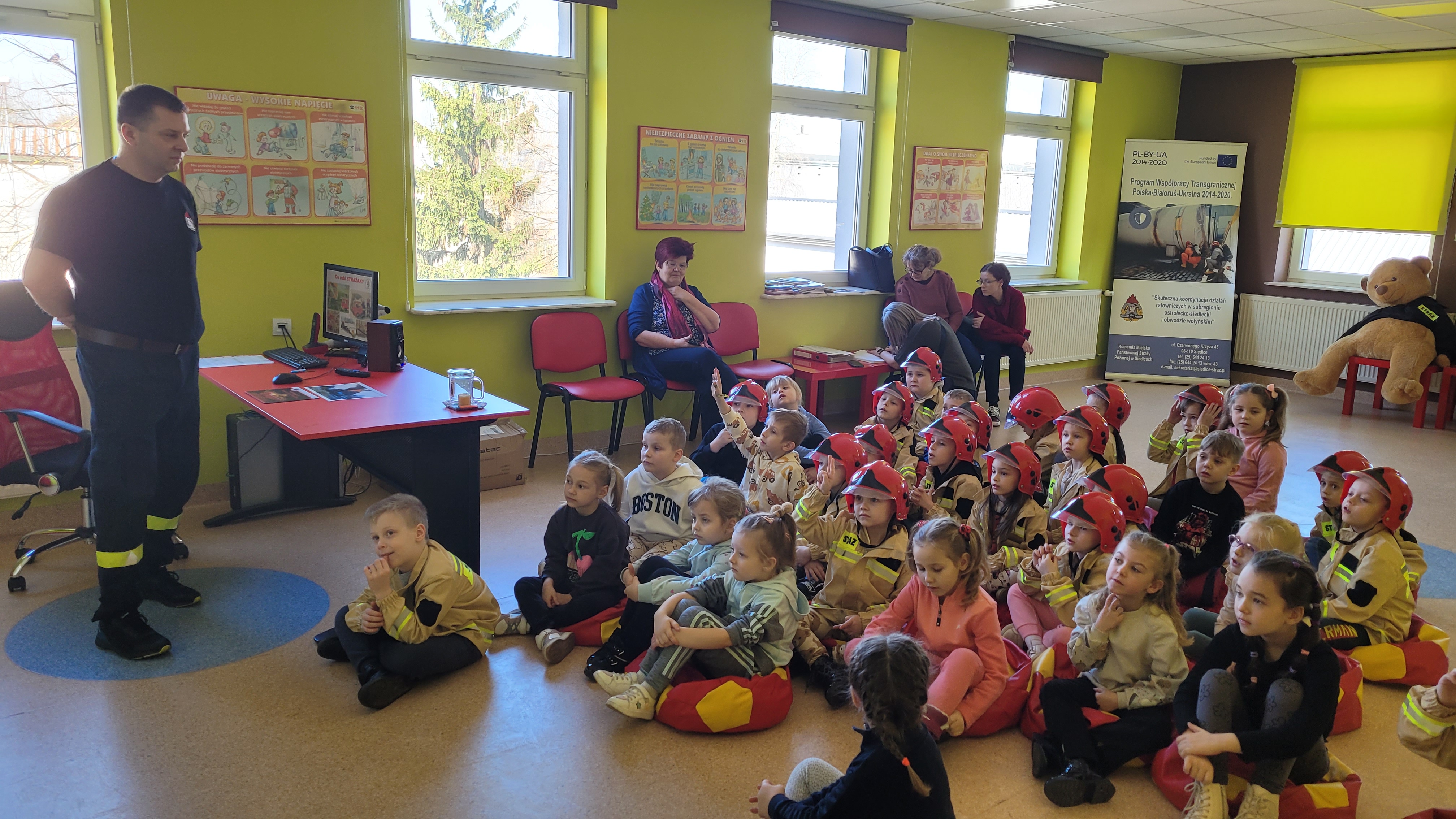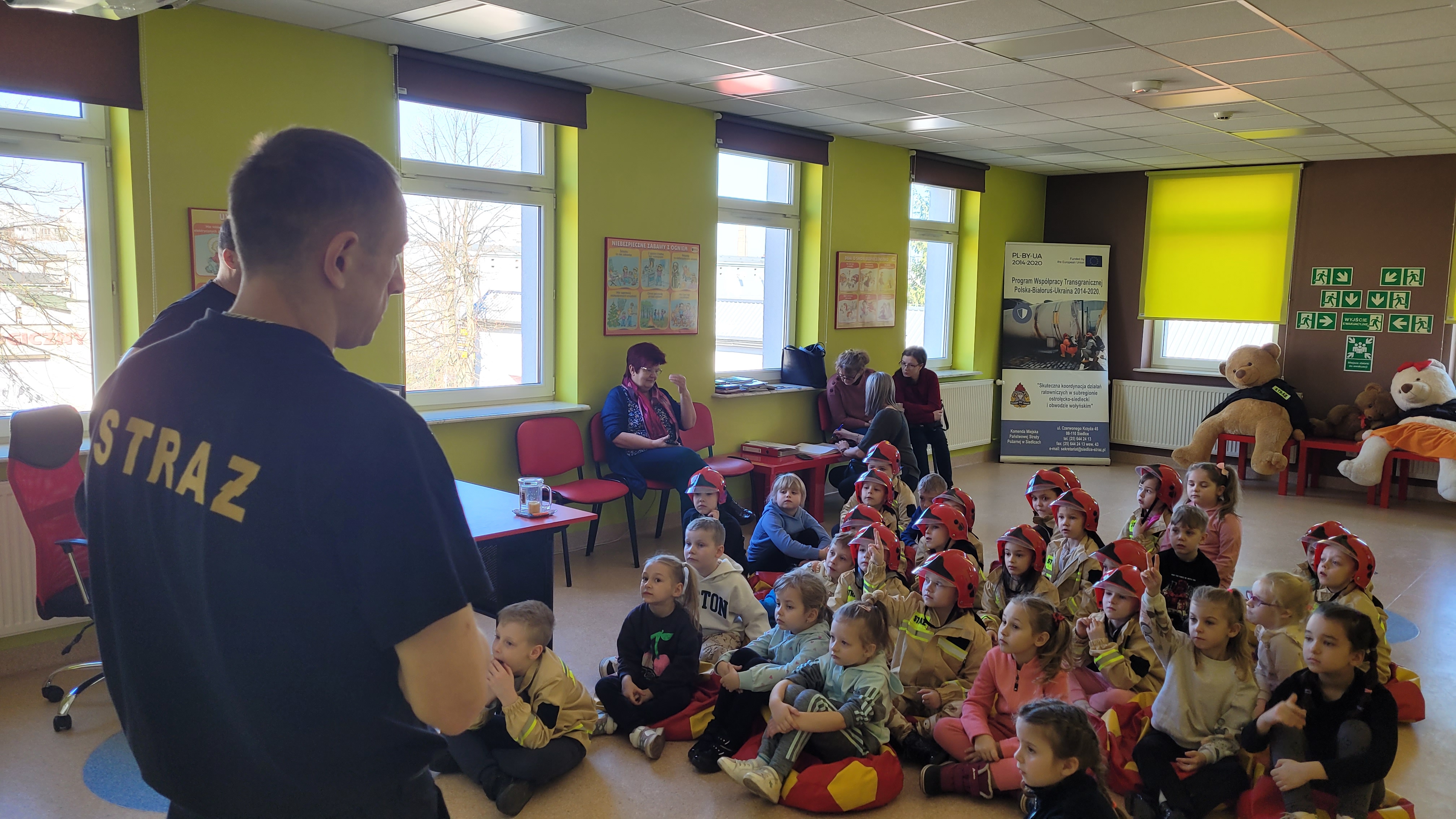 Dzieci w trakcie wizyty ubrane były w bluzy i hełmy strażackie. Prowadzący zajęcia ogn. Grzegorz Dziewulski i ogn. Hubert Turski przybliżyli specyfikę pracy strażaka. Młodzi słuchacze w trakcie spotkania miały okazję zapoznać się z zagrożeniami, z którymi mogą spotkać się w domu oraz szkole. Dzieci miały możliwość przećwiczenia prawidłowego wezwania straży pożarnej w trakcie rozmowy z Dyżurnym operacyjnym powiatu.