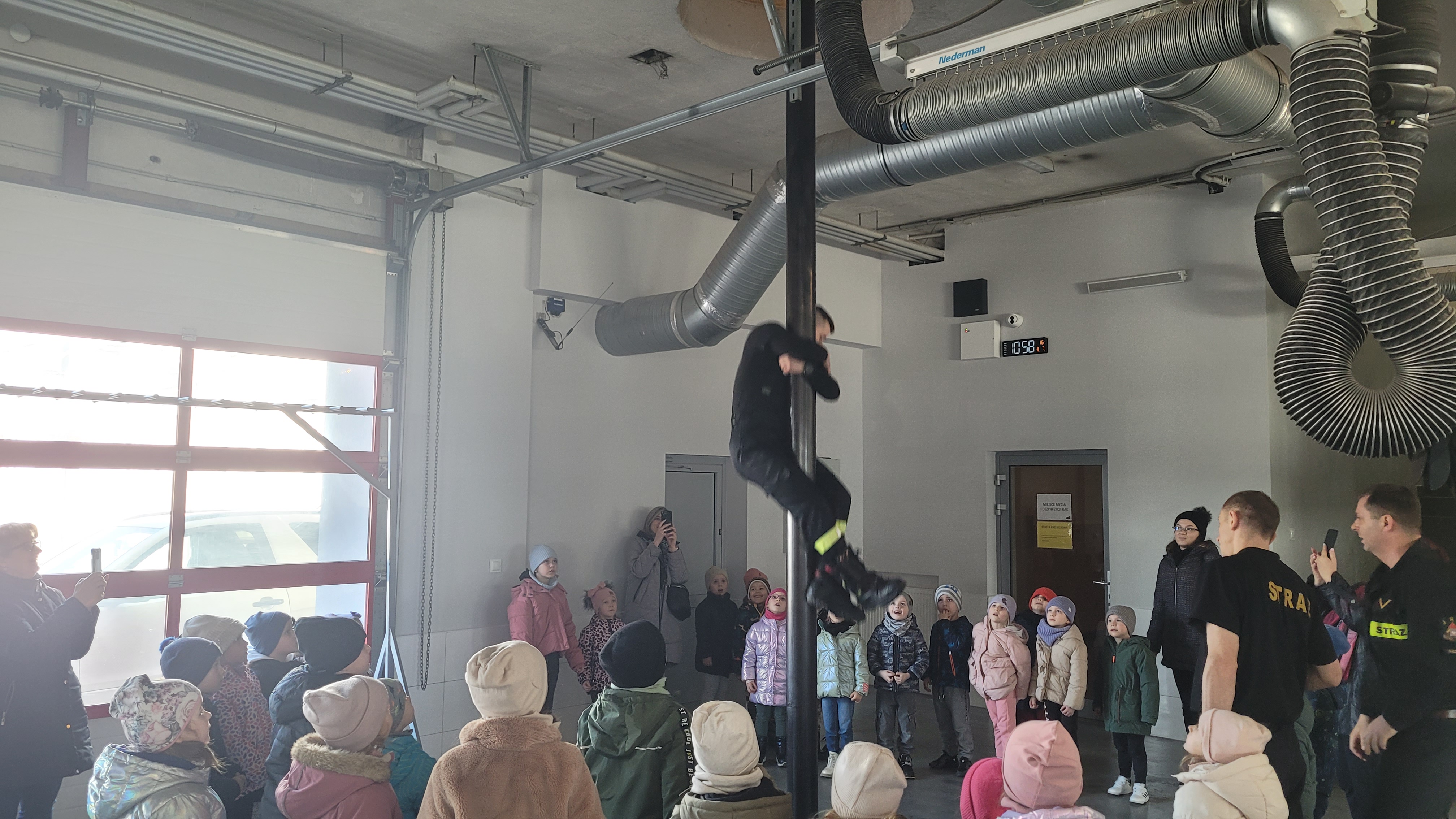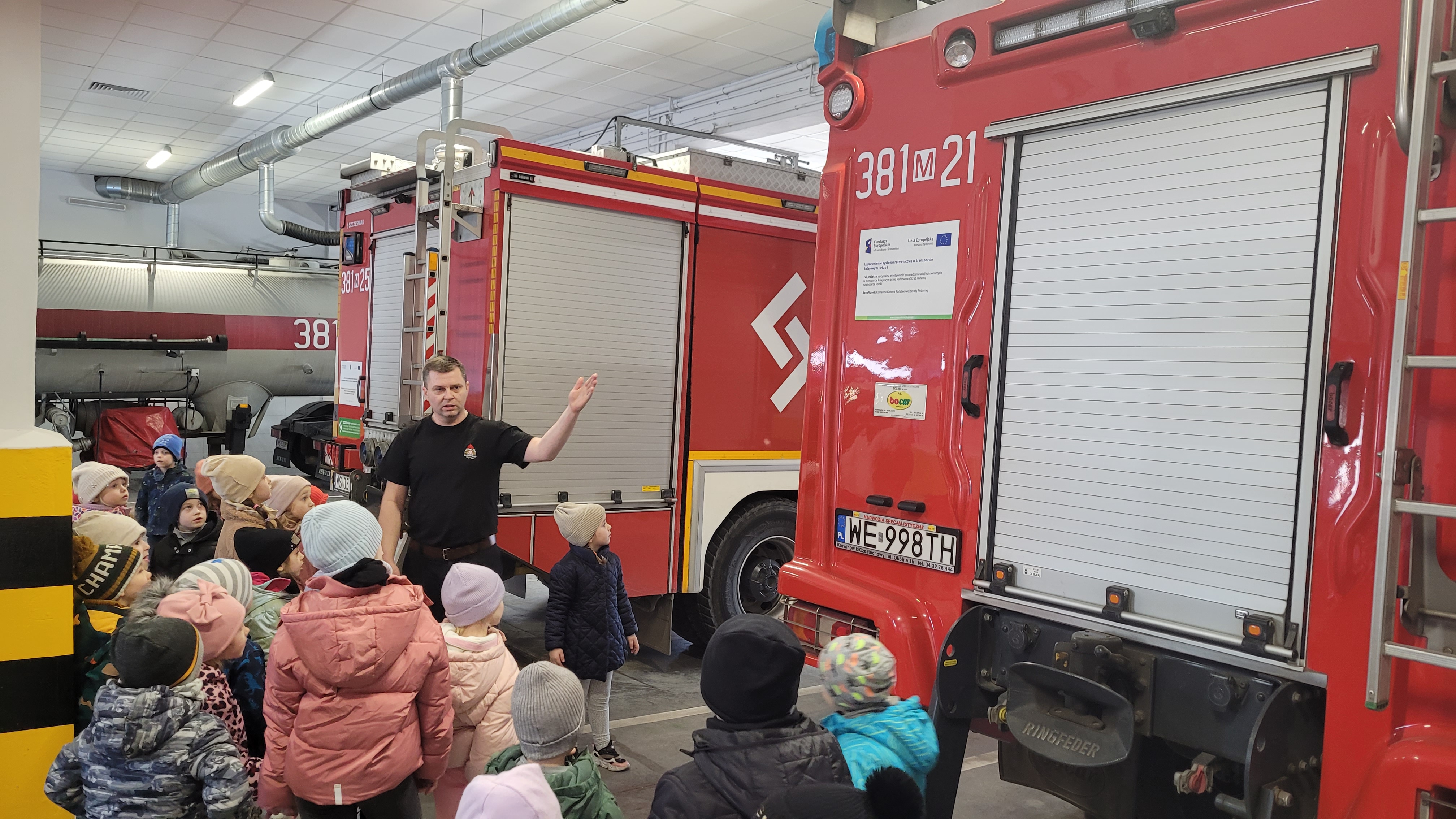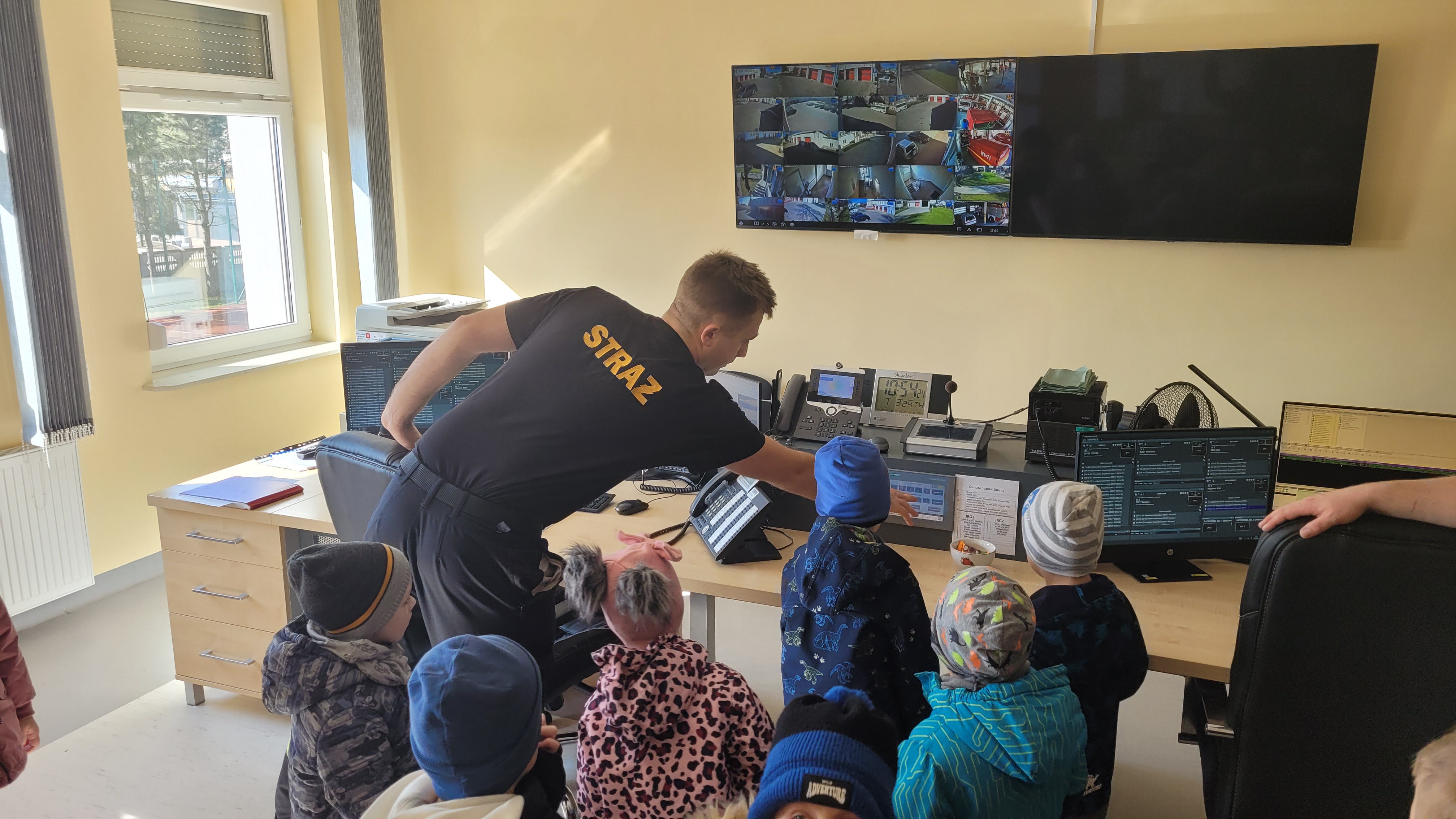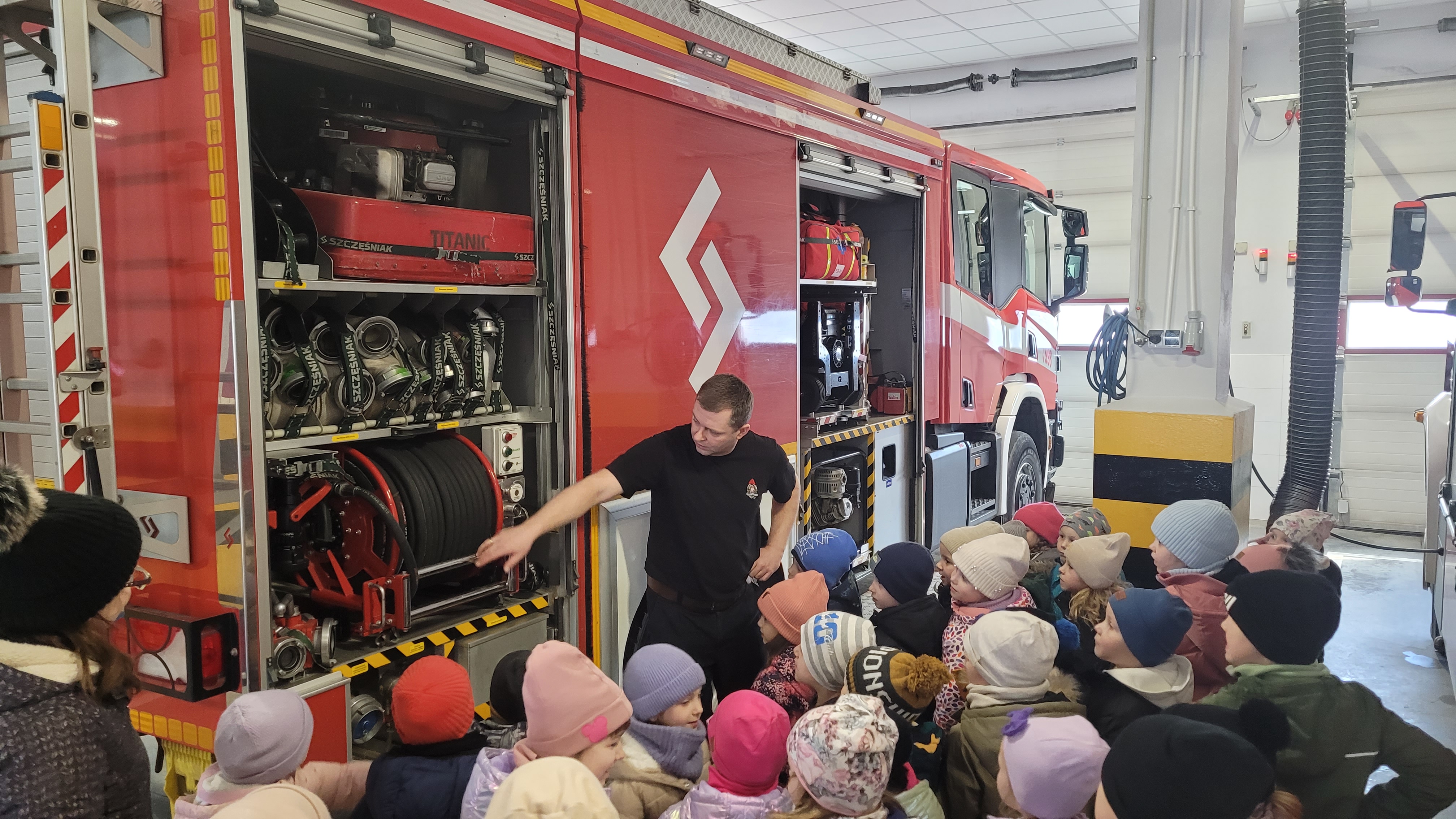 Dzieci w trakcie wizyty ubrane były w bluzy i hełmy strażackie. Prowadzący zajęcia ogn. Grzegorz Dziewulski i ogn. Hubert Turski przybliżyli specyfikę pracy strażaka. Młodzi słuchacze w trakcie spotkania miały okazję zapoznać się z zagrożeniami, z którymi mogą spotkać się w domu oraz szkole. Dzieci miały możliwość przećwiczenia prawidłowego wezwania straży pożarnej w trakcie rozmowy z Dyżurnym operacyjnym powiatu.
