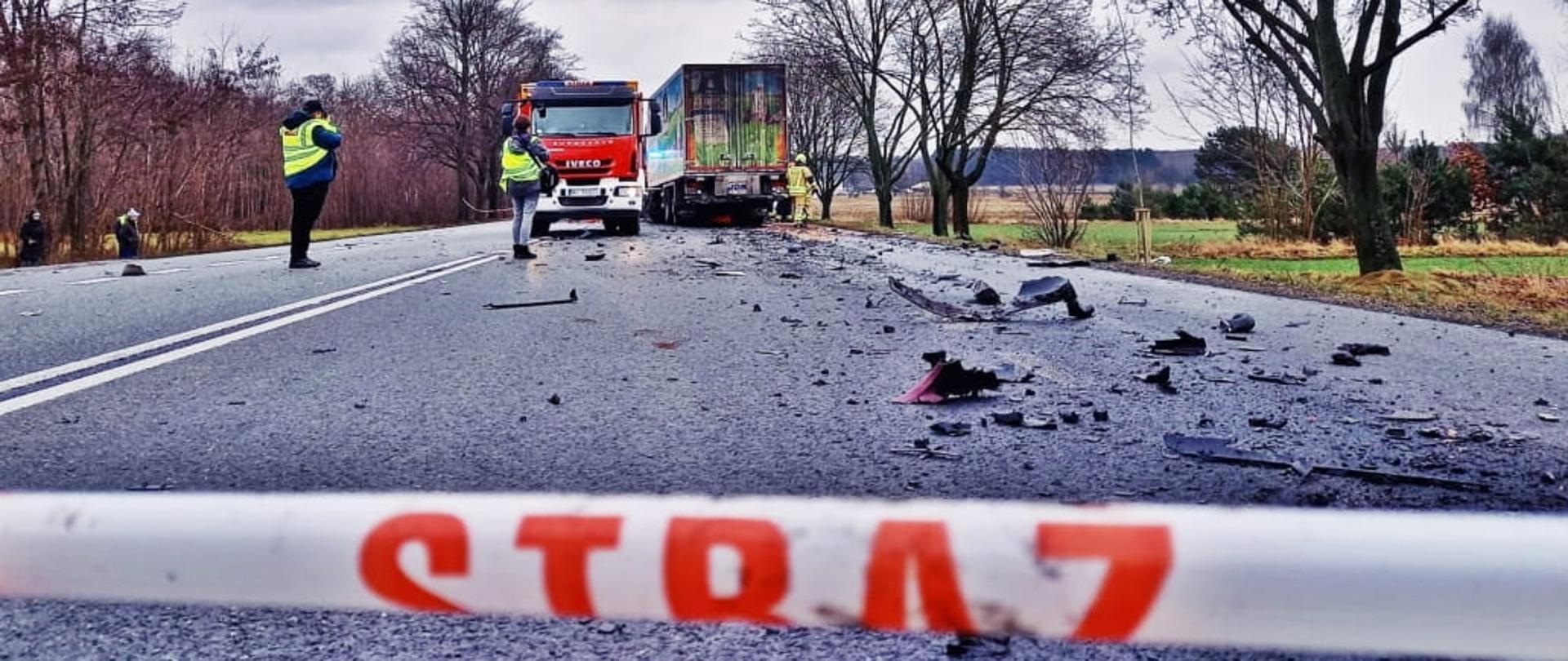 W wyniku zjechania na przeciwległy pas ruchu samochodu osobowego doszło do zderzenia czołowego z pojazdem ciężarowym, co doprowadziło do śmierci kierowcy samochodu osobowego.