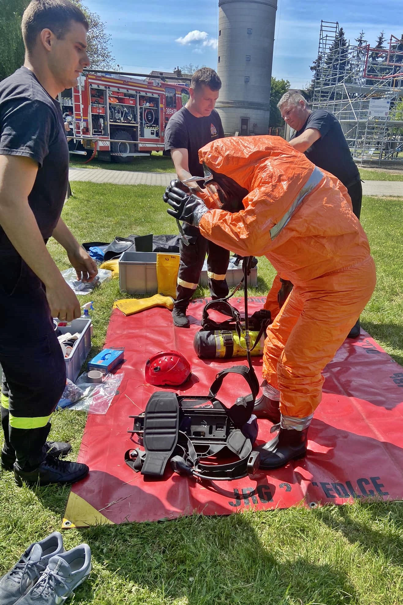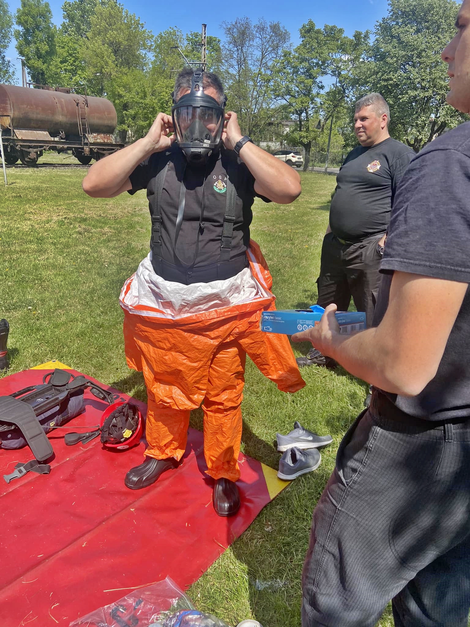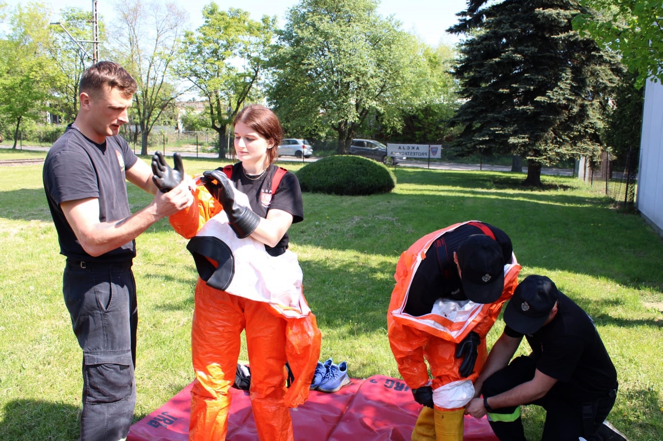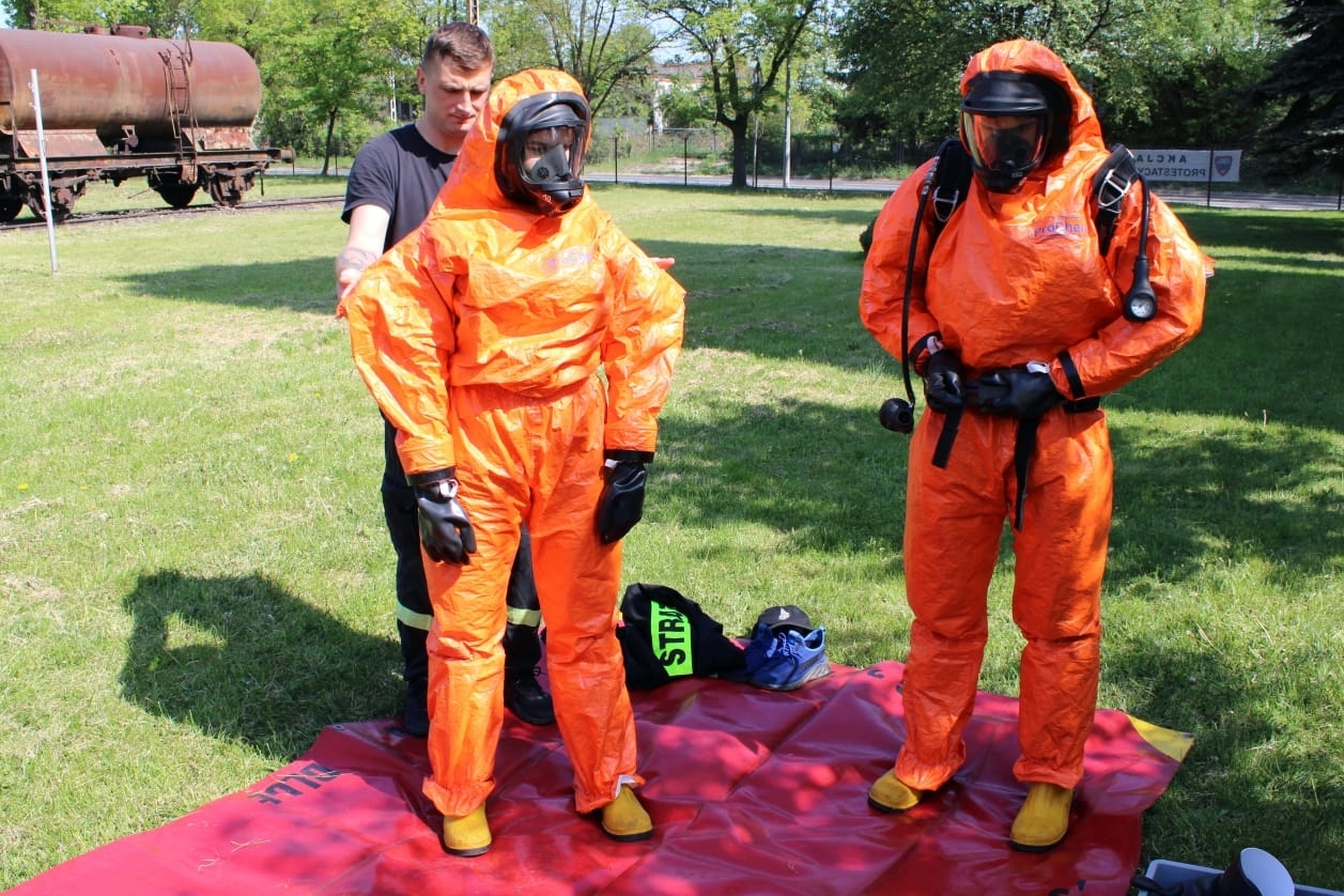 - trening poprawnego zakładania i zdejmowania środków ochrony indywidualnej, stosowanych podczas zdarzeń z zakresu ratownictwa chemiczno-ekologicznego na poziomie podstawowym oraz wykonywanie zadań w ubraniach ochrony przeciwchemicznej,