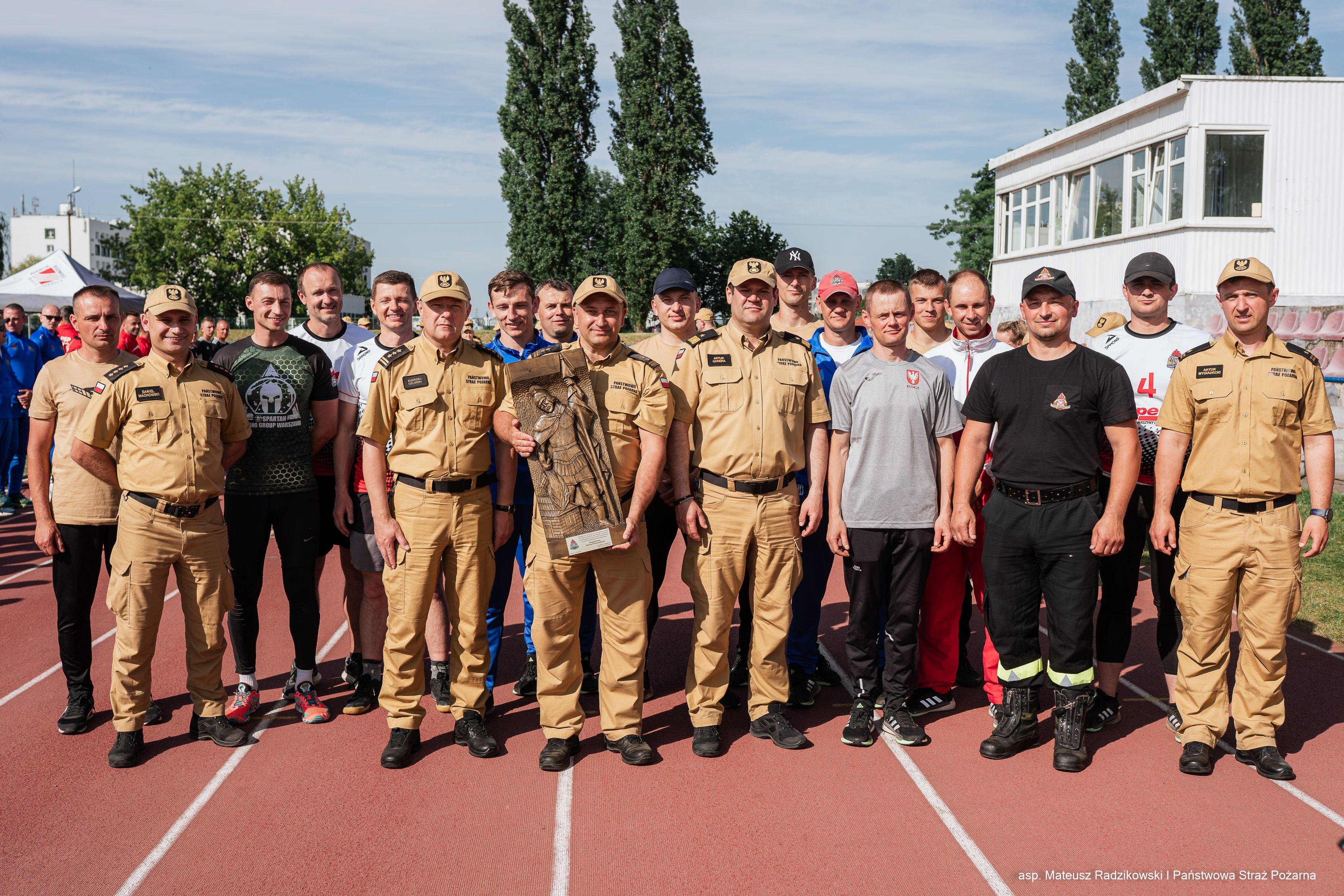Przed ogłoszeniem wyników, w związku z zakończeniem kariery - reprezentanta drużyny województwa mazowieckiego w sporcie pożarniczym - st. asp. Jacka Bierkata z Komendy Miejskiej PSP w Siedlcach, Mazowiecki Komendant Wojewódzki PSP nadbryg. Artur Gonera wraz z Komendantem Miejskim PSP w Siedlcach, Zastępcą Komendanta Miejskiego PSP w Siedlcach oraz Kadrą Województwa Mazowieckiego w Sporcie Pożarniczym wręczyli pamiątkową statuetkę st. asp. Jackowi Bierkatowi dziękując za jego sportowe osiągnięcia i wieloletnie reprezentowanie Mazowsza w sporcie pożarniczym.