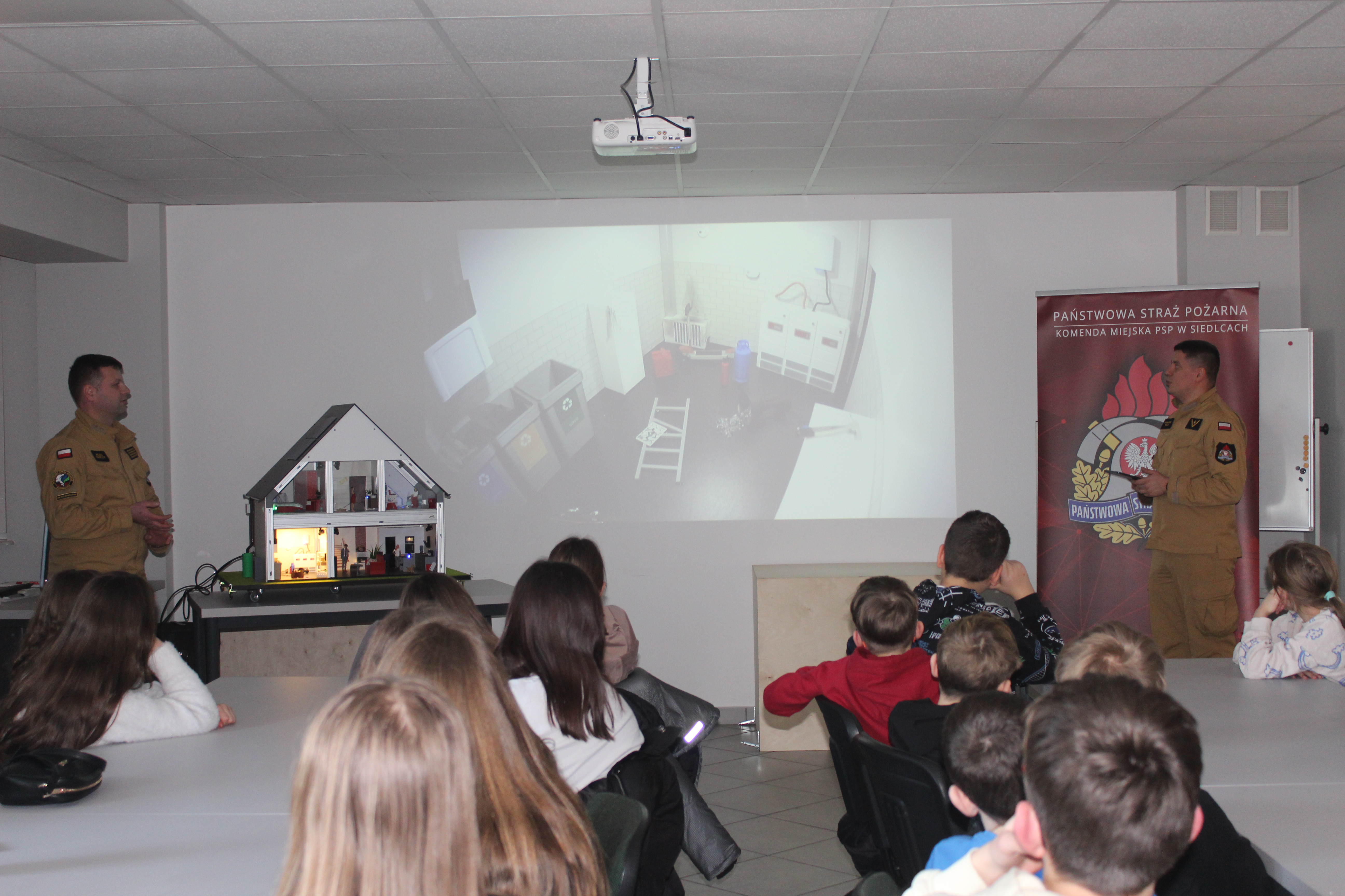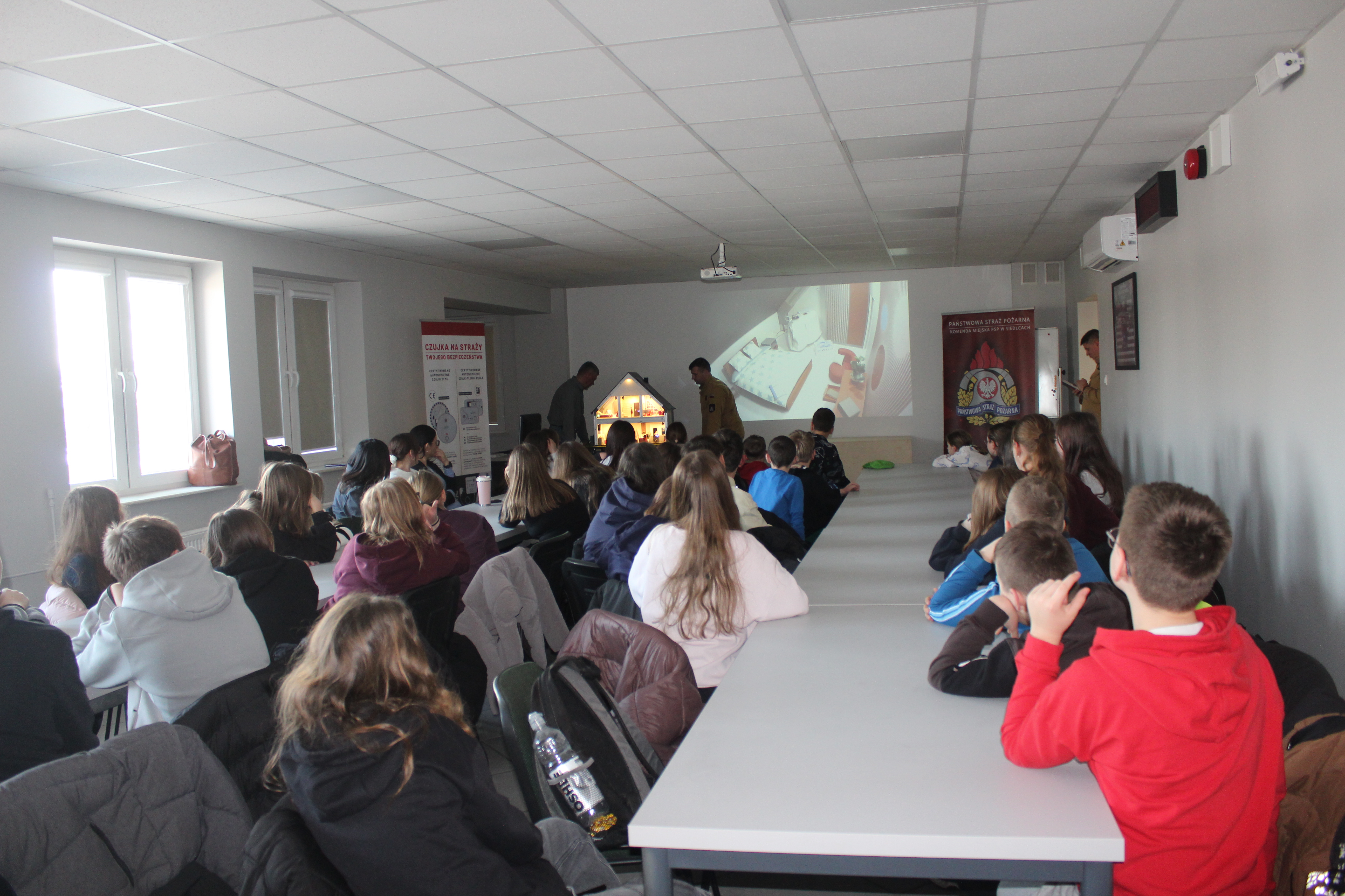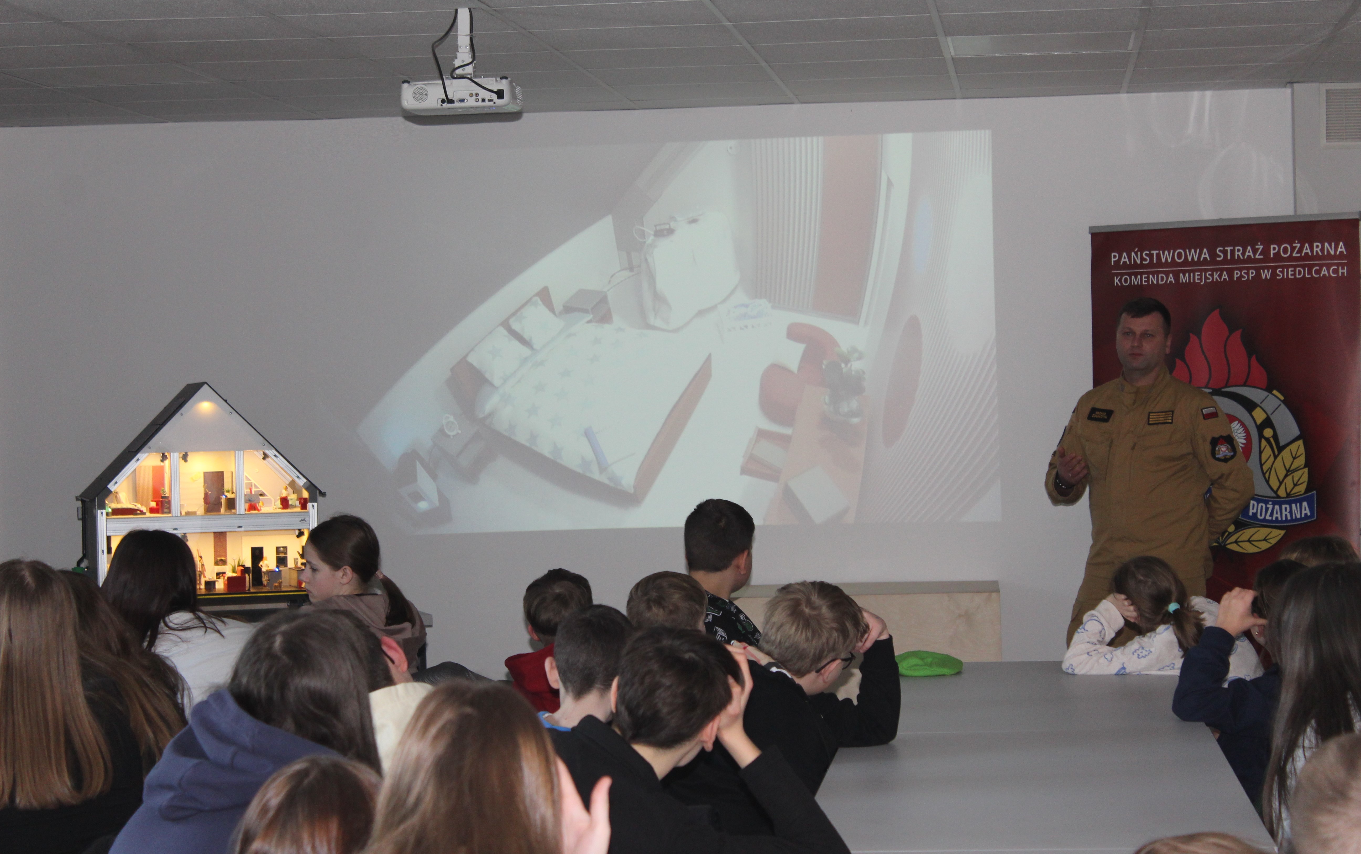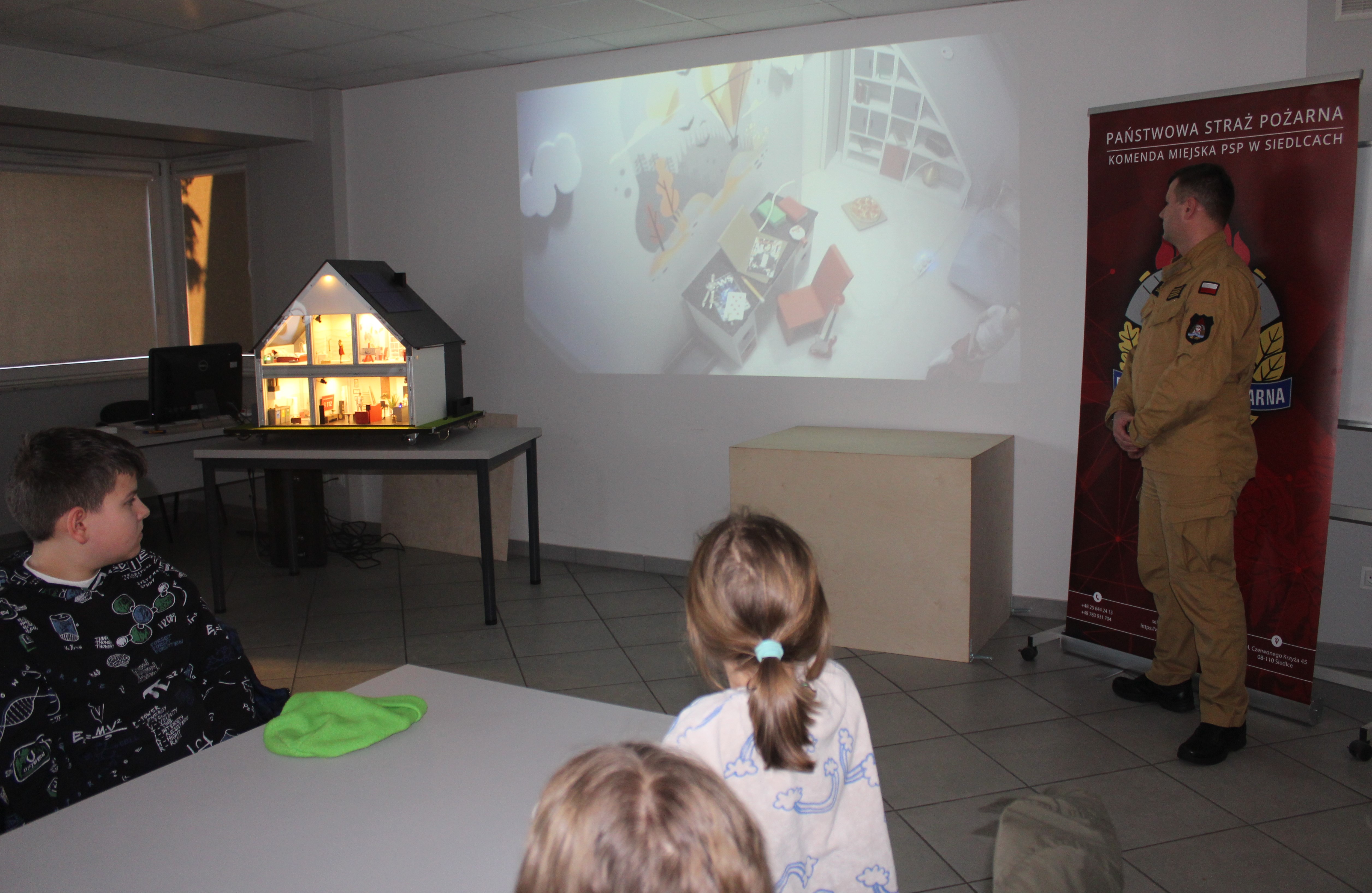 Dnia 12 stycznia 2026 r. odbyło się spotkanie edukacyjne przeprowadzone przez: mł. ogn. Michała Zduńczyka i mł. asp. Arkadiusza Malika - przedstawicieli Komendy Wojewódzkiej PSP w Warszawie. W spotkaniu uczestniczyły dzieci ze szkoły podstawowej z klas 4-8. Prelegenci zaprezentowali mobilny domek zagrożeń, który symuluje najczęstsze zagrożenia wywołujące pożary w gospodarstwie domowym oraz realistycznie odtwarza niebezpieczne sytuacje.