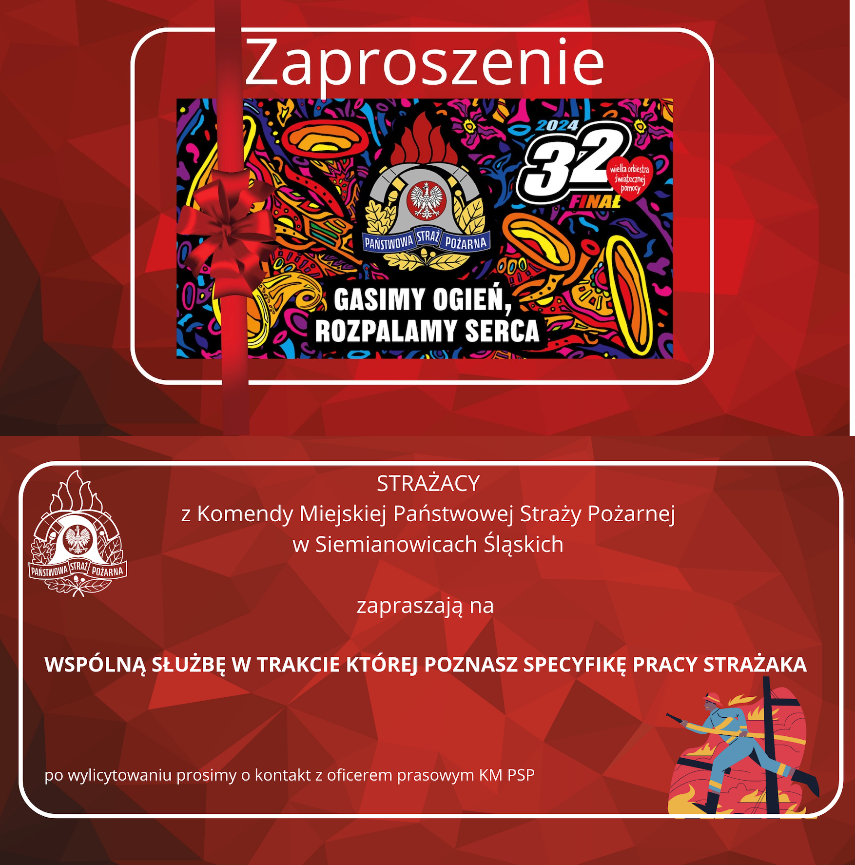 Możesz wylicytować wyjątkowy VOUCHER i spędzić dzień ze strażakami z Komendy Miejskiej Państwowej Straży Pożarnej w Siemianowicach Śląskich! A będzie to dzień pełen wrażeń!!!