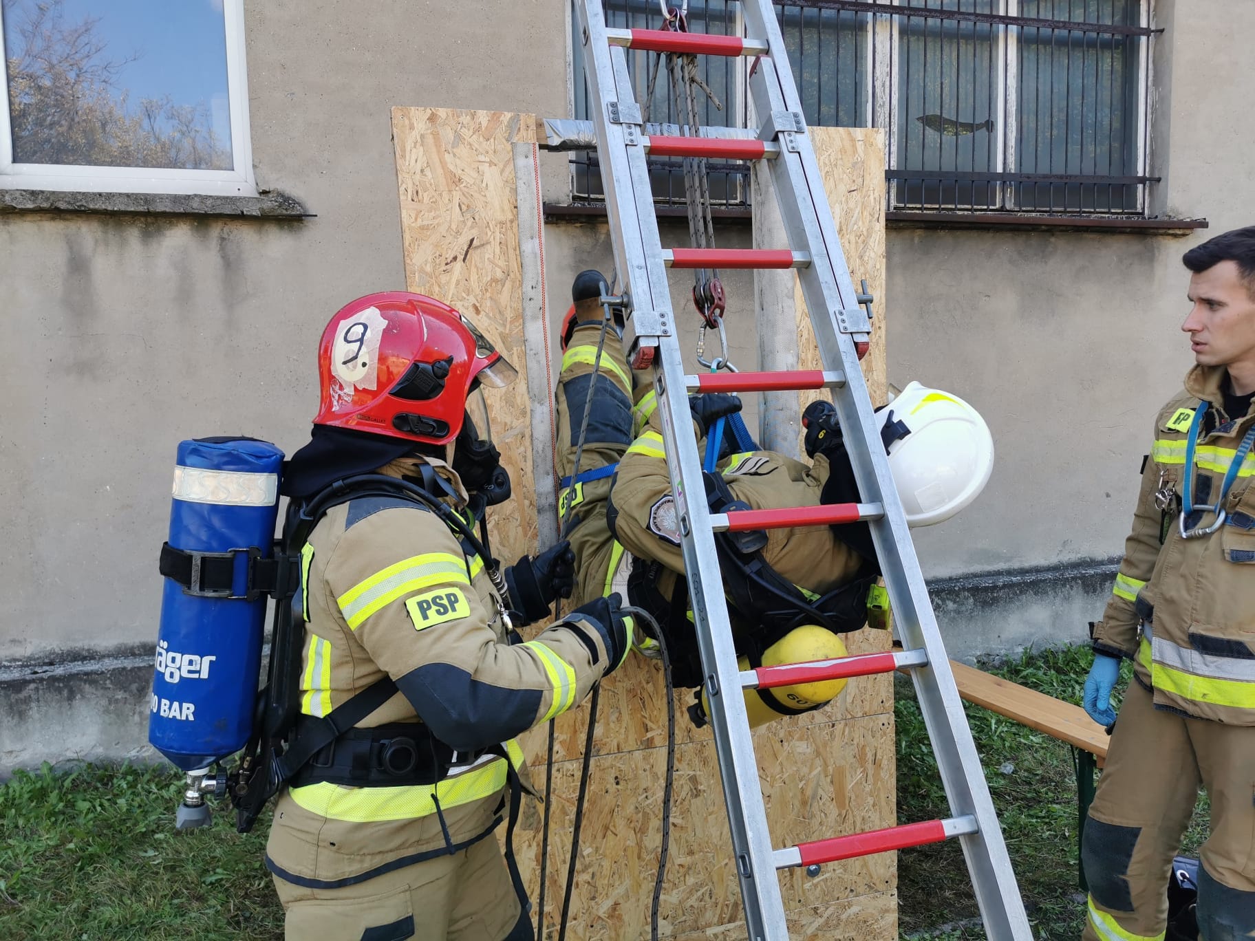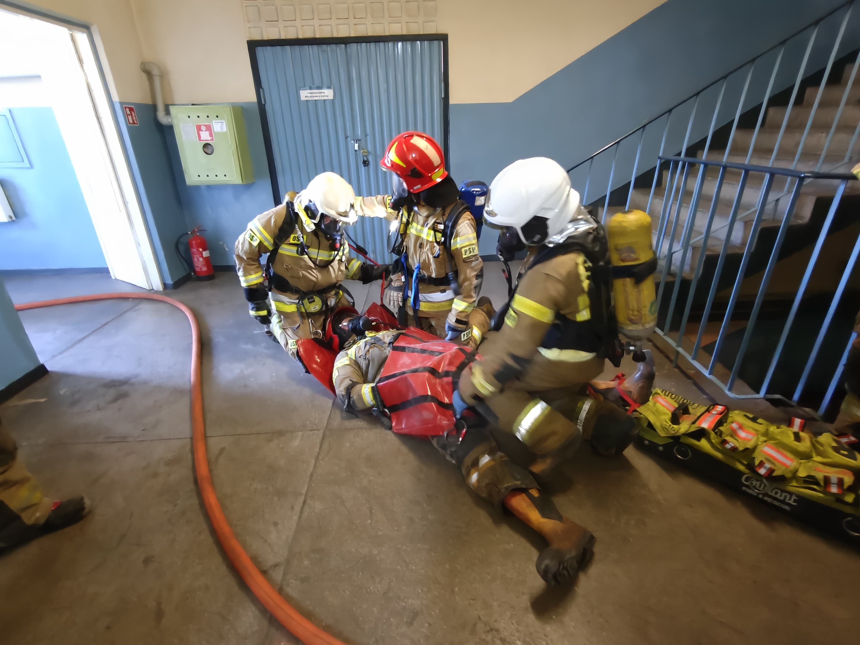 - „Ewakuacja” - udzielenie niezbędnej pomocy, przygotowanie do ewakuacji oraz wyniesienie na zewnątrz budynku strażaka poszkodowanego podczas gaszenia pożaru w pomieszczeniach piwnicznych zakładu.