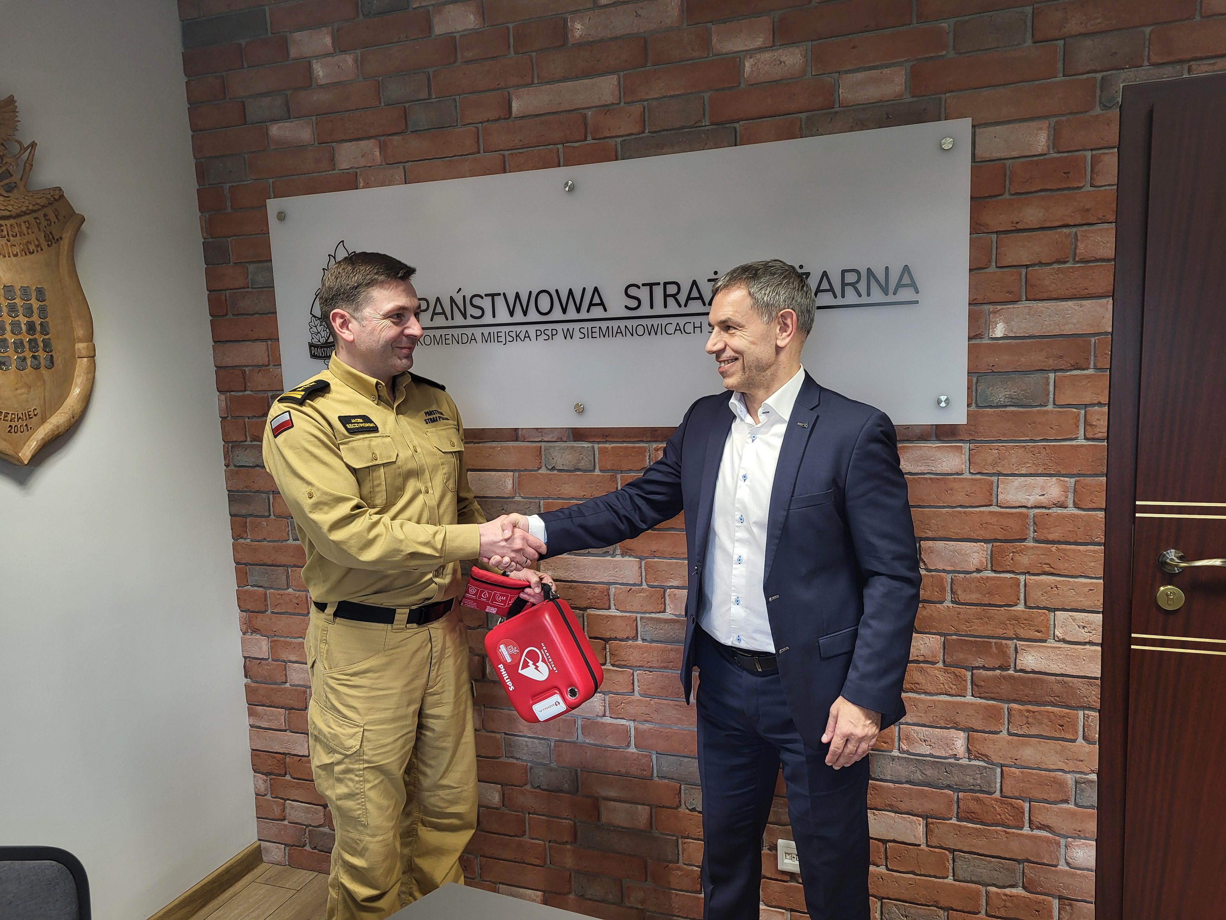 Prezes zarządu firmy Setmil Sp. z o.o. Pan Grzegorz Chruszcz przekazał na ręce Komendanta Miejskiego PSP w Siemianowicach Śląskich st. bryg. Jacka Szczypiorskiego darowiznę w postaci Defibrylatora AED Philips FRx Standard.