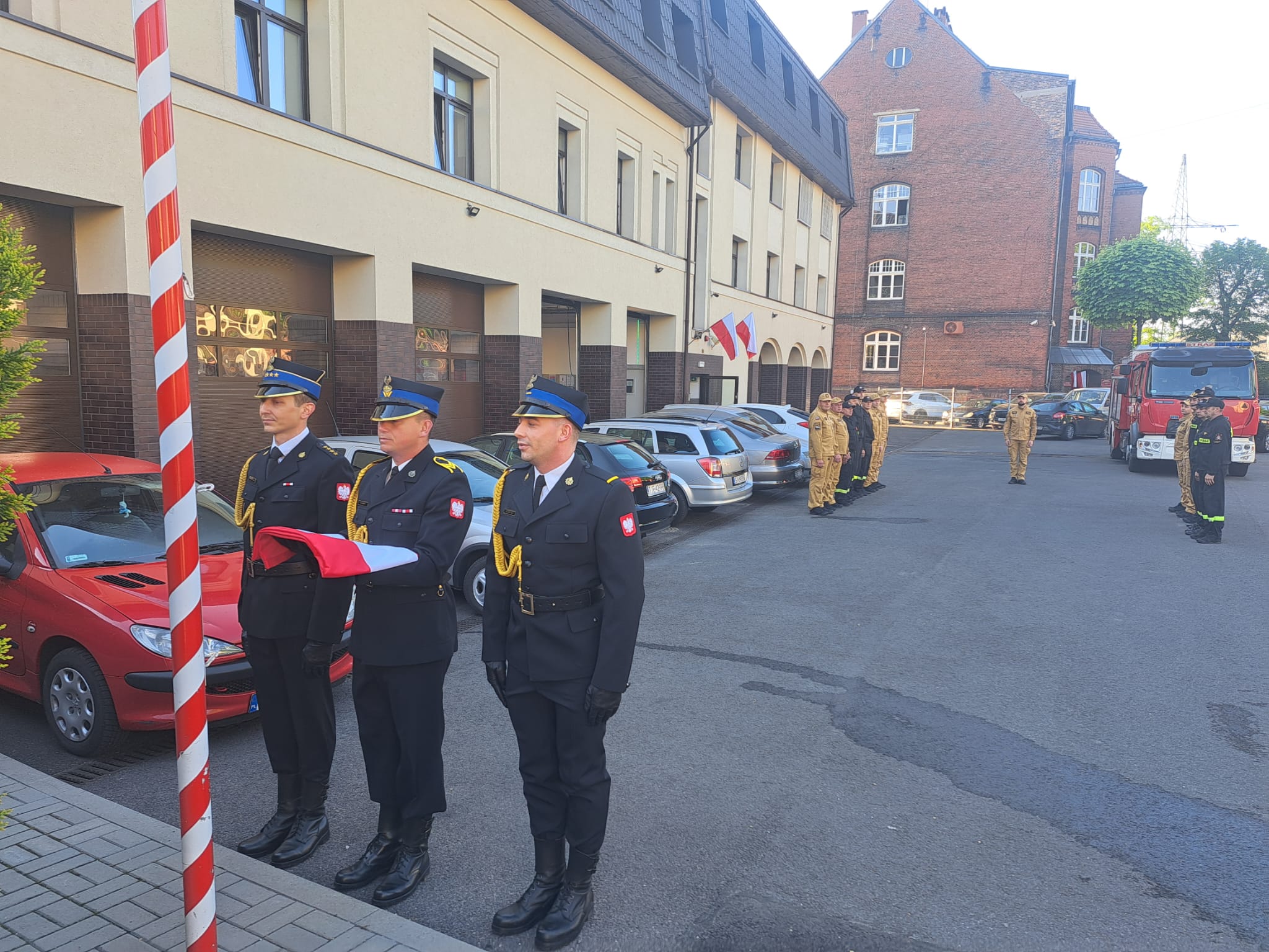Strażacy z Komendy Miejskiej Państwowej Straży Pożarnej w Siemianowicach Śląskich z dumą uczcili Dzień Flagi Rzeczypospolitej Polskiej podczas uroczystej zmiany służby, w czasie której dokonano podniesienia flagi państwowej na maszt.