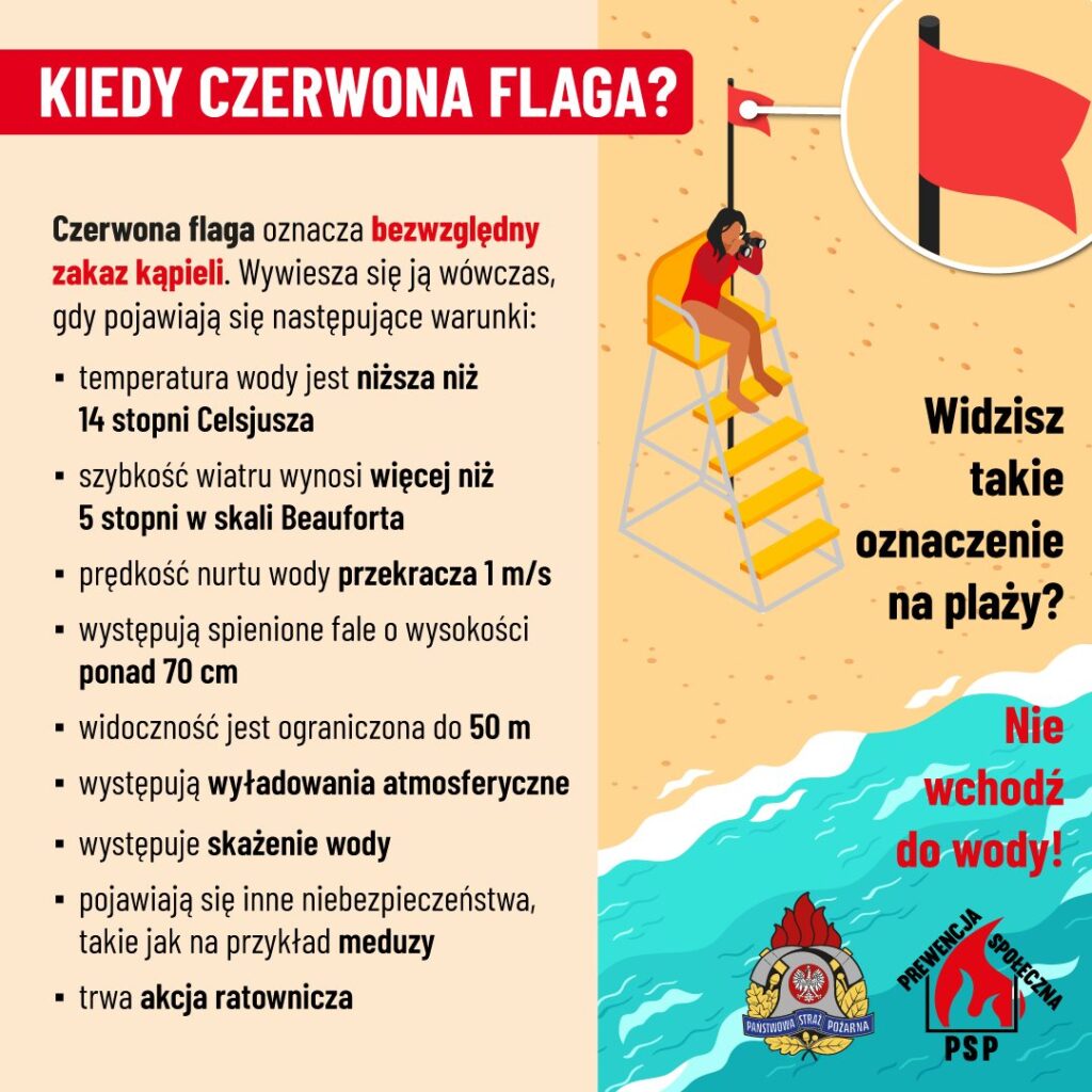 - czerwona flaga – kąpiel zabroniona,