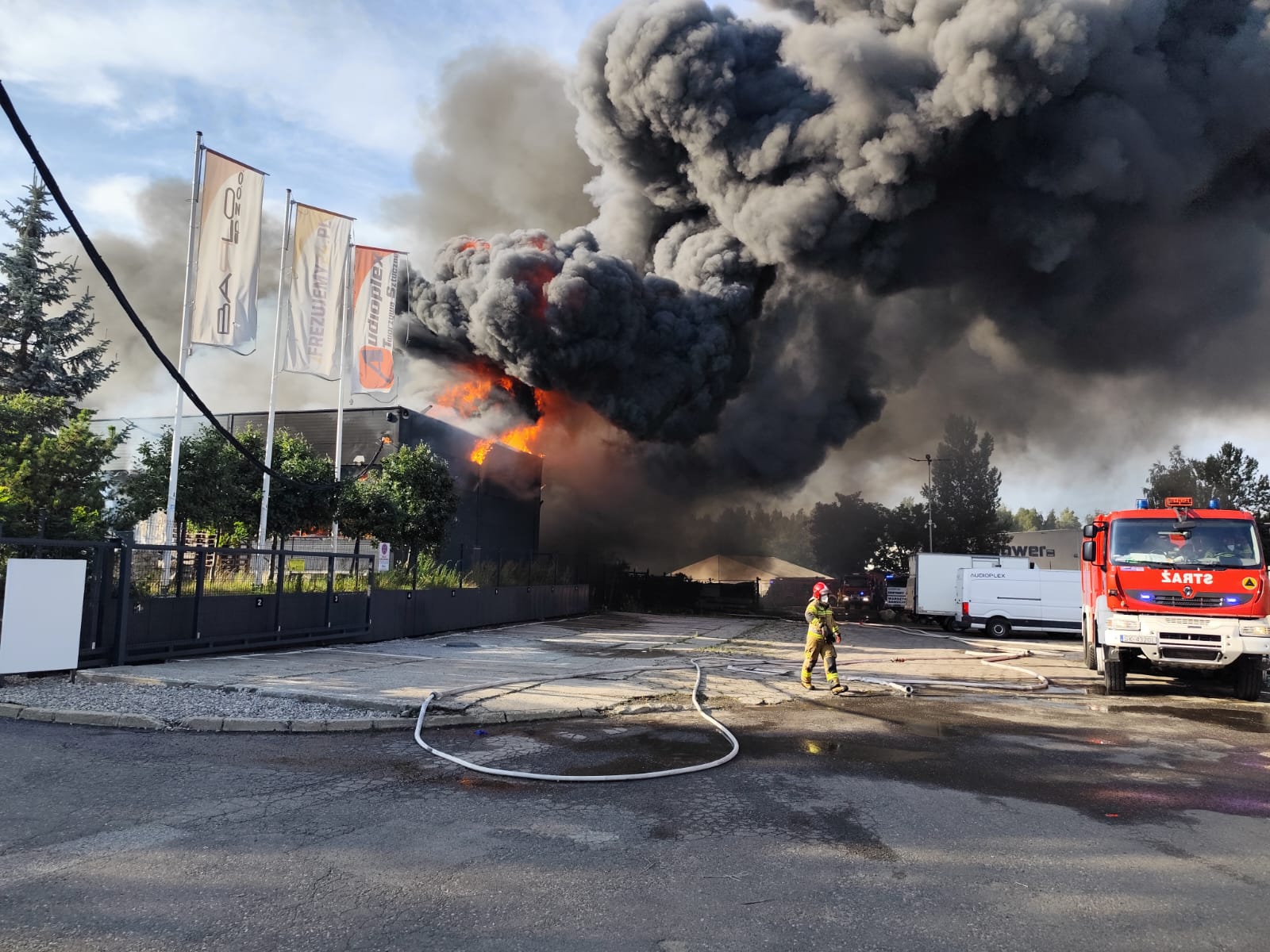 Po dojeździe na miejsce pierwszych zastępów straży pożarnej i dokonaniu rozpoznania stwierdzono, że z hali wydobywa się gęsty czarny dym oraz płomienie. Od jednego z pracowników uzyskano informacje, że wszystkie przebywające wewnątrz osoby ewakuowały się oraz prąd elektryczny w budynku został odłączony. Ponadto uzyskano informację, że w różnych częściach hali magazynowane są farby, butle z gazami technicznymi oraz duże ilości tworzyw sztucznych.