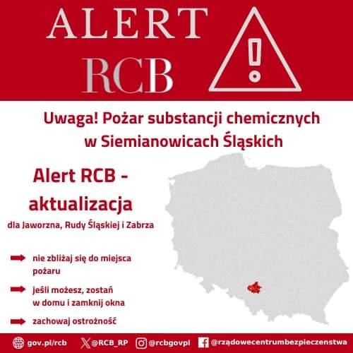 Ponadto Rządowe Centrum Bezpieczeństwa wydało komunikat dla mieszkańców o następującej treści: „Uwaga! Pożar substancji chemicznych w Siemianowicach Śląskich. Nie zbliżaj się do miejsca pożaru. Jeśli możesz, zostań w domu i zamknij okna". Alert RCB trafił do mieszkańców Siemianowic Śląskich, Chorzowa, Sosnowca, Mysłowic, Dąbrowy Górniczej, Katowic i powiatu będzińskiego.
