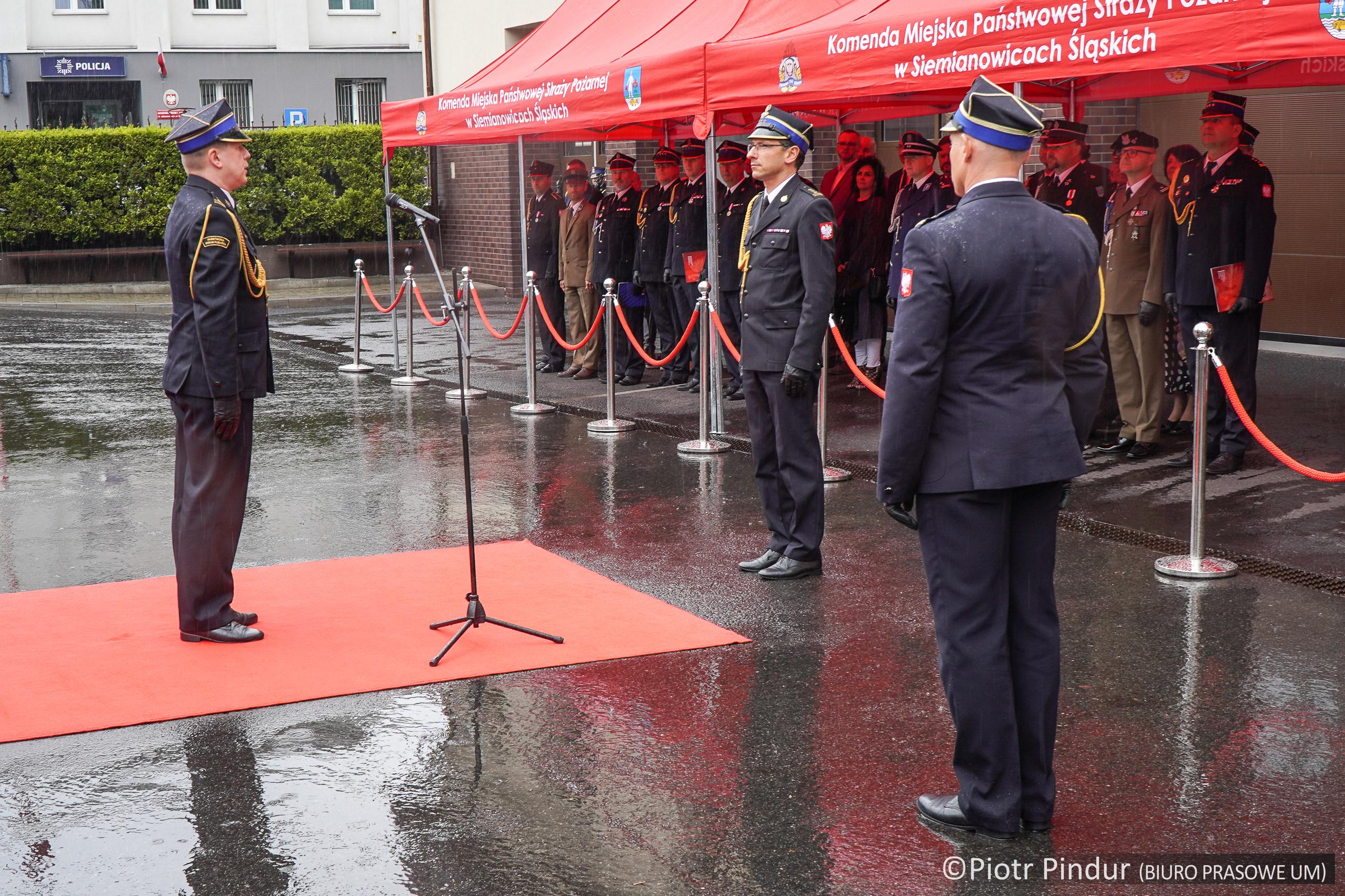 Następnie Śląski Komendant Wojewódzki Państwowej Straży Pożarnej przyjął od bryg. Marcina Gąsowskiego meldunek o przyjęciu obowiązków Komendanta Miejskiego Państwowej Straży Pożarnej w Siemianowicach Śląskich.