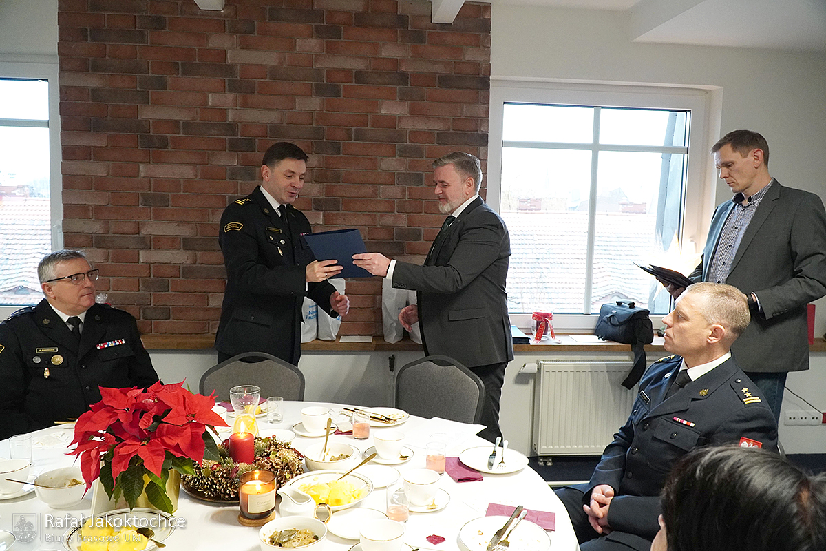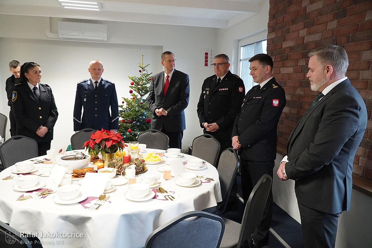 Po życzeniach funkcjonariusze i pracownicy cywilni oraz zaproszeni goście przełamali się opłatkiem, a następnie przy świątecznej choince i akompaniamencie kolęd wszyscy przystąpili do spożywania wigilijnych potraw.
