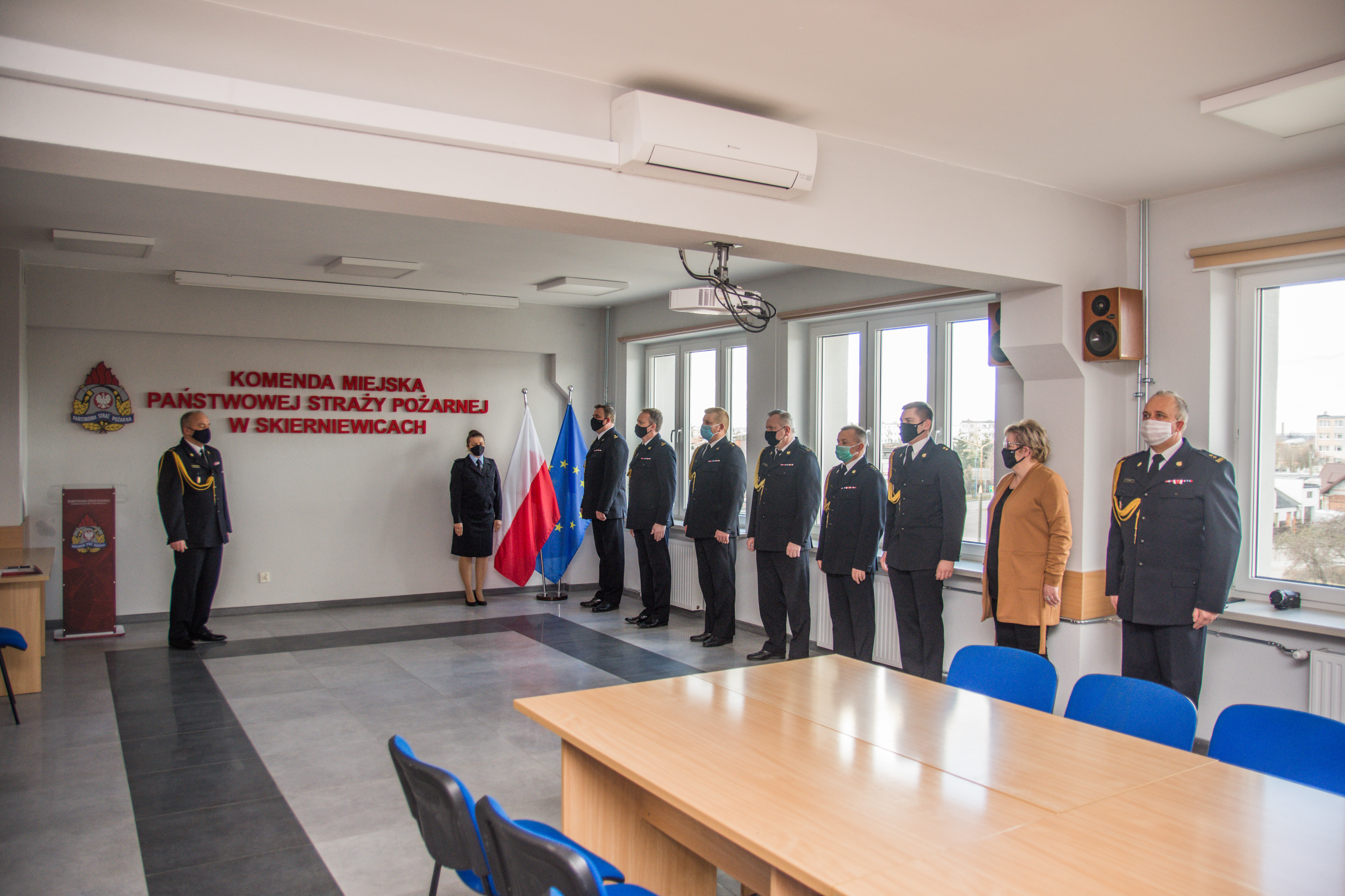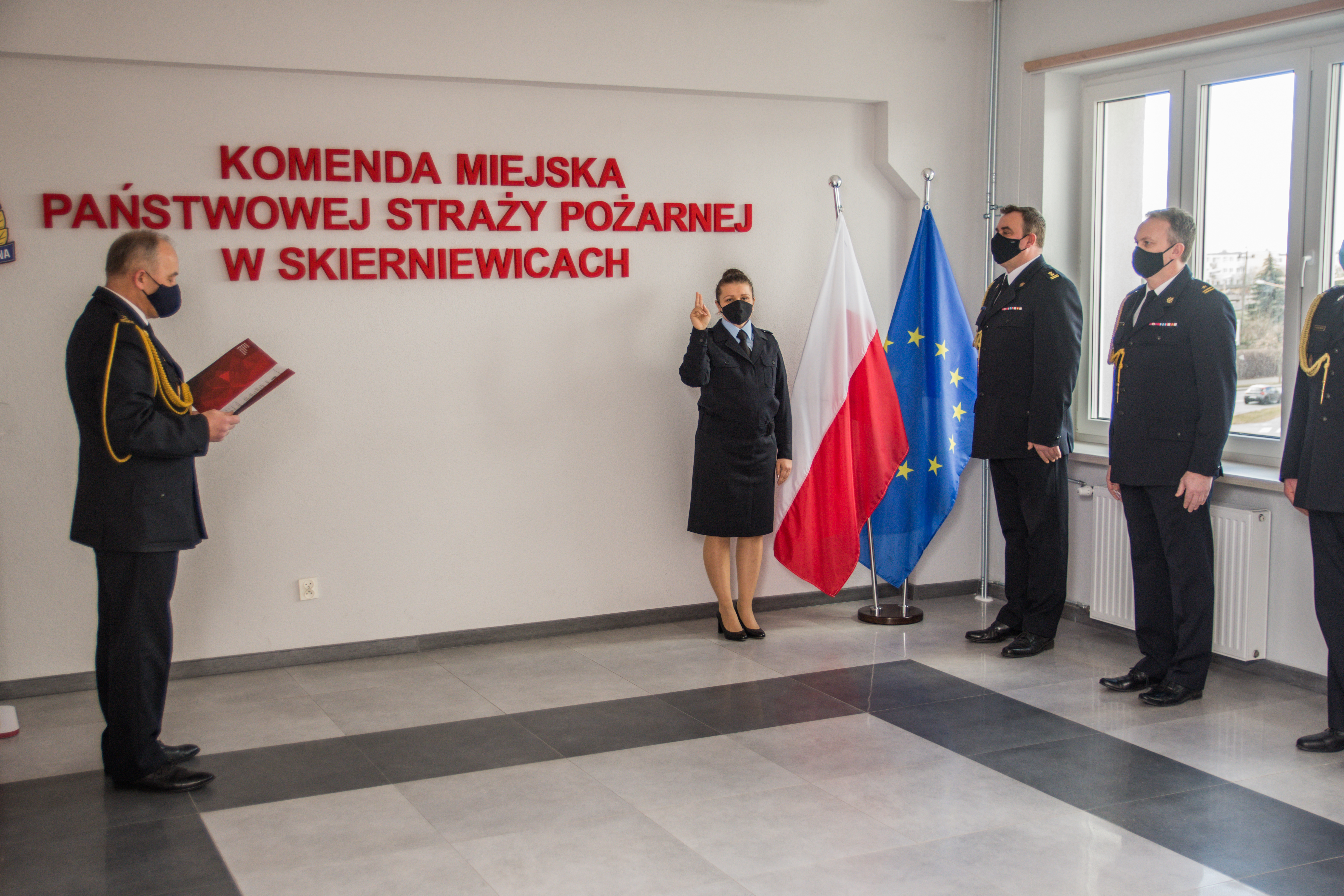 W dniu 05.03.2021 r. ślubowanie funkcjonariusza Państwowej Straży Pożarnej złożyła Pani str. mgr Marta Ciężka. Pani Marta Ciężka rozpoczęła służbę przygotowawczą w Państwowej Straży Pożarnej na samodzielnym stanowisku stażysty do spraw finansowych w dniu 01.01.2021 r. Uroczystość odbyła się w sali konferencyjnej komendy z udziałem funkcjonariuszy oraz kierownictwa Komendy. Uroczystość rozpoczęła się od złożenia meldunku Komendantowi Miejskiemu przez dowódcę uroczystości bryg. Sławomira Majkę. Następnie Komendant Miejski Państwowej Straży Pożarnej w Skierniewicach bryg. Mariusz Wielgosz zabrał głos.