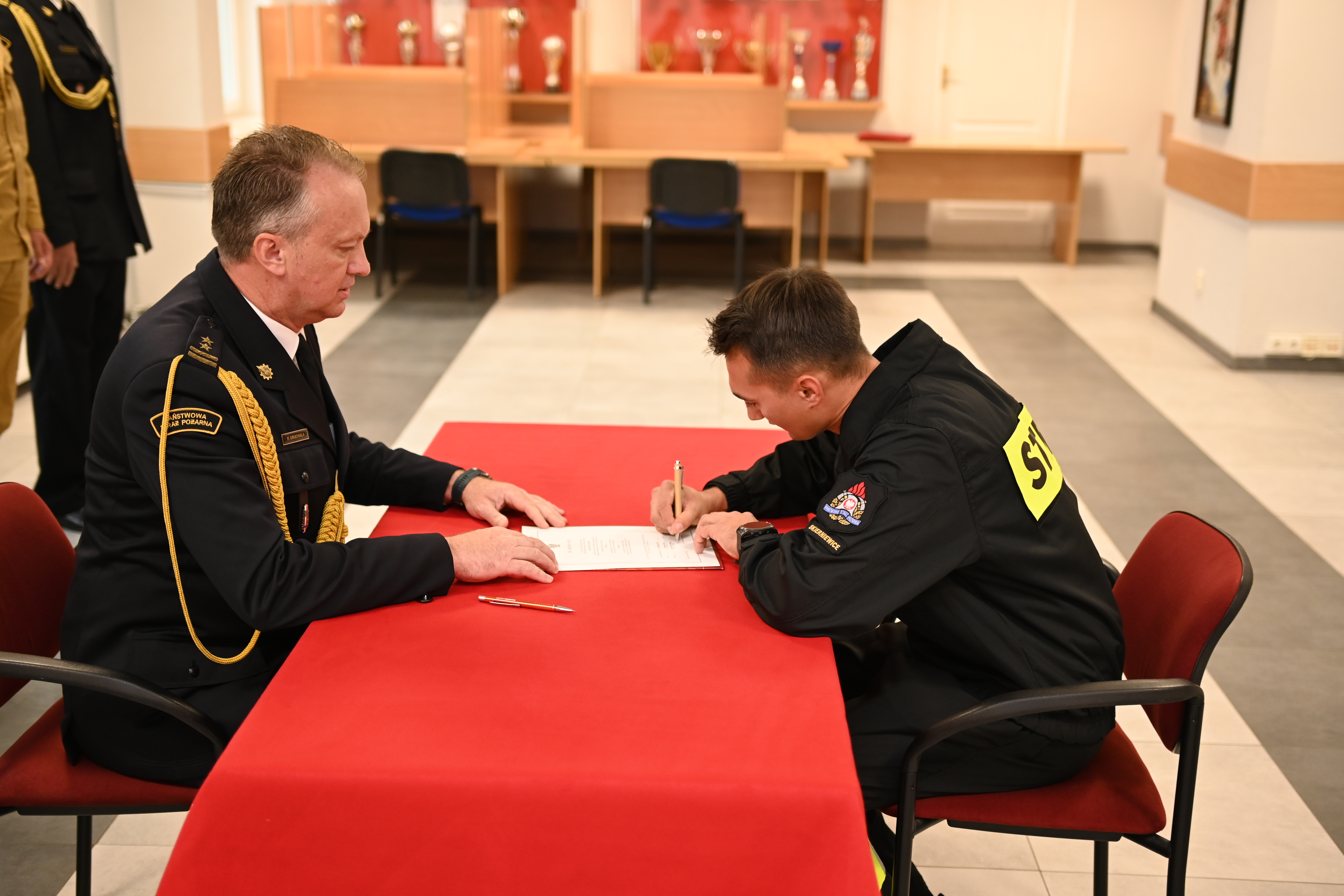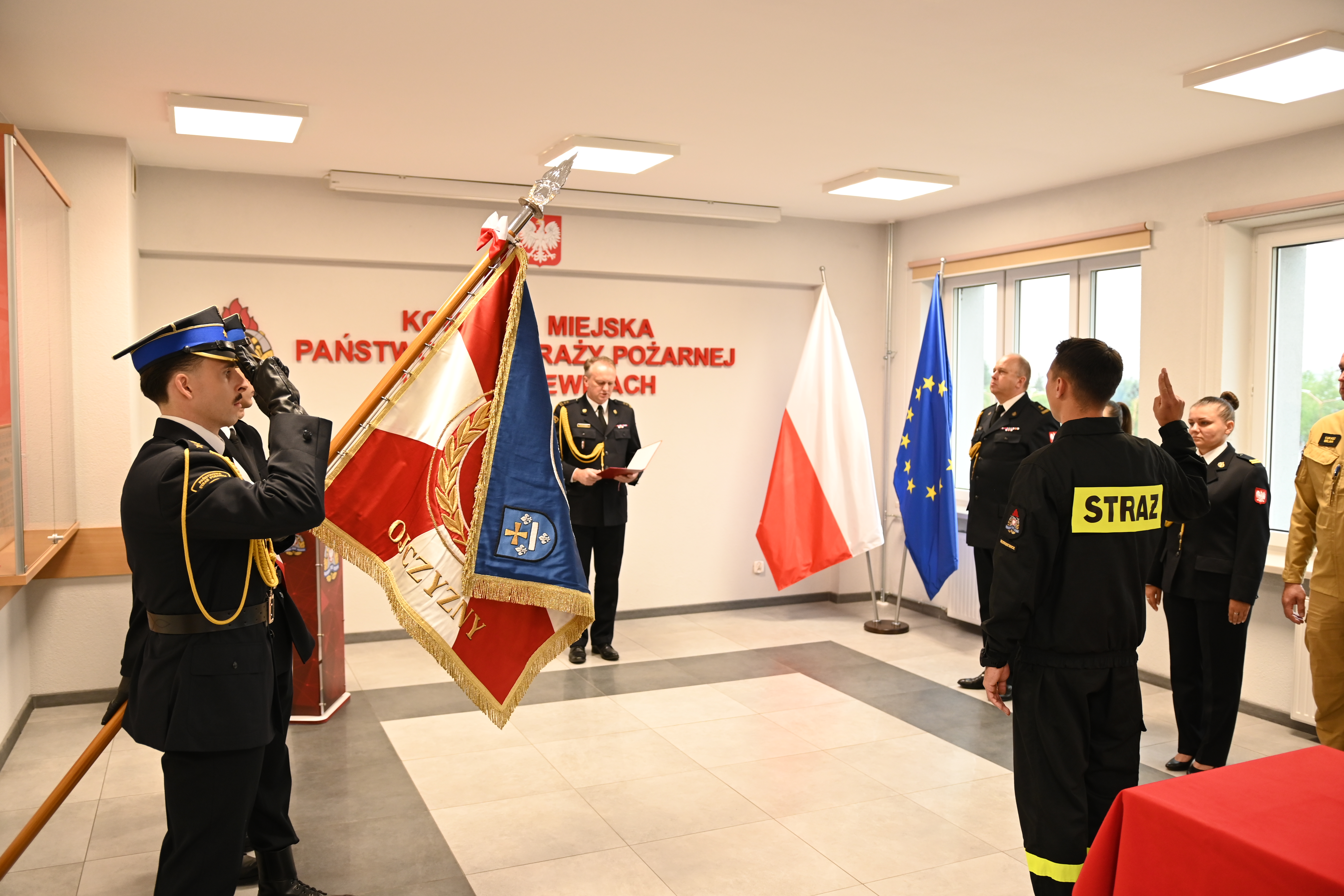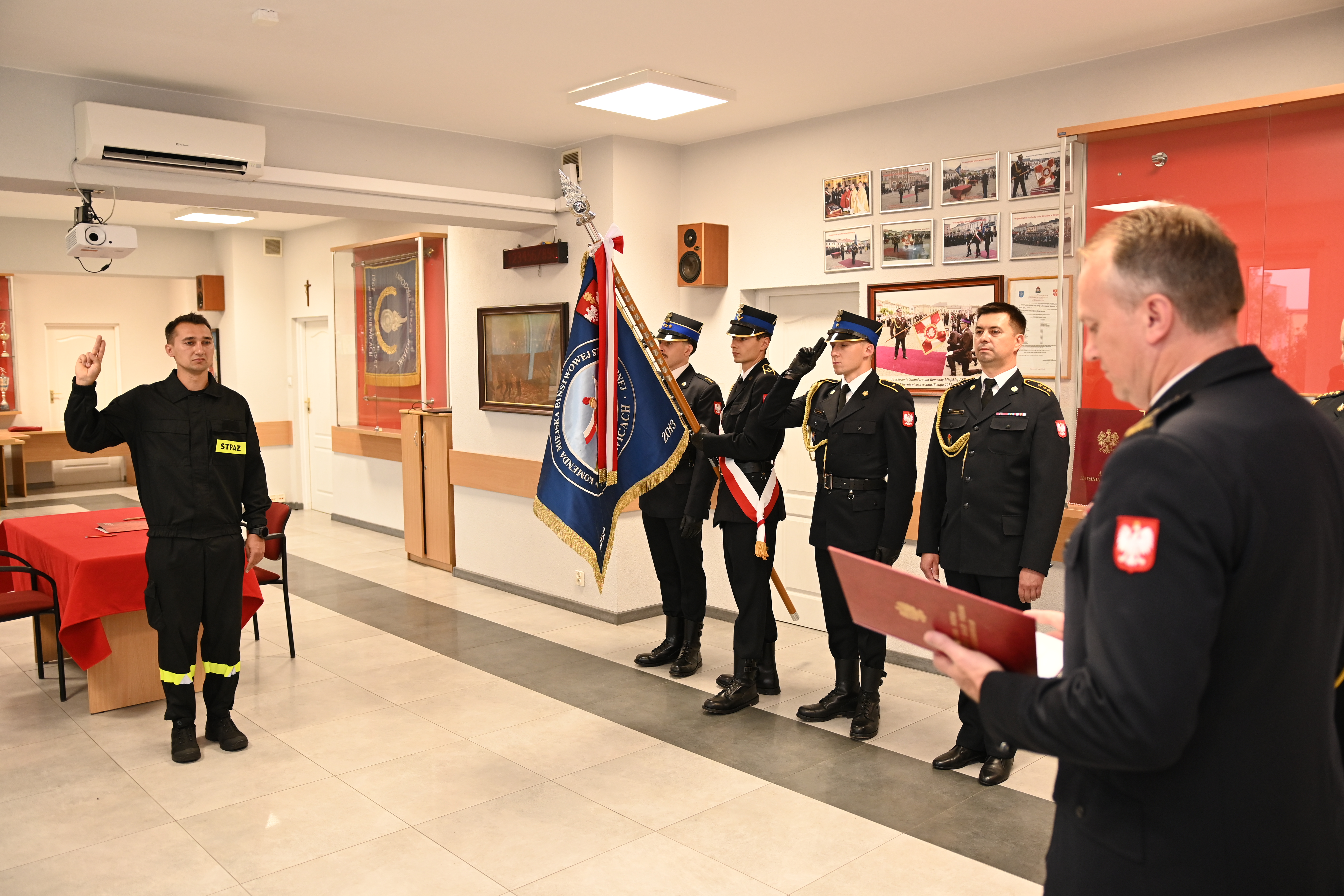 W dniu 03.09.2025 r. ślubowanie funkcjonariusza Państwowej Straży Pożarnej złożył Pan str. Mateusz Białek. Pan Mateusz Białek rozpoczął służbę przygotowawczą w Państwowej Straży Pożarnej na stanowisku stażysty na zmianie 3 w Jednostce Ratowniczo-Gaśniczej w dniu 01.09.2025 r. Uroczystość odbyła się w sali konferencyjnej komendy z udziałem funkcjonariuszy oraz kierownictwa Komendy. Uroczystość rozpoczęła się od złożenia meldunku Komendantowi Miejskiemu przez dowódcę uroczystości asp. sztab. Zbigniewa Sałka. Następnie Komendant Miejski Państwowej Straży Pożarnej w Skierniewicach bryg. Robert Gruchała zabrał głos.