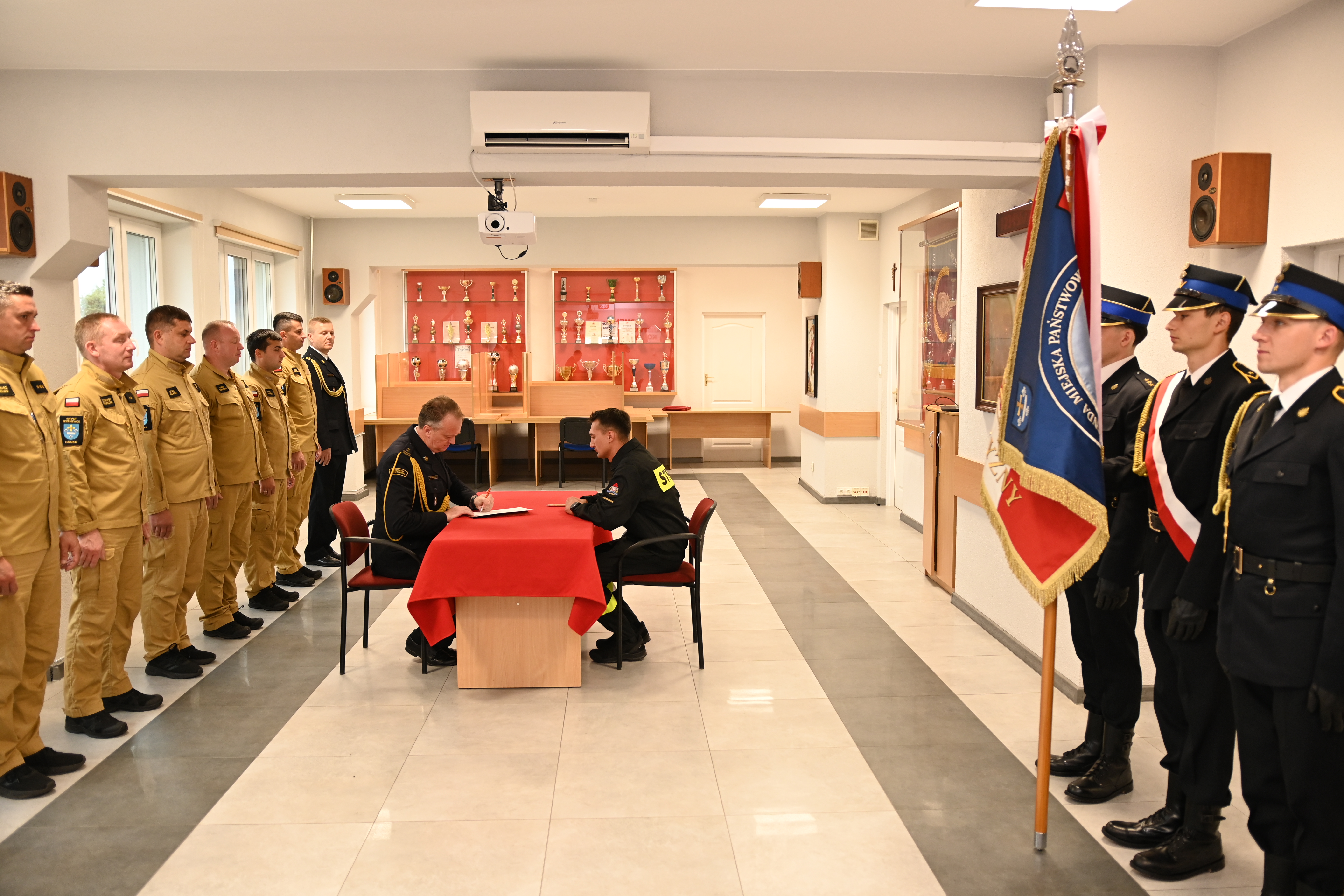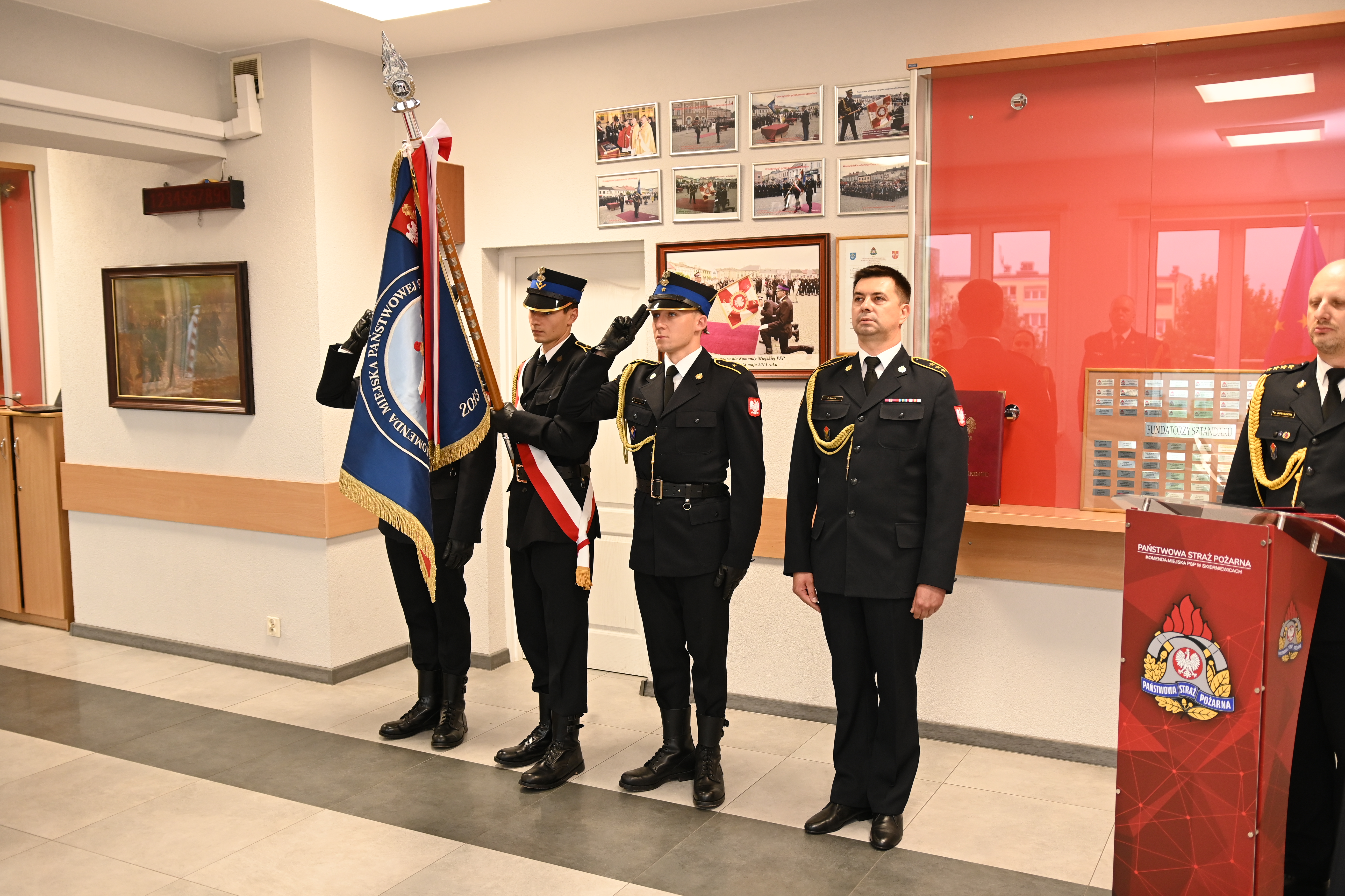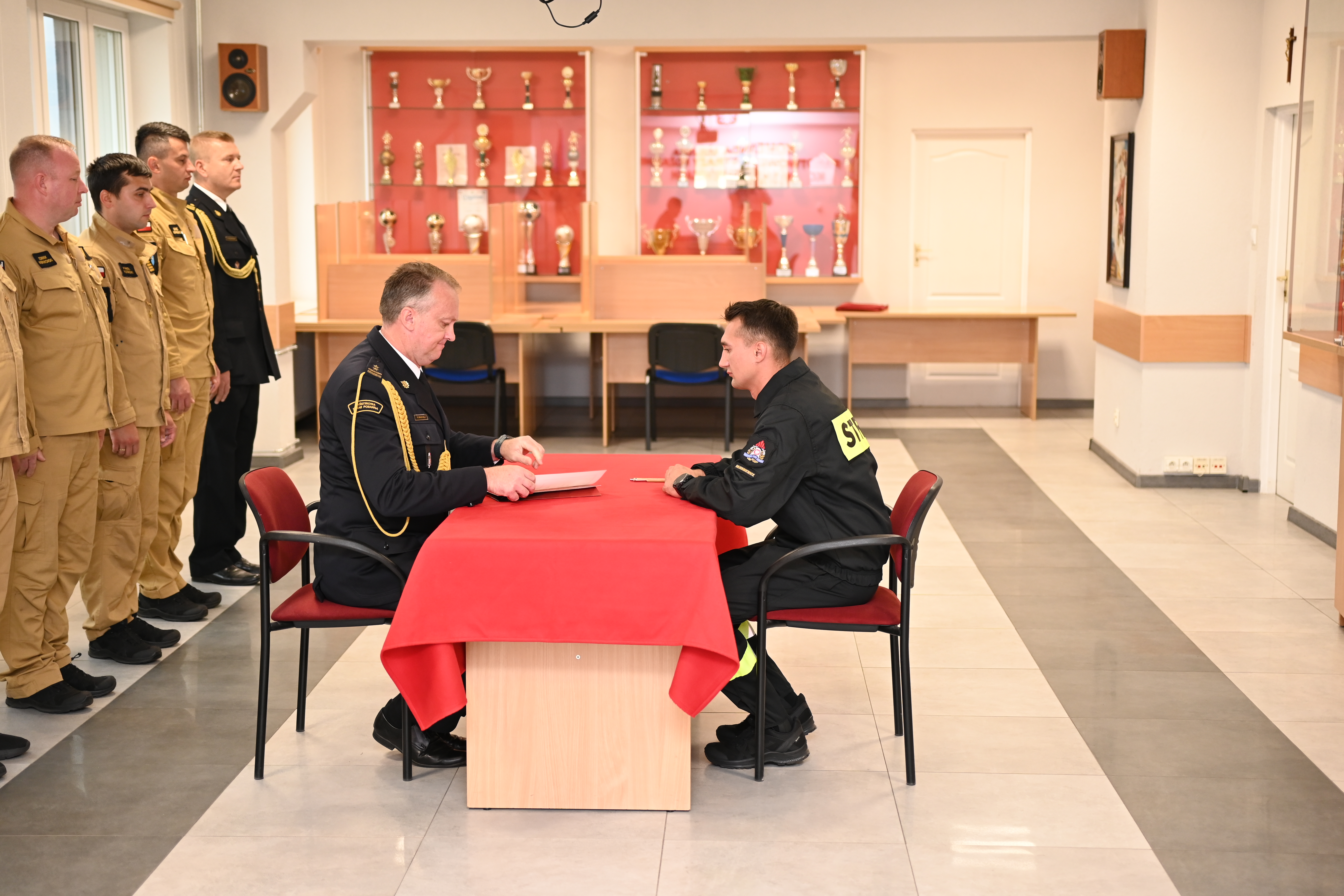 W dniu 03.09.2025 r. ślubowanie funkcjonariusza Państwowej Straży Pożarnej złożył Pan str. Mateusz Białek. Pan Mateusz Białek rozpoczął służbę przygotowawczą w Państwowej Straży Pożarnej na stanowisku stażysty na zmianie 3 w Jednostce Ratowniczo-Gaśniczej w dniu 01.09.2025 r. Uroczystość odbyła się w sali konferencyjnej komendy z udziałem funkcjonariuszy oraz kierownictwa Komendy. Uroczystość rozpoczęła się od złożenia meldunku Komendantowi Miejskiemu przez dowódcę uroczystości asp. sztab. Zbigniewa Sałka. Następnie Komendant Miejski Państwowej Straży Pożarnej w Skierniewicach bryg. Robert Gruchała zabrał głos.