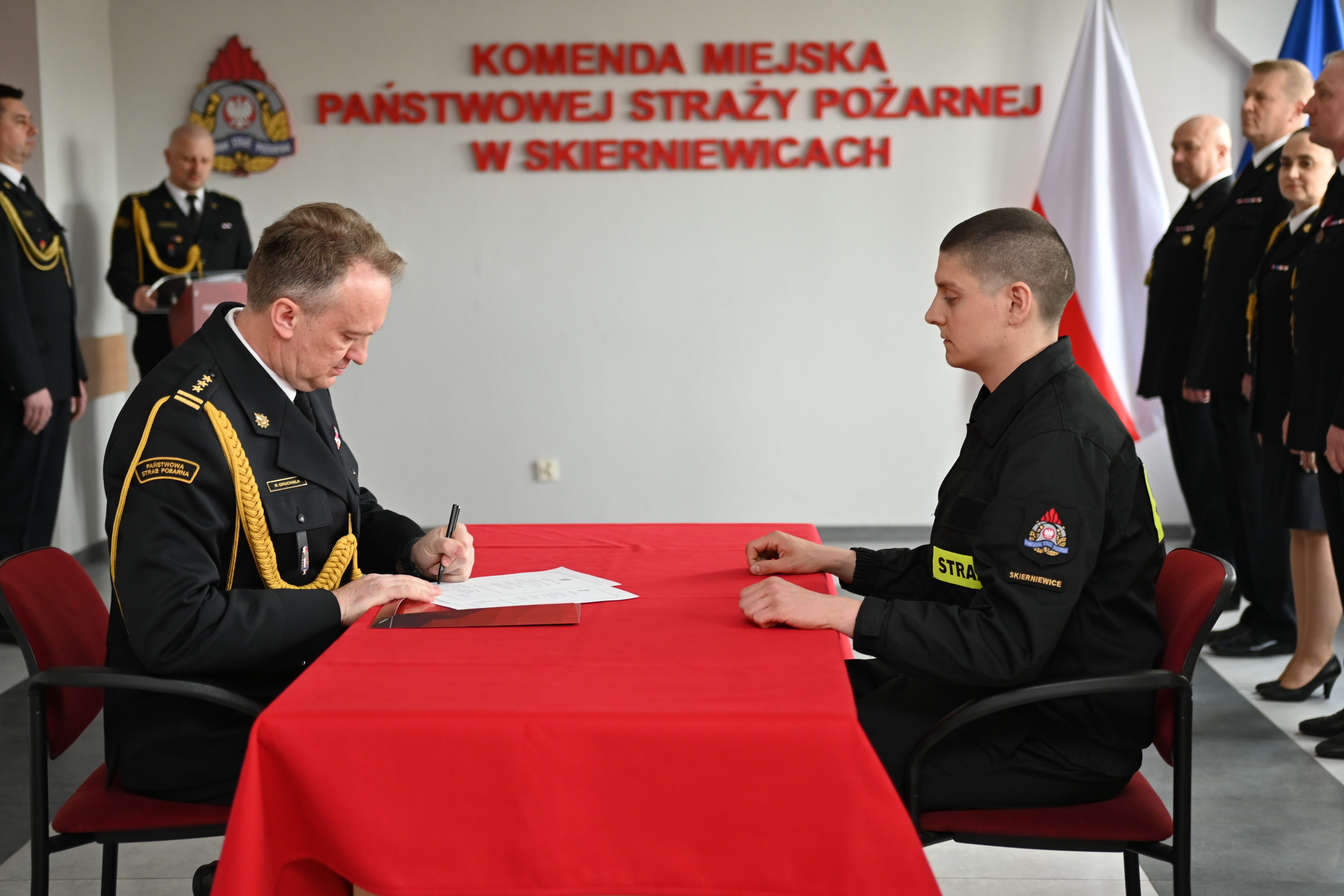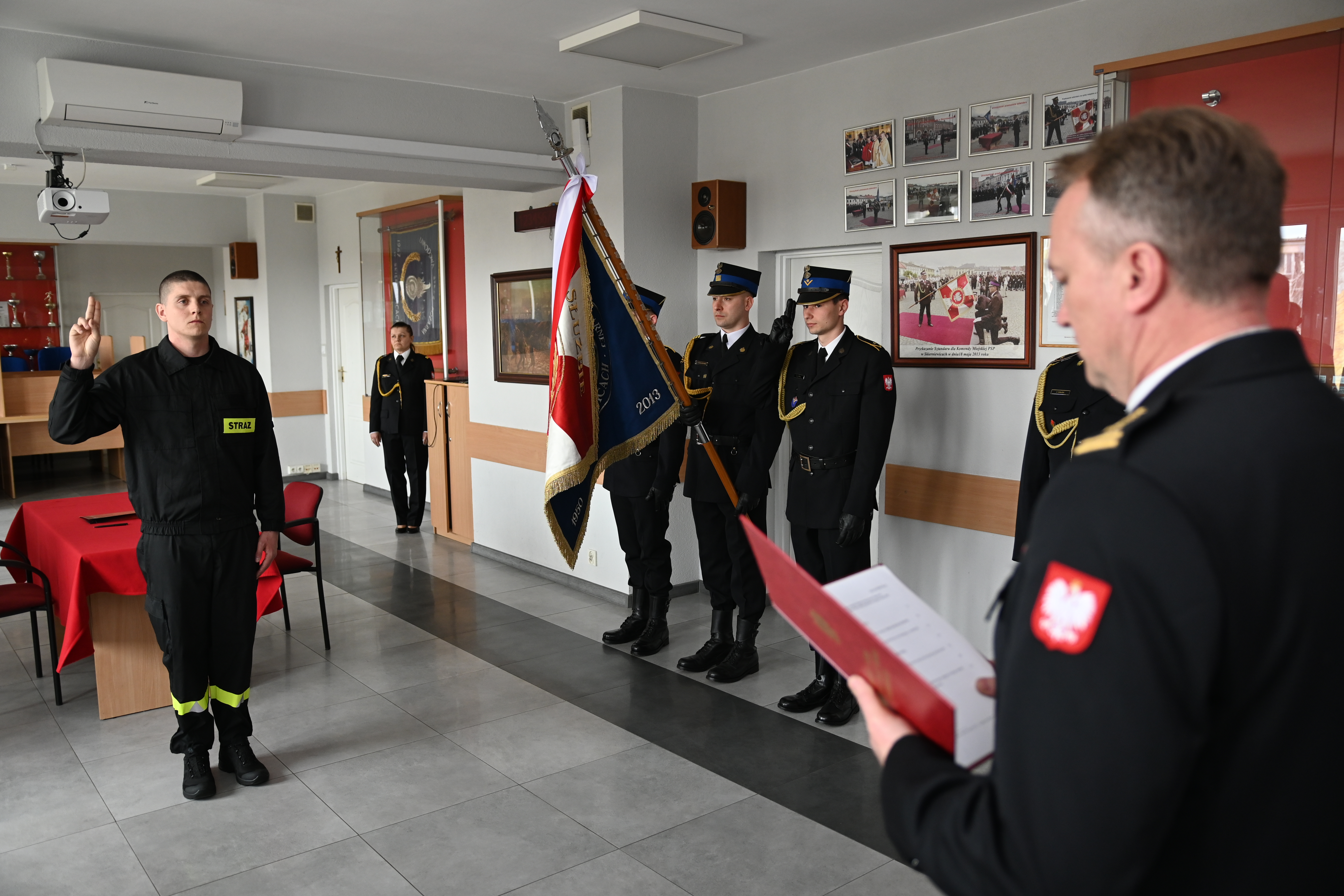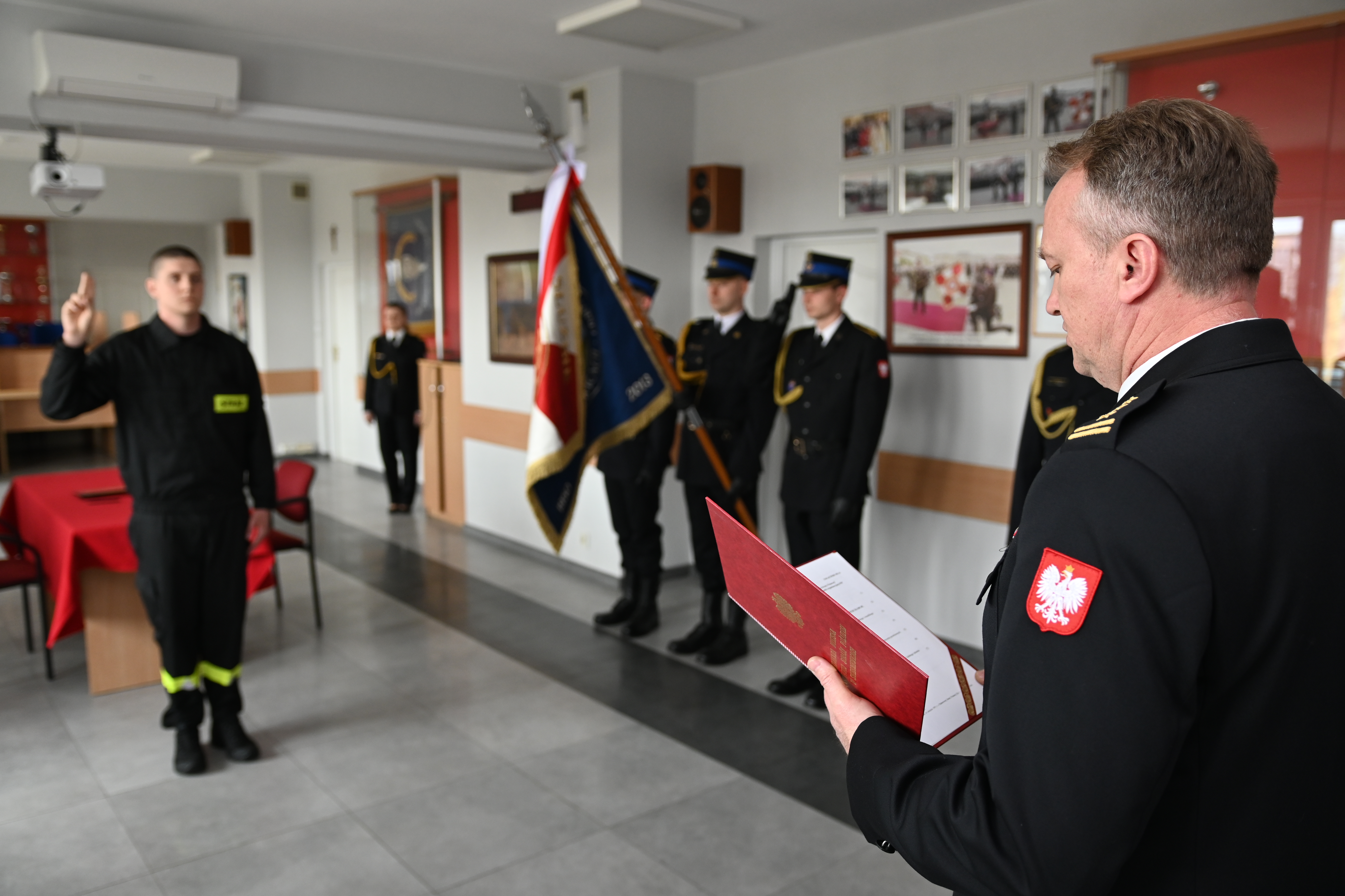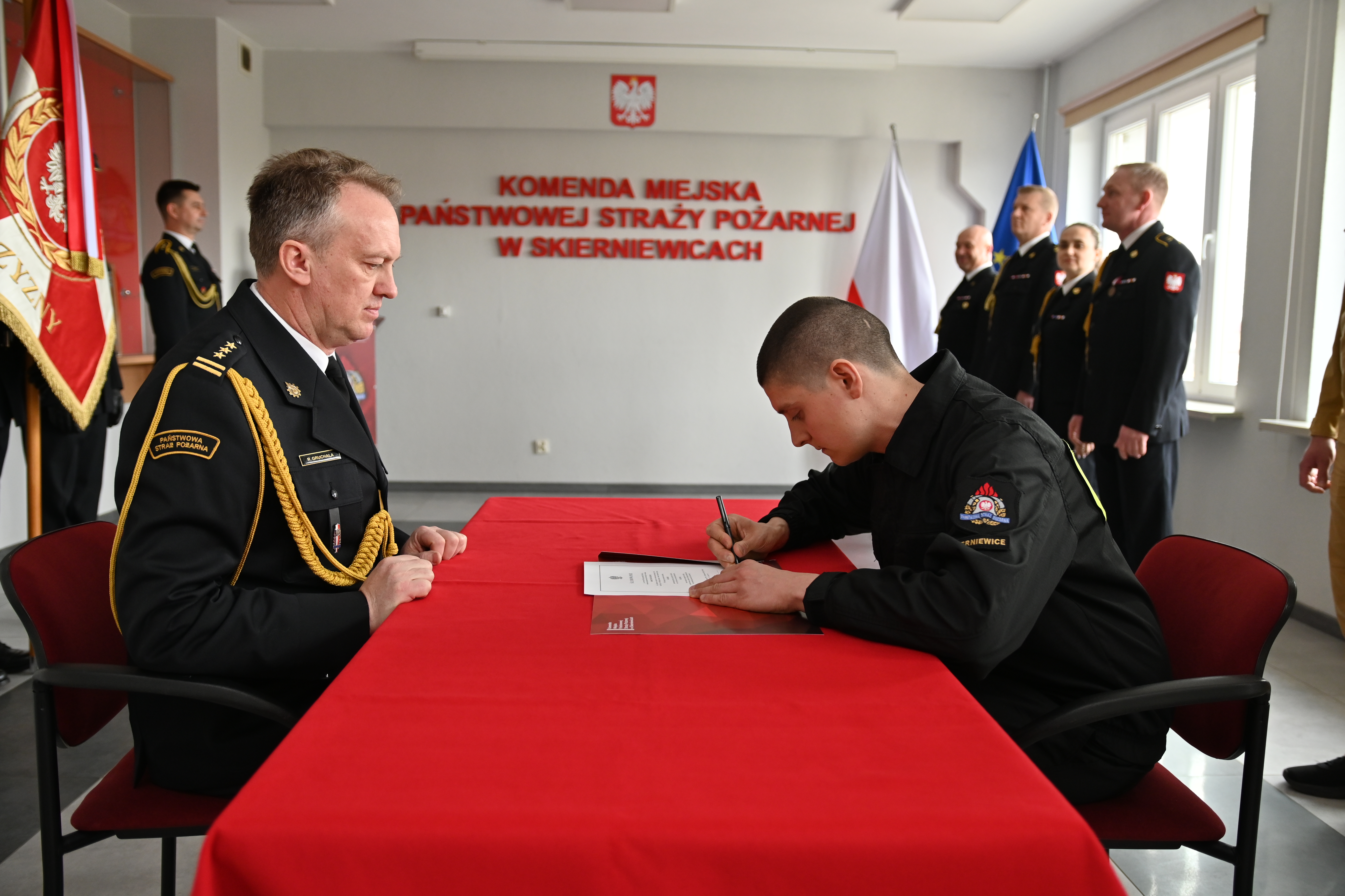 W dniu 17.03.2026 r. ślubowanie funkcjonariusza Państwowej Straży Pożarnej złożył Pan str. Michał Mitek. Pan Michał Mitek rozpoczął służbę przygotowawczą w Państwowej Straży Pożarnej na stanowisku stażysty na zmianie 3 w Jednostce Ratowniczo-Gaśniczej w dniu 16.03.2026 r. Uroczystość odbyła się w sali konferencyjnej komendy z udziałem funkcjonariuszy oraz kierownictwa Komendy. Uroczystość rozpoczęła się od złożenia meldunku Komendantowi Miejskiemu przez dowódcę uroczystości asp. sztab. Zbigniewa Sałka. Następnie Komendant Miejski Państwowej Straży Pożarnej w Skierniewicach st. bryg. Robert Gruchała zabrał głos.