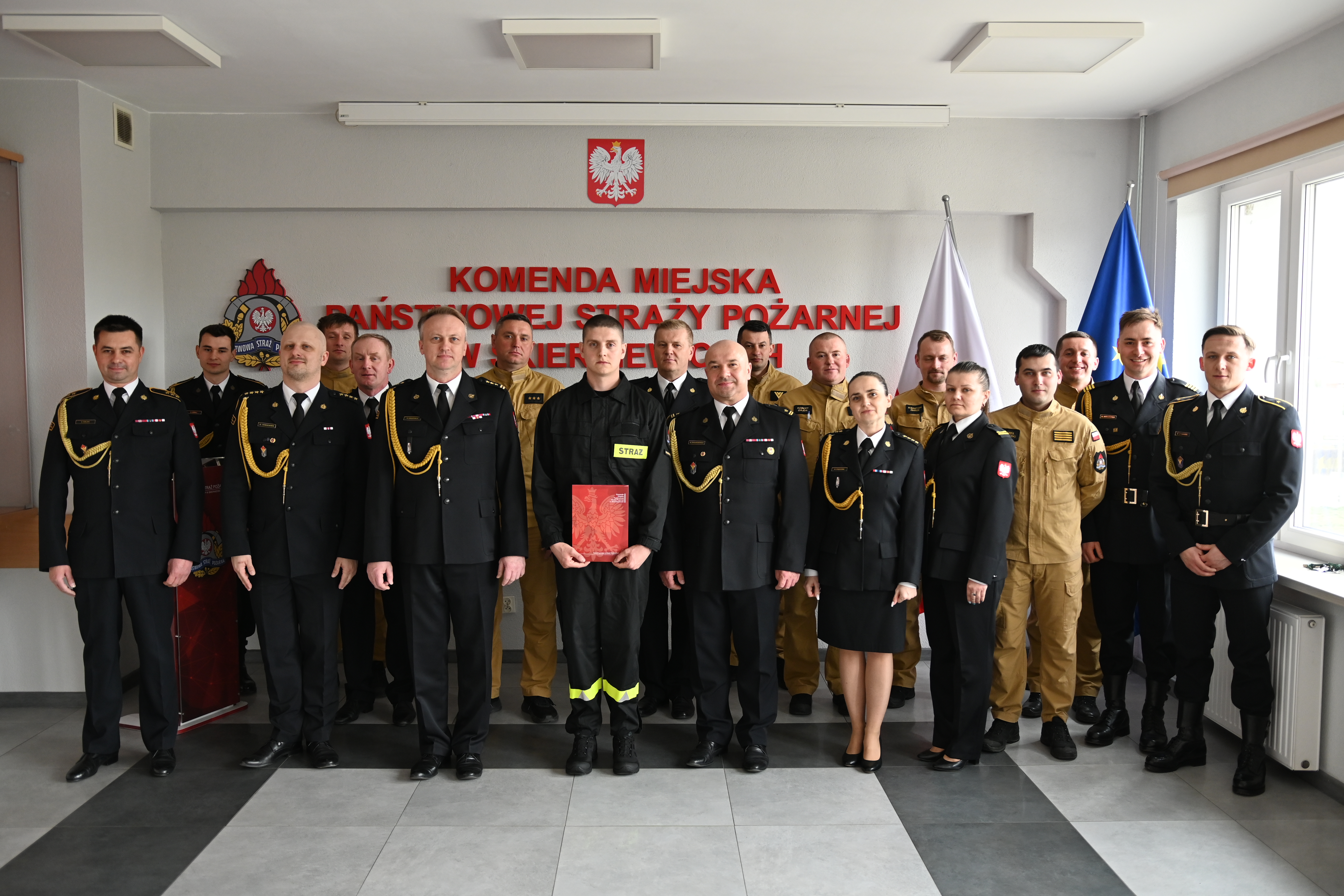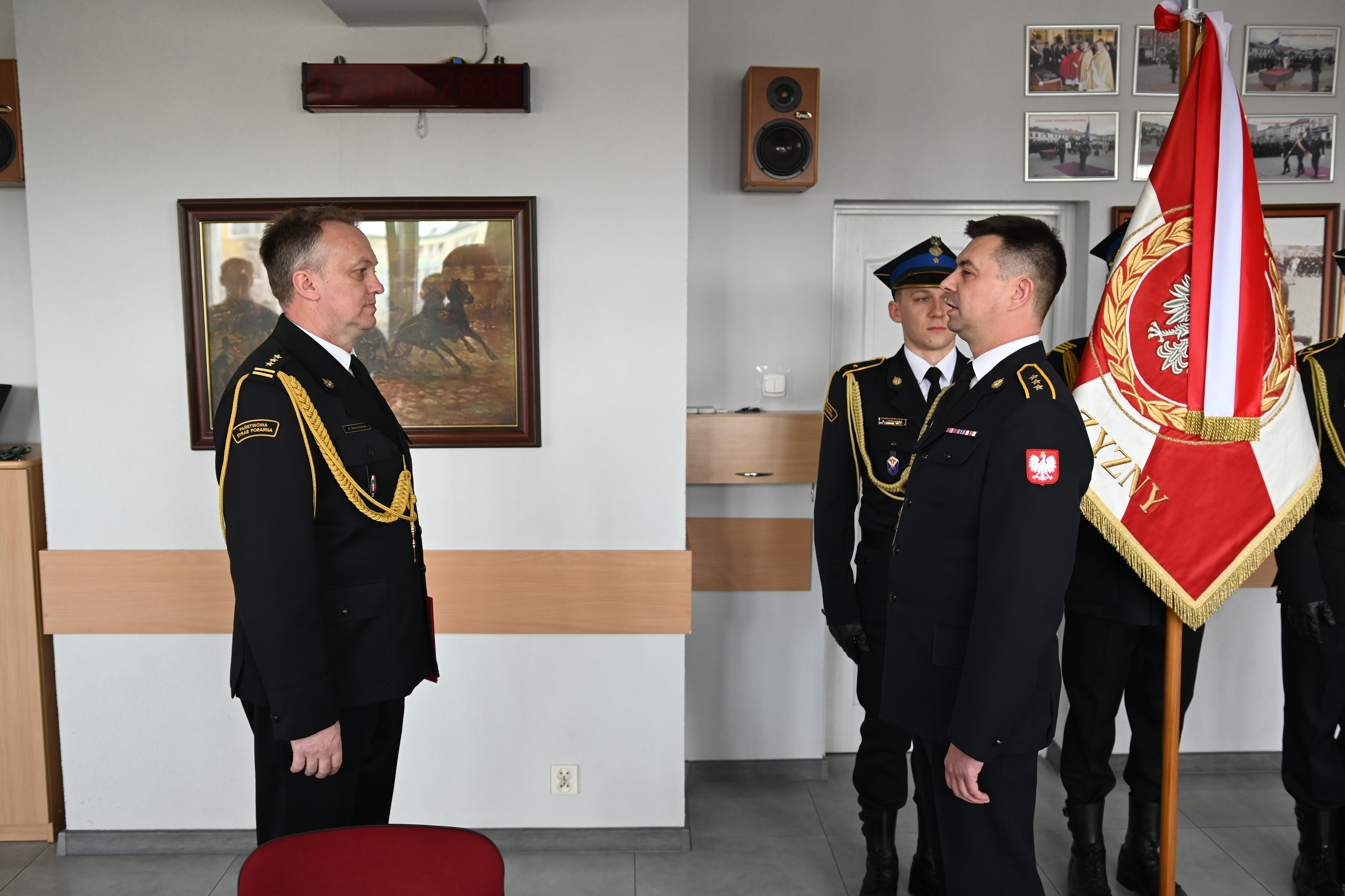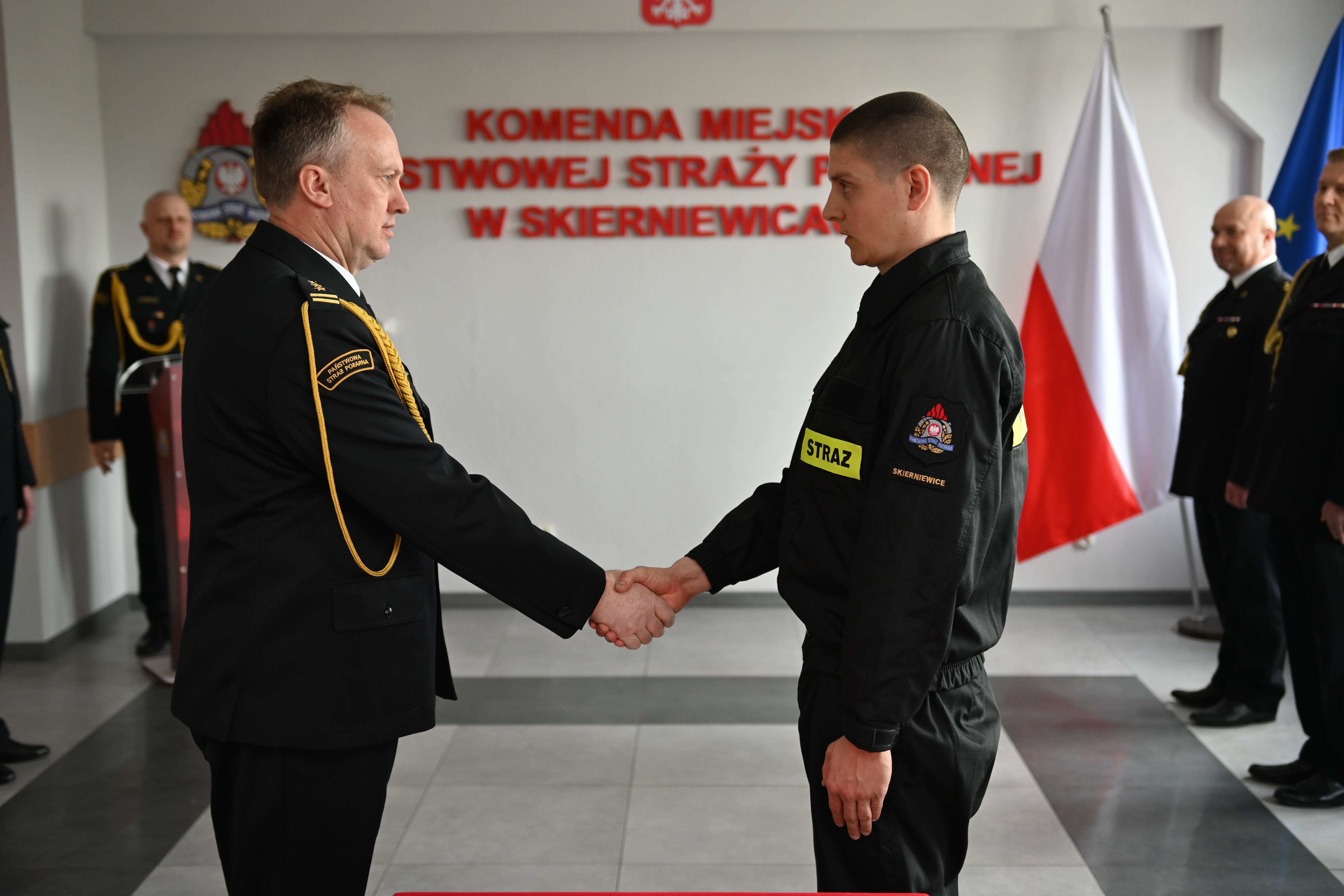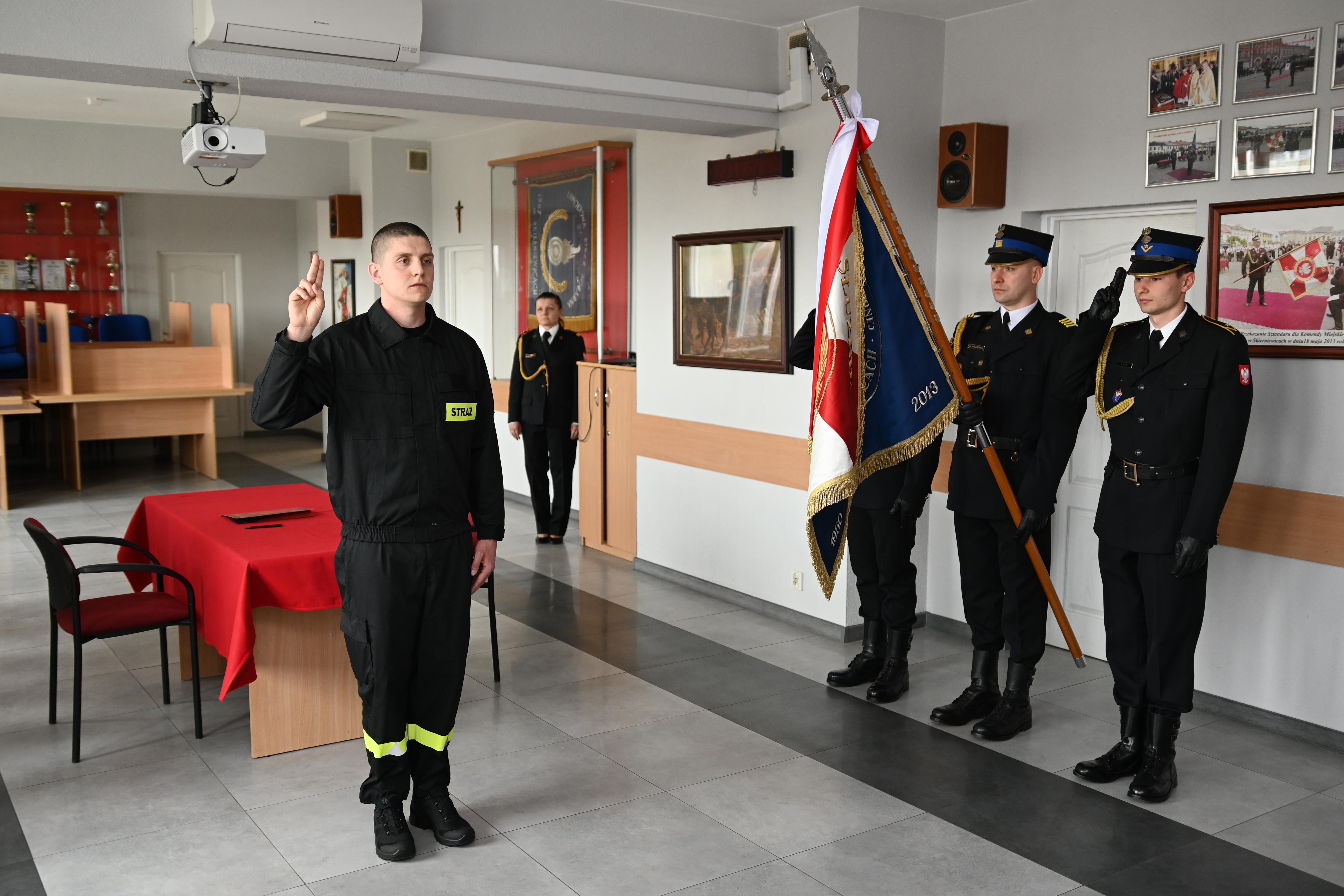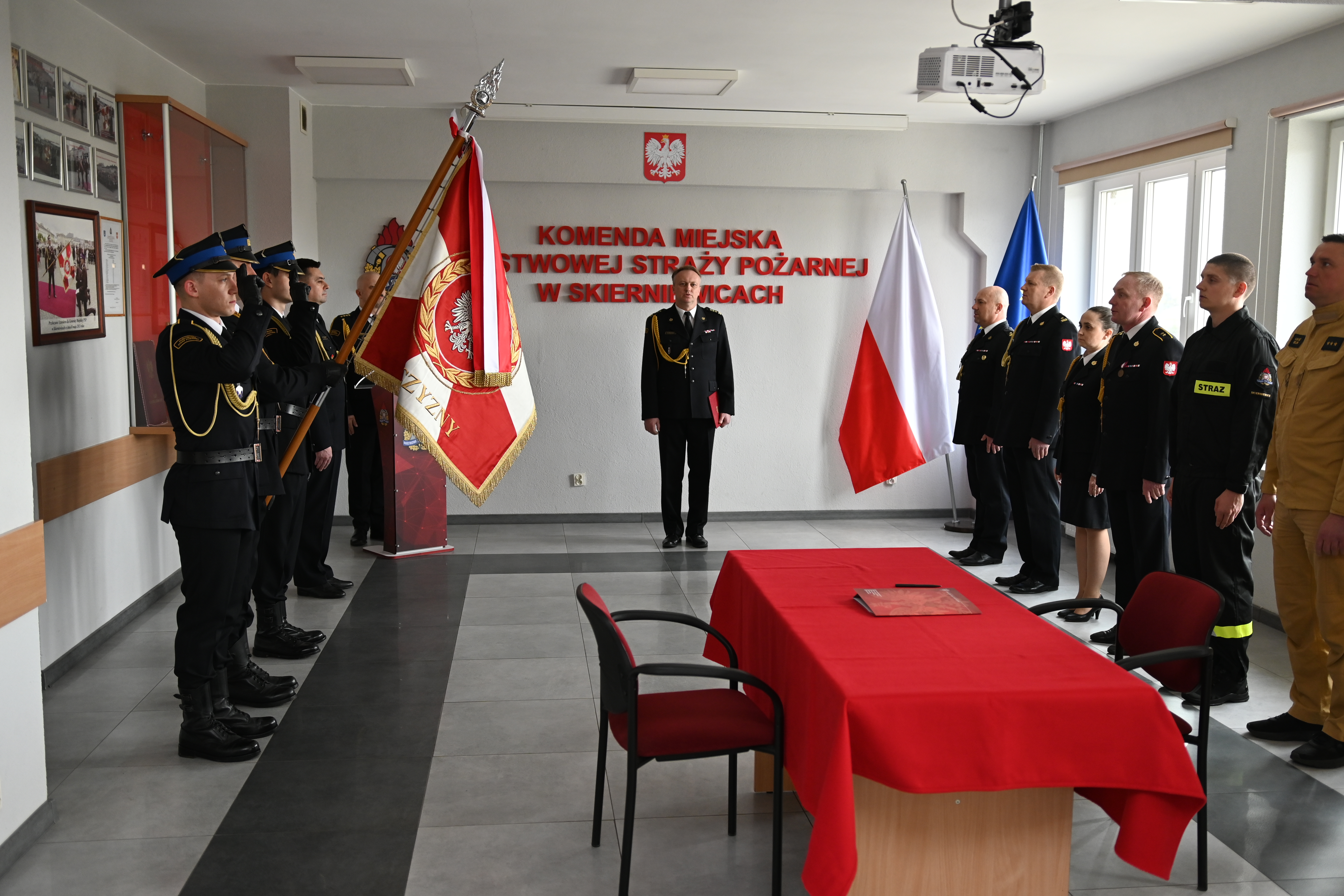 W dniu 17.03.2026 r. ślubowanie funkcjonariusza Państwowej Straży Pożarnej złożył Pan str. Michał Mitek. Pan Michał Mitek rozpoczął służbę przygotowawczą w Państwowej Straży Pożarnej na stanowisku stażysty na zmianie 3 w Jednostce Ratowniczo-Gaśniczej w dniu 16.03.2026 r. Uroczystość odbyła się w sali konferencyjnej komendy z udziałem funkcjonariuszy oraz kierownictwa Komendy. Uroczystość rozpoczęła się od złożenia meldunku Komendantowi Miejskiemu przez dowódcę uroczystości asp. sztab. Zbigniewa Sałka. Następnie Komendant Miejski Państwowej Straży Pożarnej w Skierniewicach st. bryg. Robert Gruchała zabrał głos.