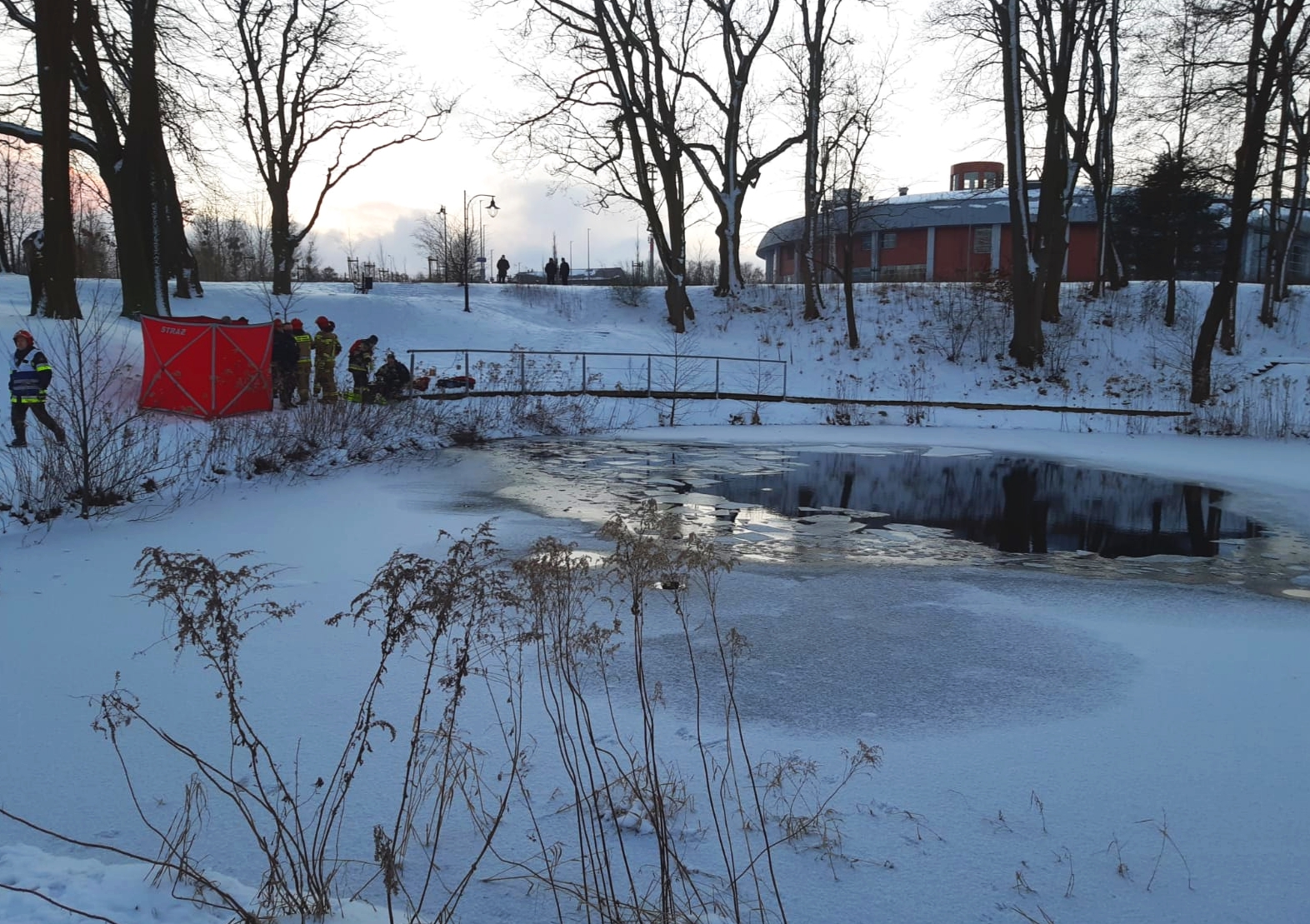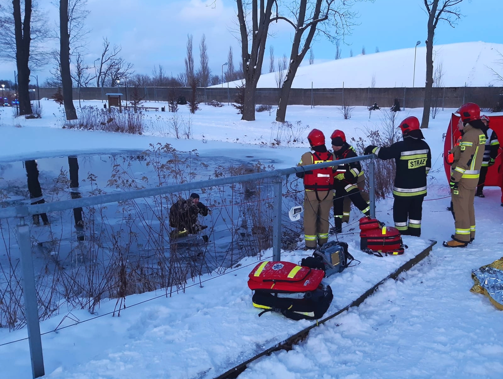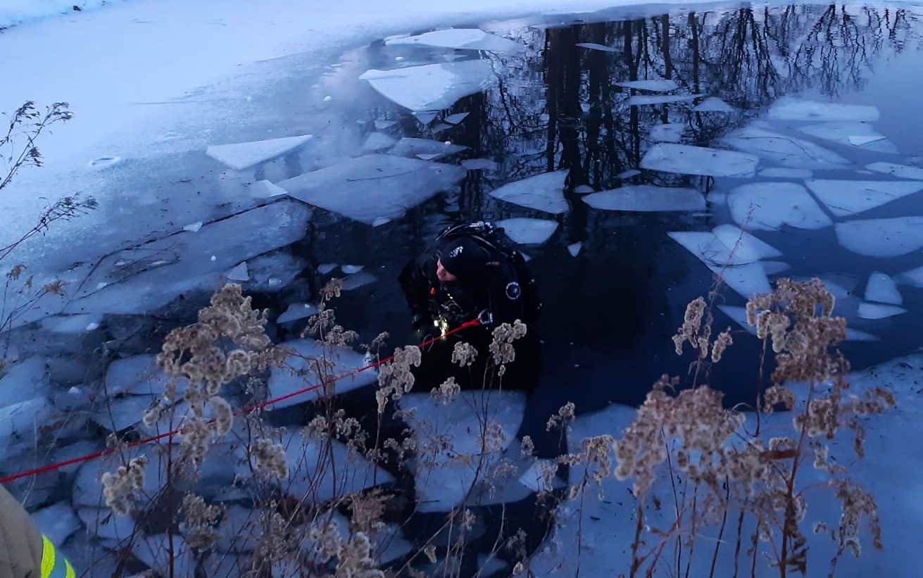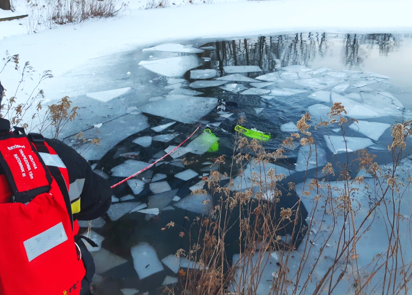 Do zdarzenia natychmiast zadysponowano 7 zastępów PSP. Po dojechaniu na miejsce stwierdzono, że staw jest tylko w części zamarznięty. Niestety osoba potrzebująca pomocy znajdowała się już pod powierzchnią wody. Poszukiwania rozpoczęli nurkowie ze Specjalistycznej Grupy Ratownictwa Wodno-Nurkowego „Ustka”. Niestety działania prowadzone w bardzo trudnych warunkach musiały zostać przerwane ze względu na zapadające ciemności i bardzo niską temperaturę zewnętrzną. Kierownik prac podwodnych podjął decyzję o wznowieniu poszukiwań w godzinach porannych dnia 7 lutego 2021 r. Okoliczności zdarzenia wyjaśniają pozostałe służby przybyłe na miejsce.