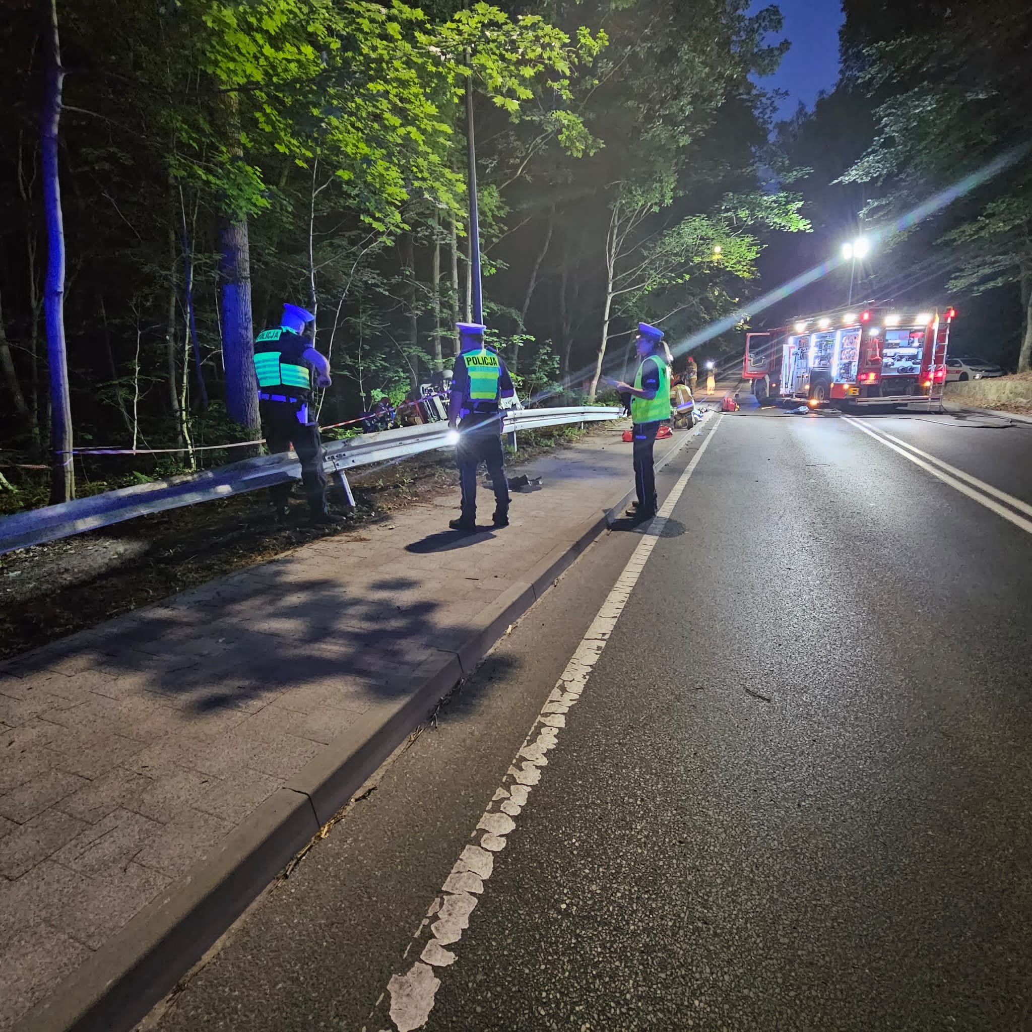 06.07.2025 r. około godziny 20.30 SKKM otrzymało zgłoszenie o wypadku samochodu osobowego w którym znajdują się dwie zakleszczone osoby. W wyniku odniesionych obrażeń kierujący poniósł śmierć na miejscu. Podróżująca z nim kobieta została wydobyta z pojazdu i przetransportowana do szpitala . W akcji ratowniczej zaangażowanych były 3 zastępy PSP 4 radiowozy Policji 2 zespoły ZRM. Działania trwały 3 godz. 51 min.
